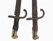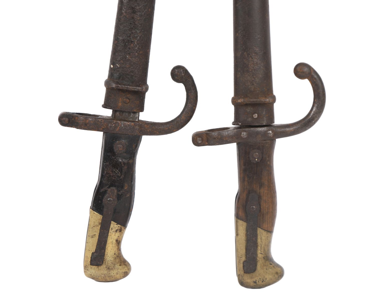 A matched pair of 19th-century sword bayonets, each with long straight blade, iron crossguard and ribbed grip, one retaining remnants of scabbard fittings.