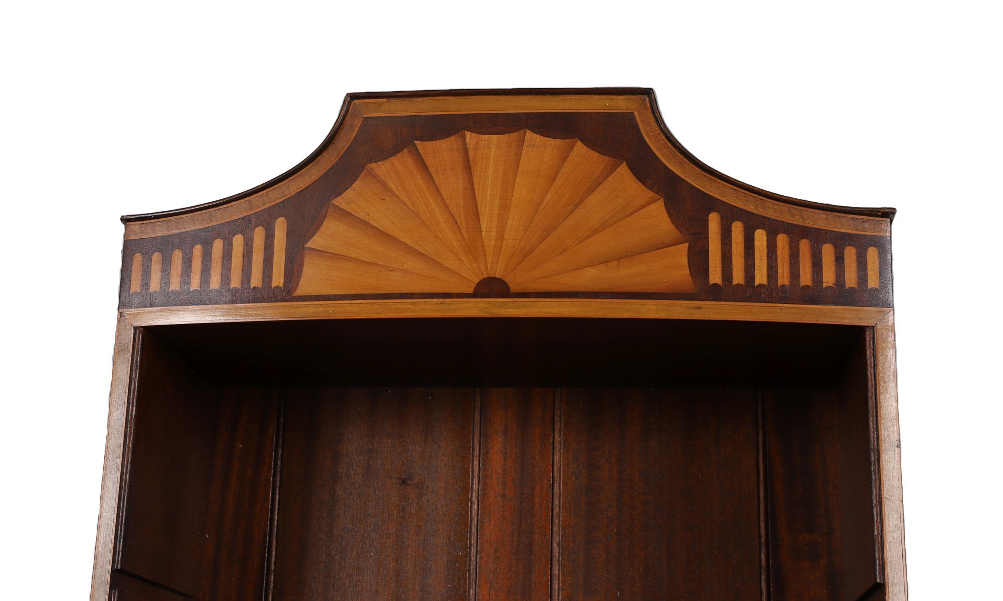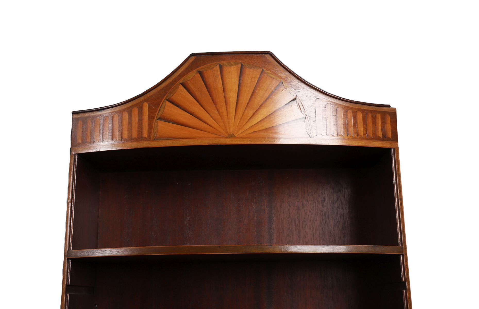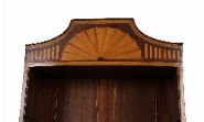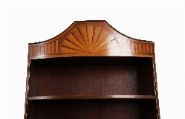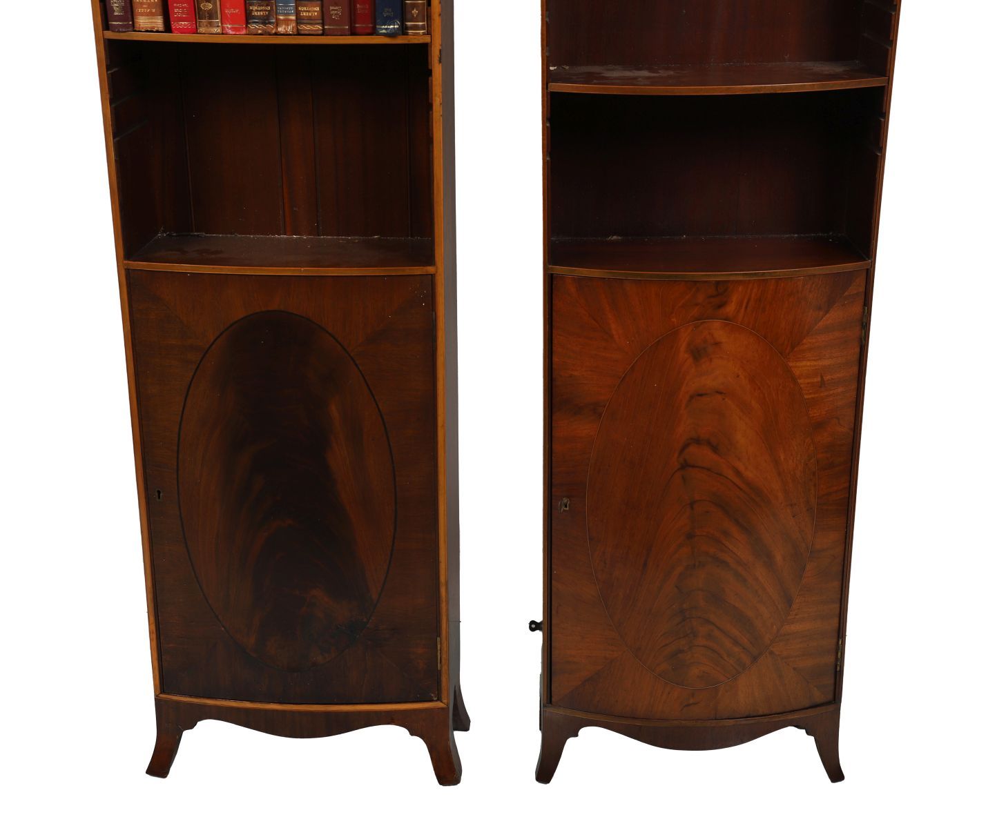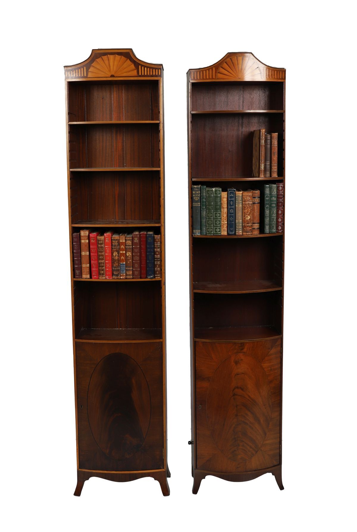 A fine matched pair of Edwardian mahogany and satinwood inlaid tall corner bookcases, each with arched fan inlaid pediment, adjustable shelves, and a lower panelled door with oval satinwood inlay.