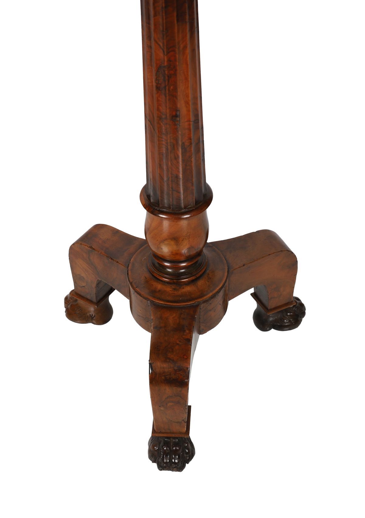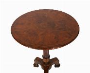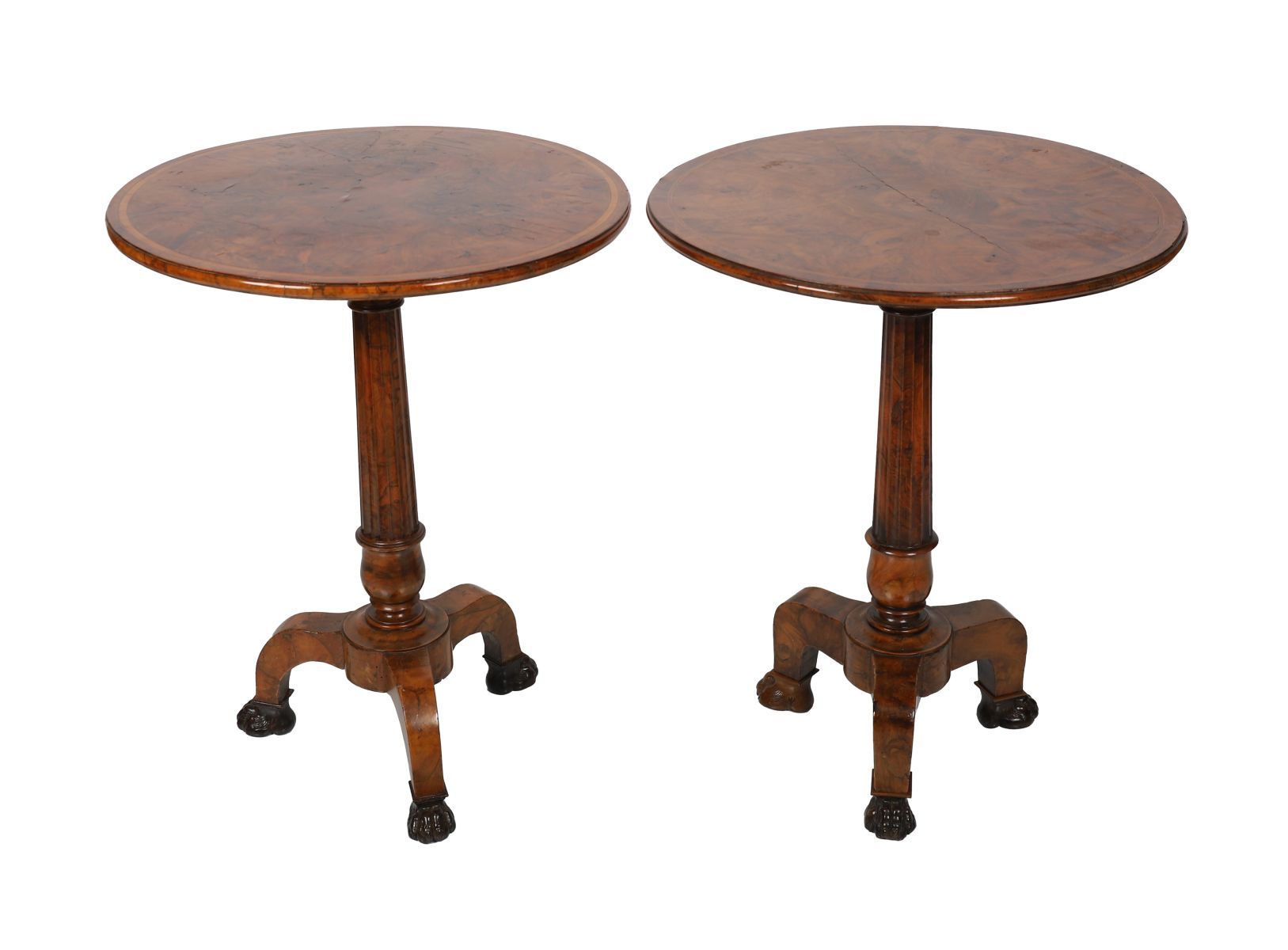 A matched pair of William IV burr walnut side tables, each with circular top on a turned column support and triform base with carved paw feet.
