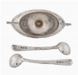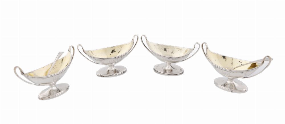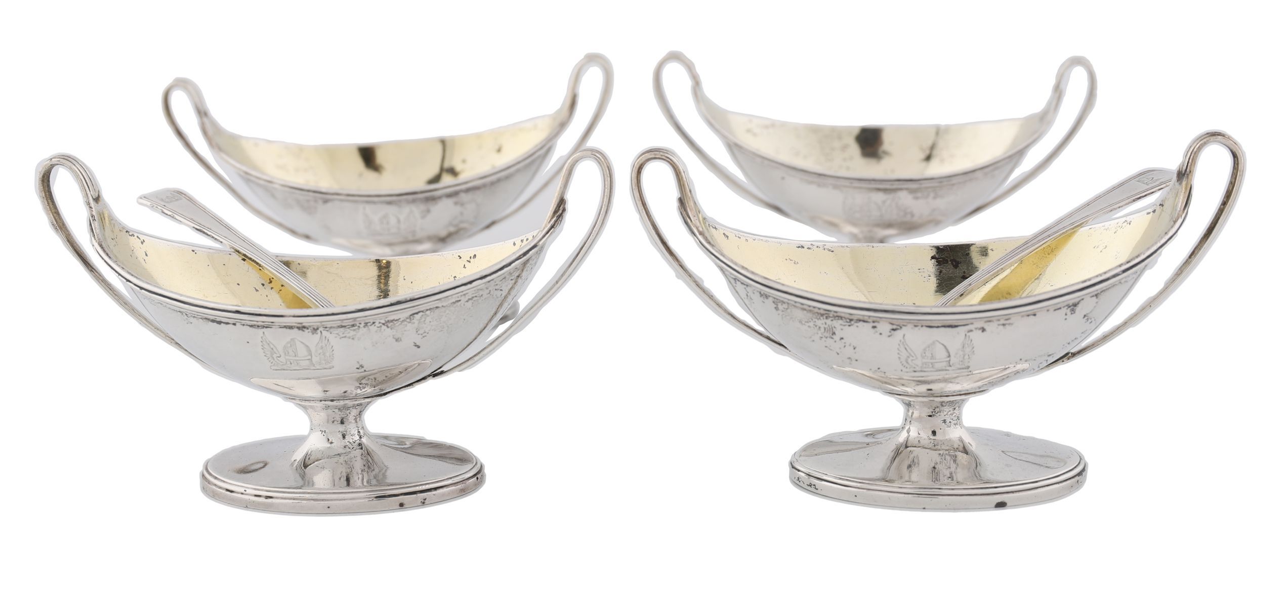 A matched set of four George III silver salt cellars, one by Thomas Johnson, London, 1810; three by Abraham Peterson and Peter Podio, London, 1788. Each of oval form with reeded loop handles on raised oval bases, engraved with a crest, together with two silver salt spoons. total weight approx. 455 g (16 oz)