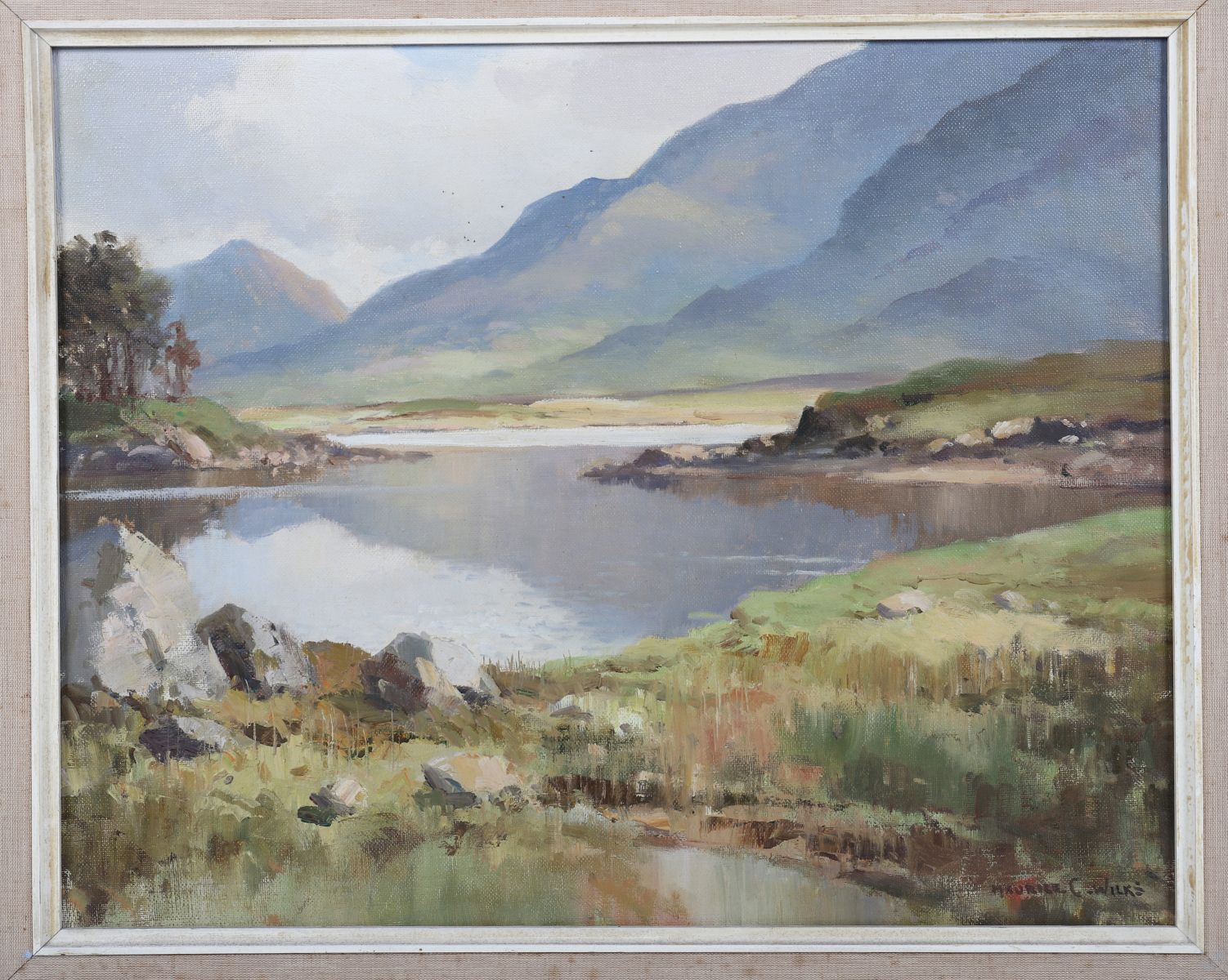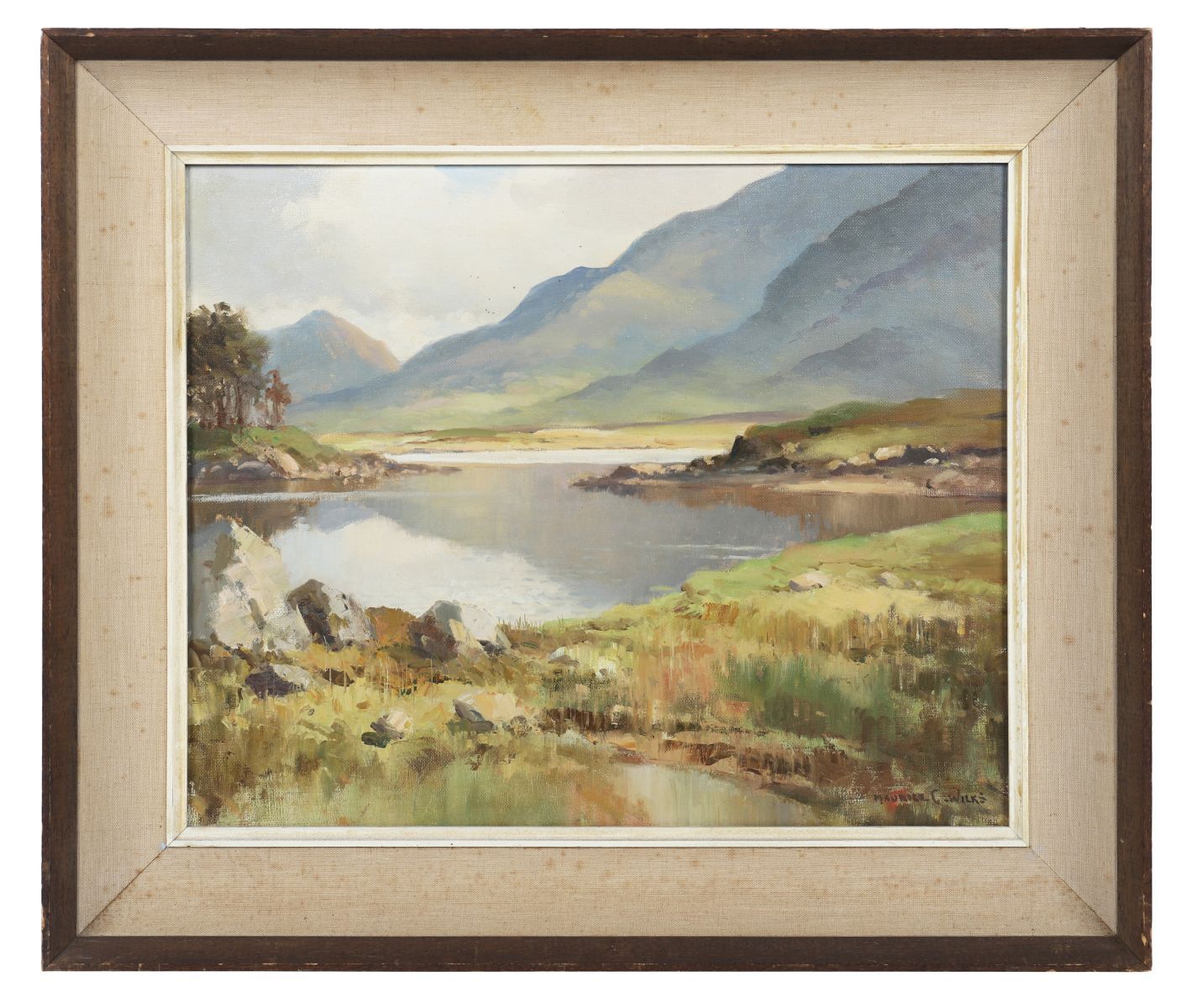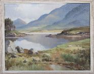 A finely executed Irish landscape depicting a tranquil Connemara valley with mountains beyond. Wilks’ masterful treatment of tone and atmosphere captures the serenity of the western landscape under soft light.