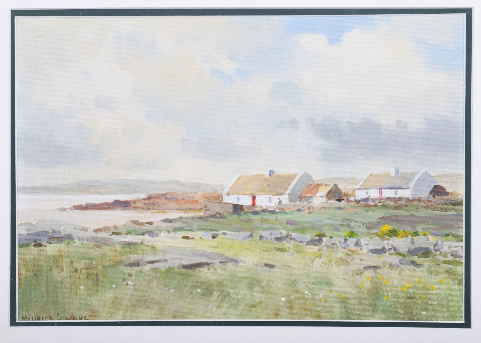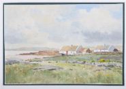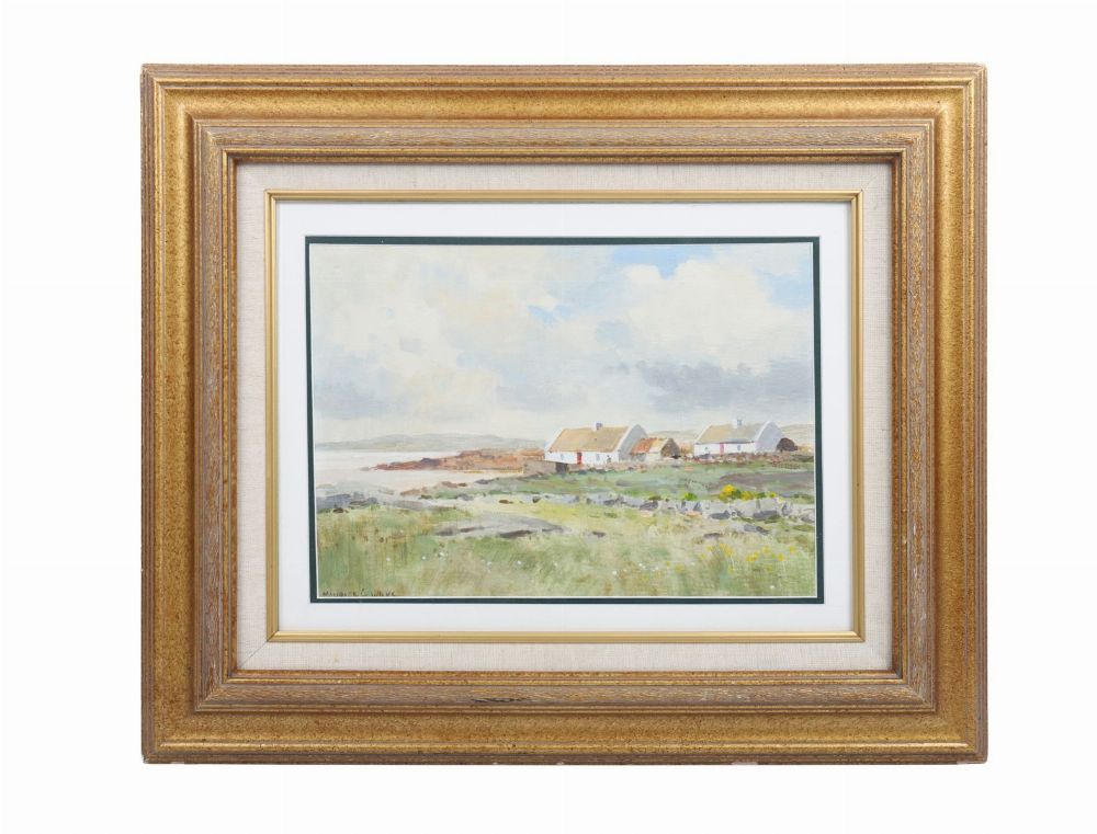 A Connemara scene, oil on canvas board, depicting traditional thatched cottages beneath a wide, windswept sky. Signed lower left and presented in a gilt frame.