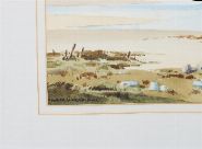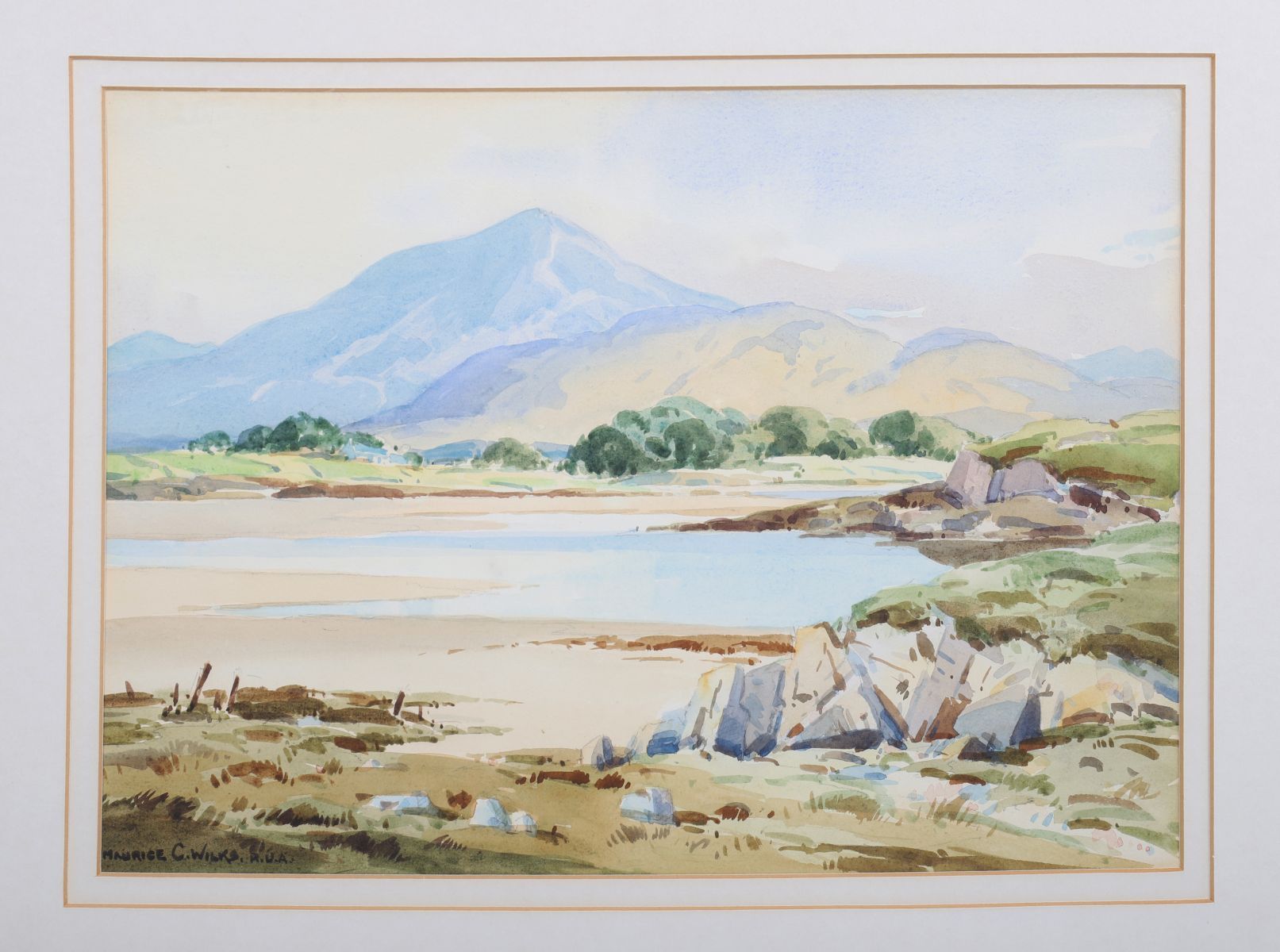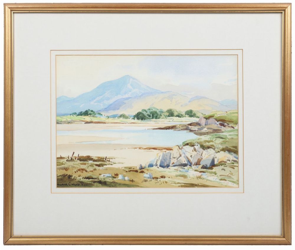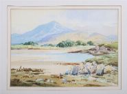 Depicting a broad expanse of coastline beneath a blue mountain range. Characteristic of Wilks’s finely detailed Irish landscapes.