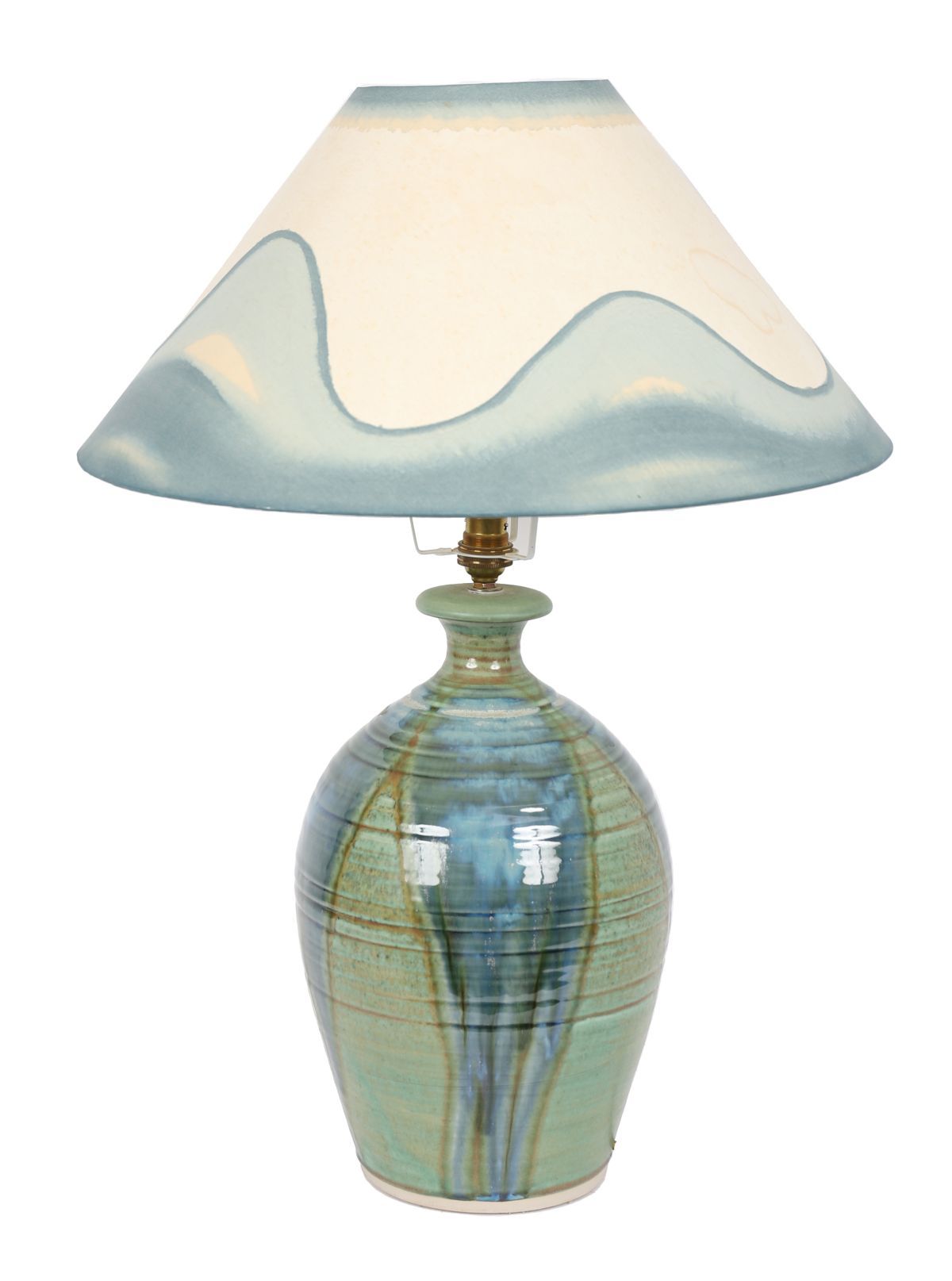 A studio pottery table lamp by Maurice Mulcahy, of baluster form with green and teal flowing glaze, fitted with brass mount, complete with matching glazed ceramic shade. Irish studio pottery, late 20th century.