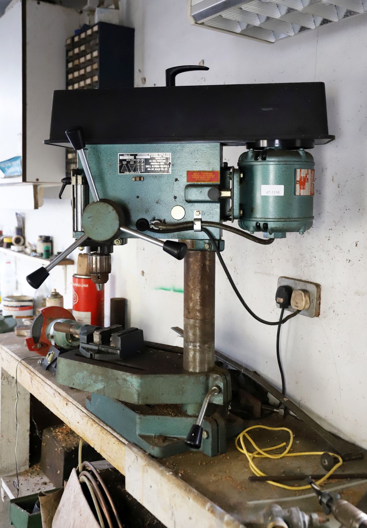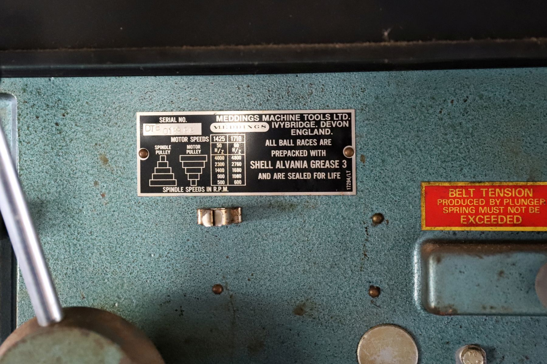 A Meddings bench-mounted pillar drill, the cast metal head stamped “Meddings, Ivybridge, England,†with adjustable table, three-spoke feed handle and column-mounted base, suitable for workshop or garage use.