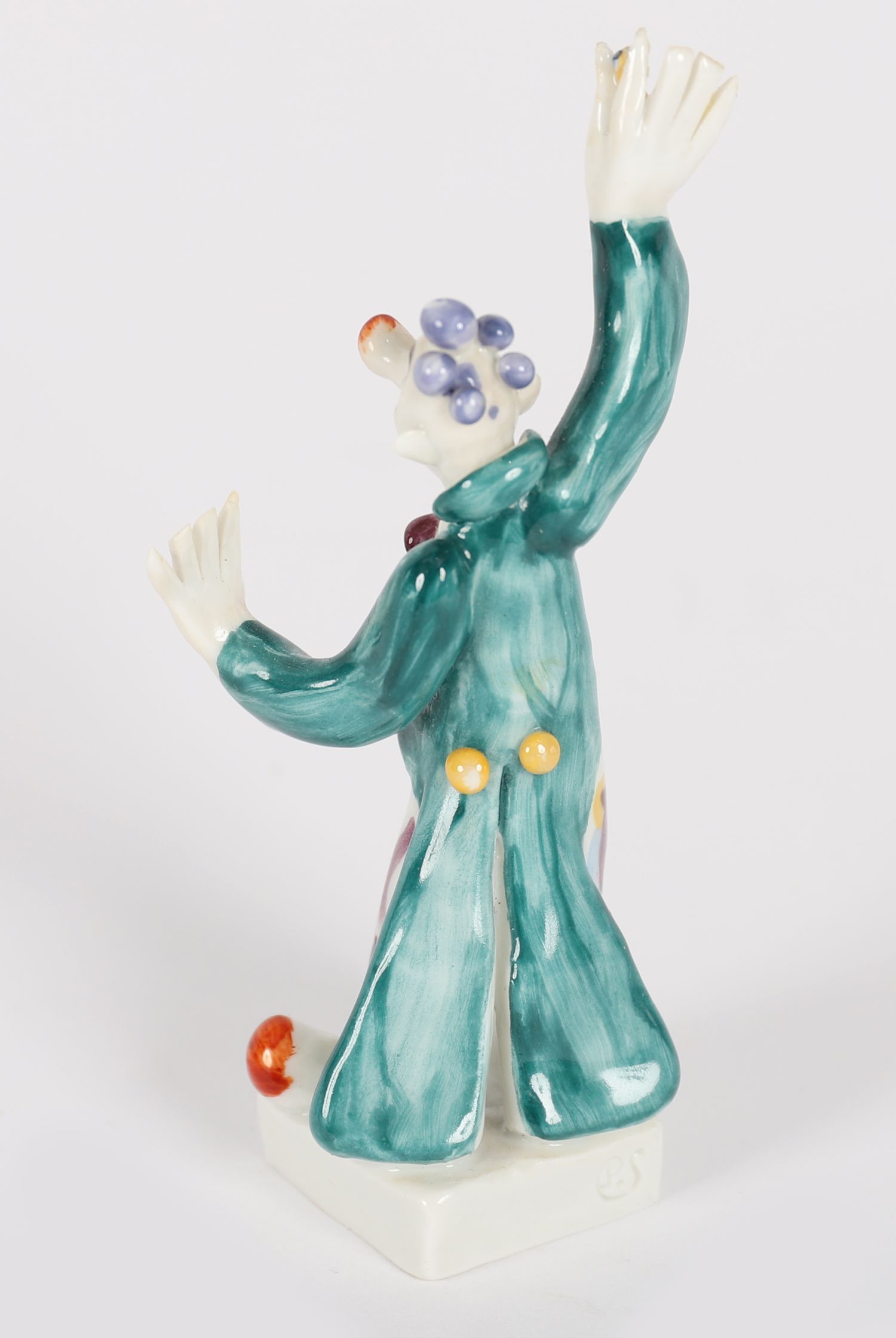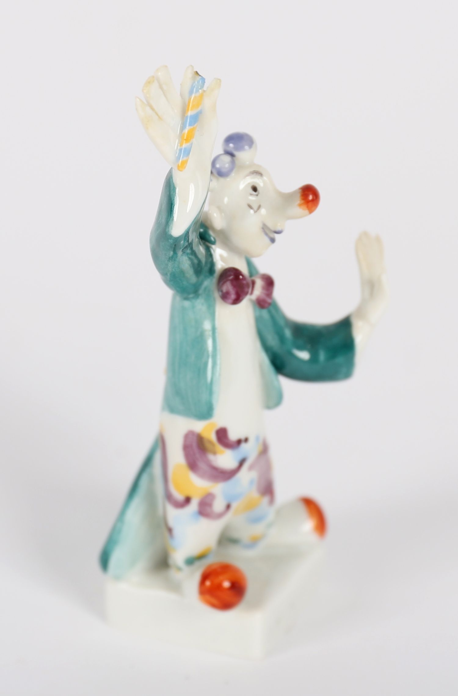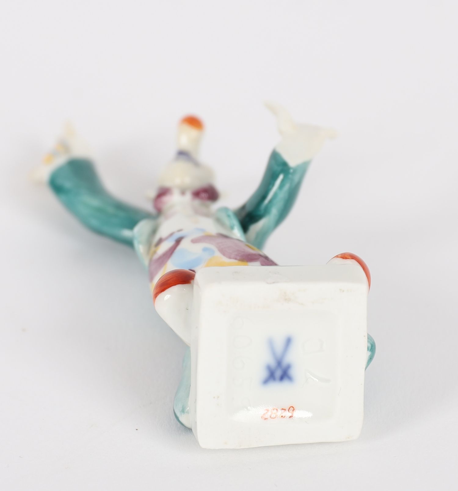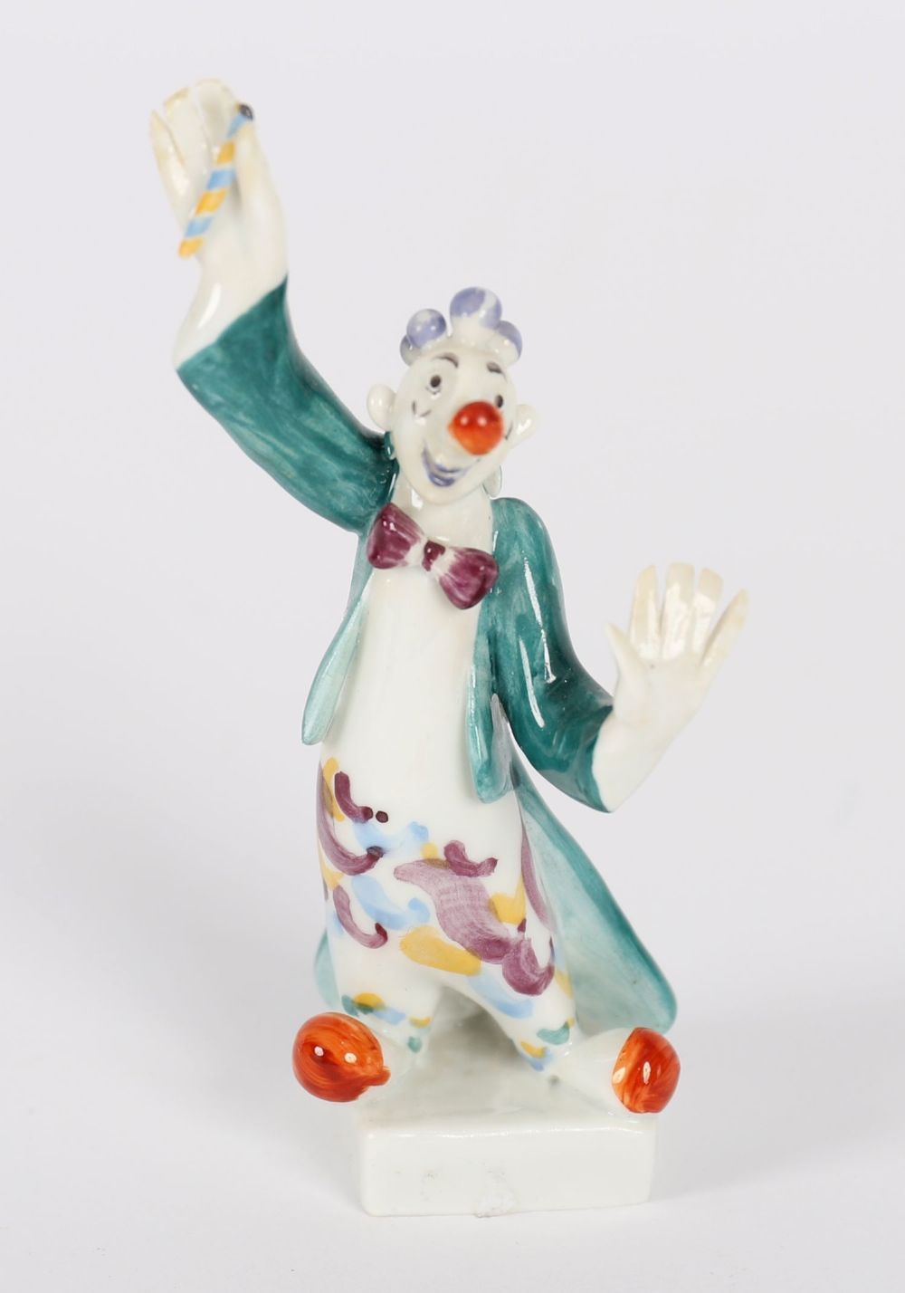 A hand-painted porcelain figurine of a clown, modelled standing with arms raised and detailed costume. Marked to the base with underglaze blue crossed swords and red number 2829, in the manner of Meissen. Likely mid-20th century.