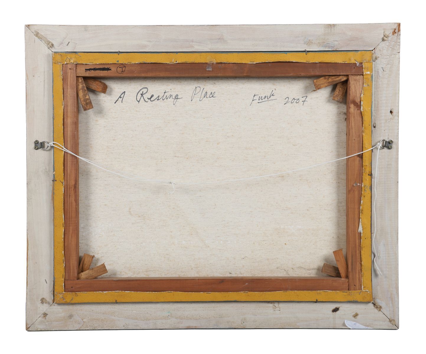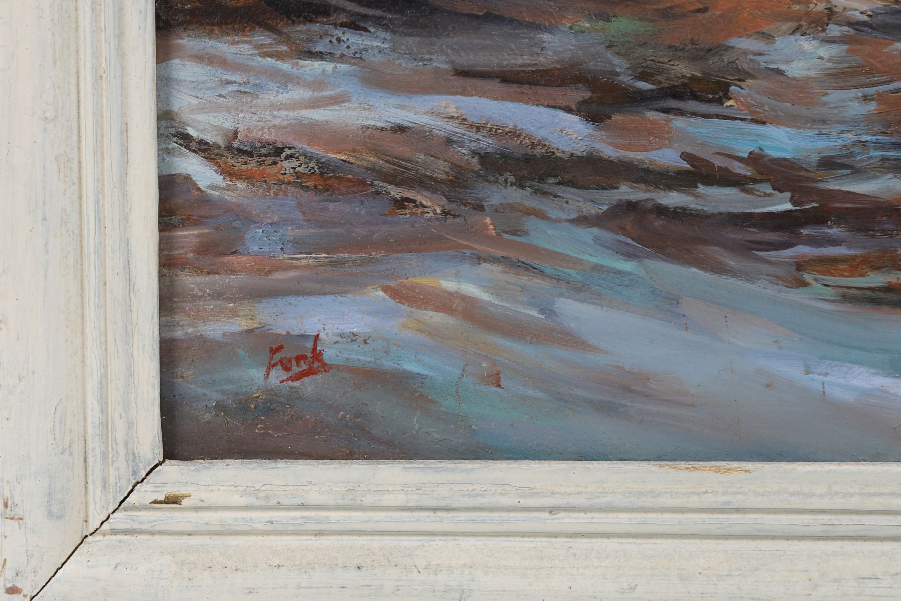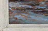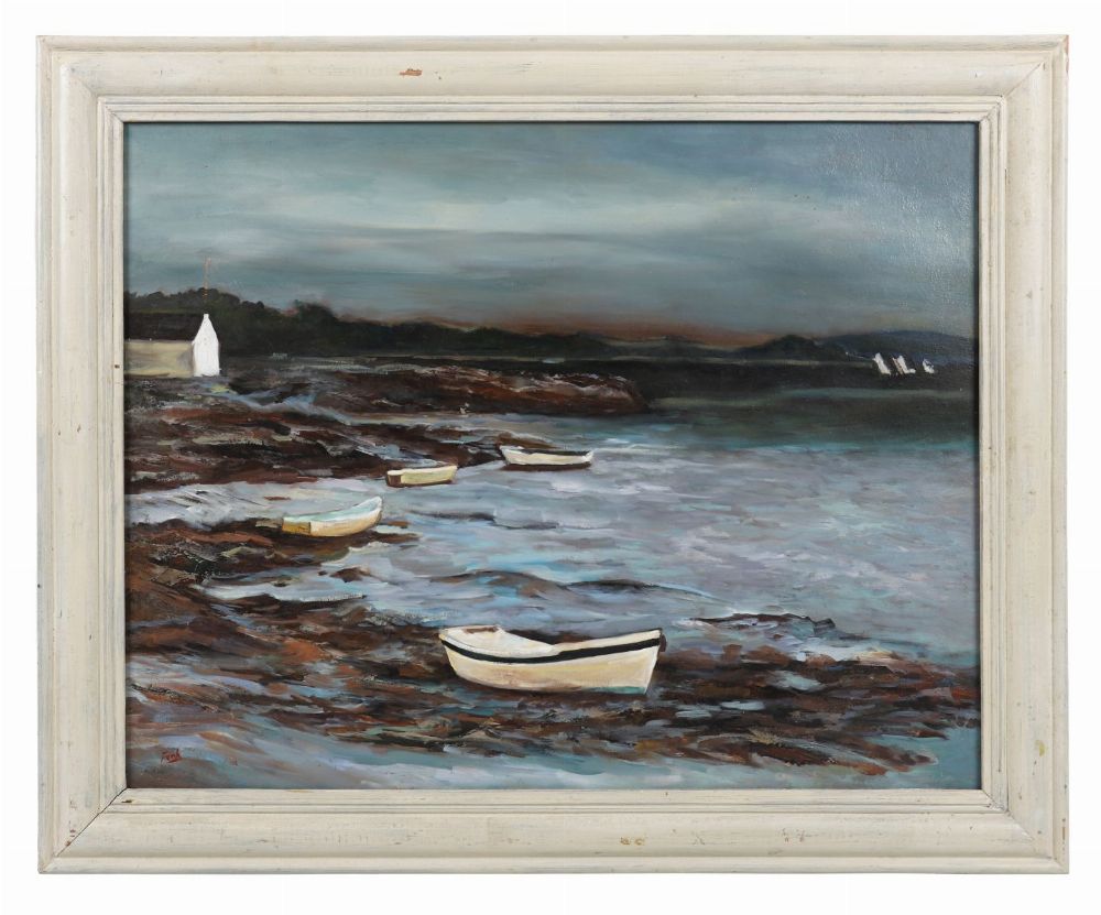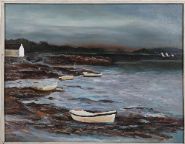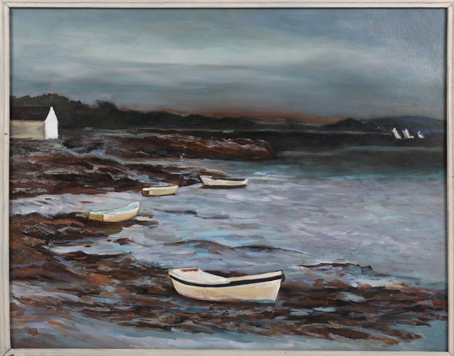 An atmospheric coastal composition featuring moored currachs along the western Irish shoreline beneath a brooding sky. Funk’s layered brushwork and subdued palette evoke both the solitude and lyrical beauty of the Atlantic landscape.