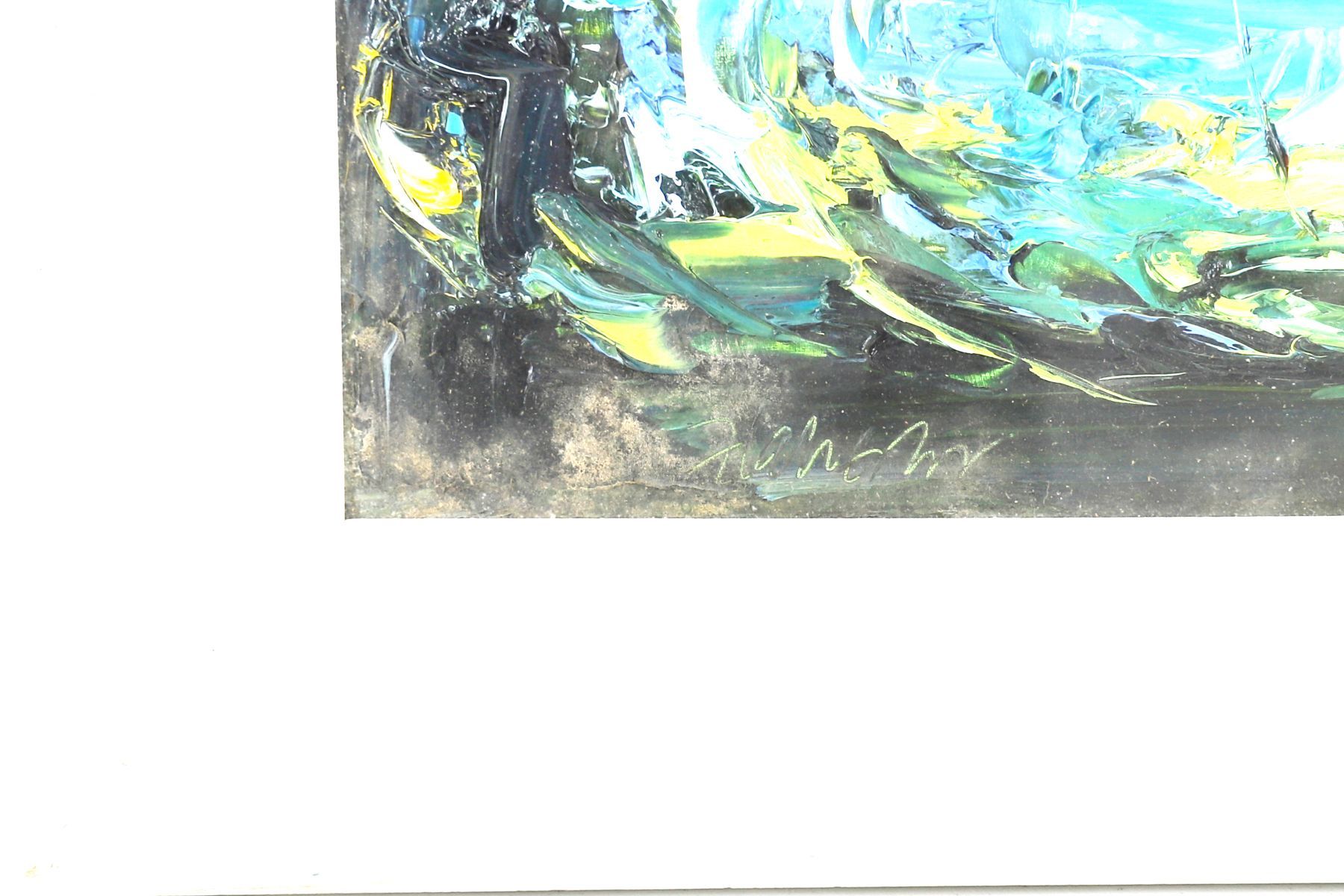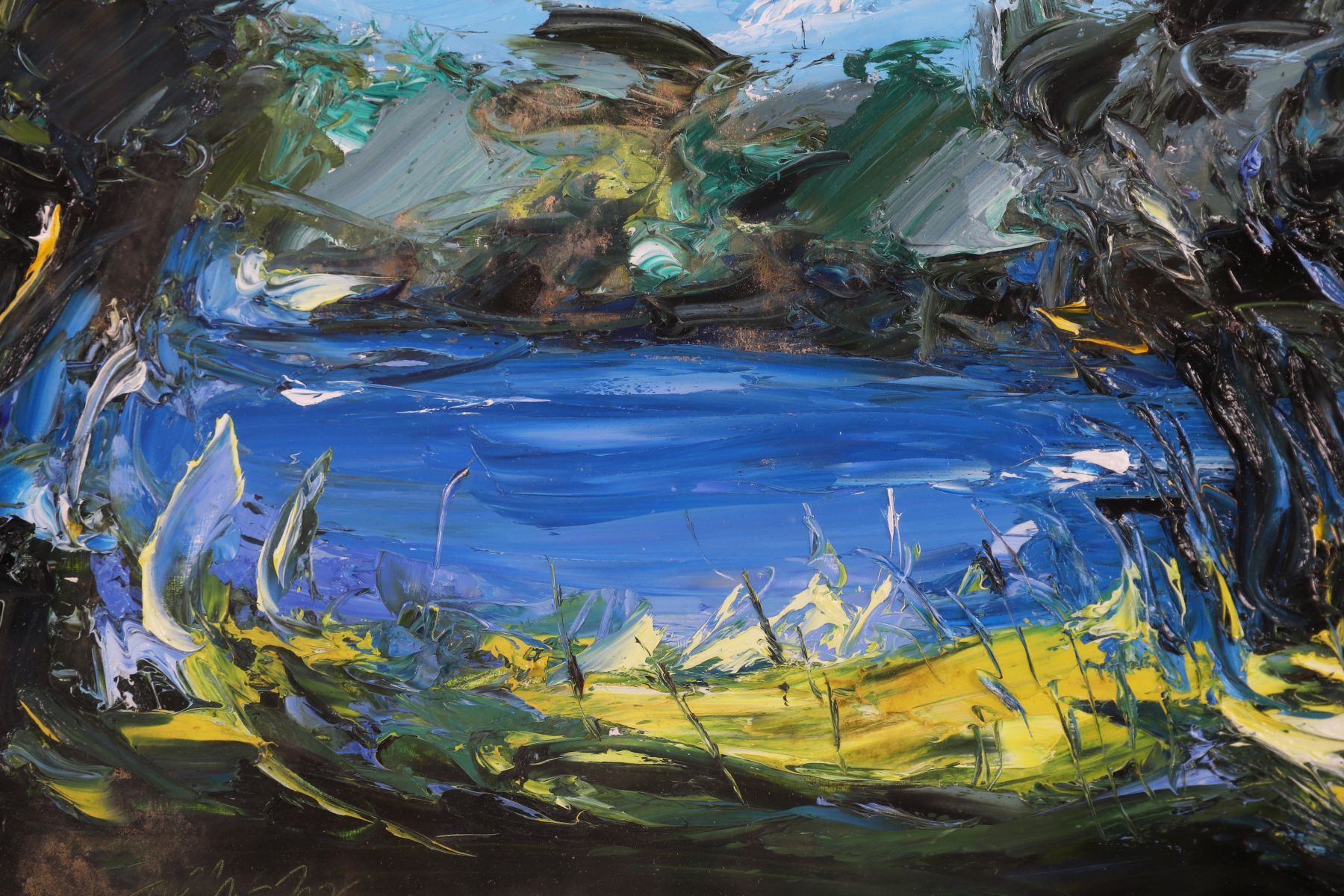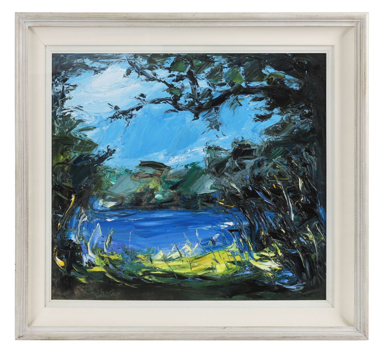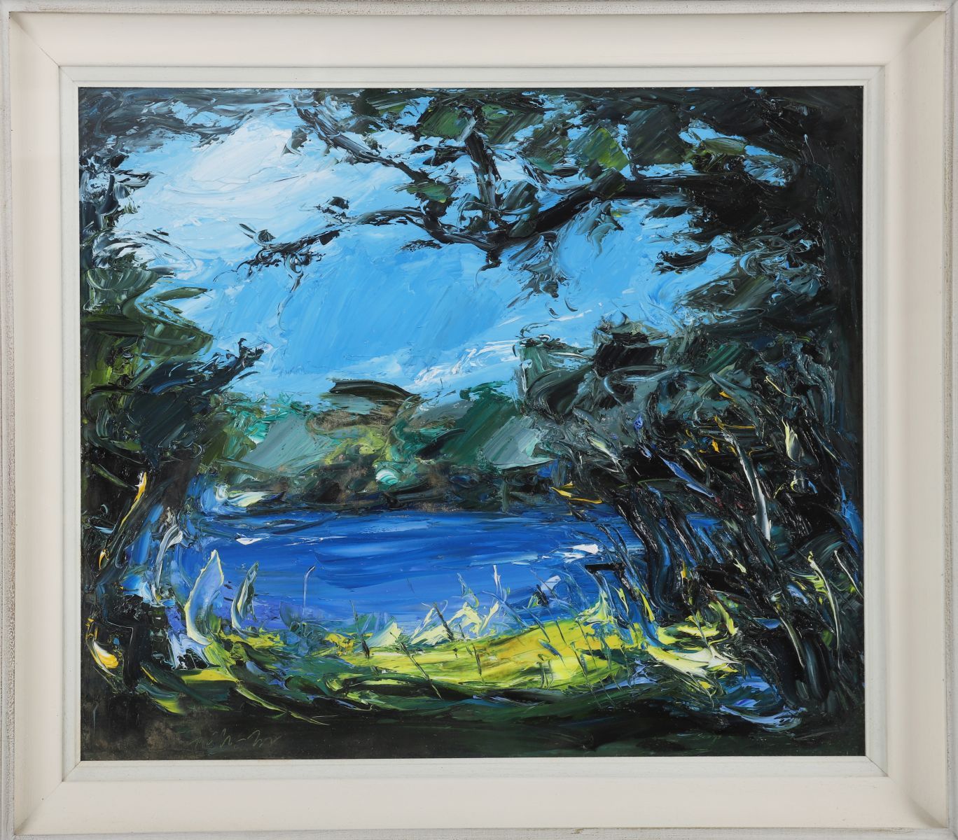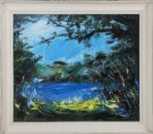 An expressive acrylic on board depicting a lakeside view seen through dense foliage. Painted with vigorous palette-knife work and bold impasto, the composition features rich blues, greens and yellows, capturing movement and light across water and trees. Signed lower left and framed in a cream moulded frame.