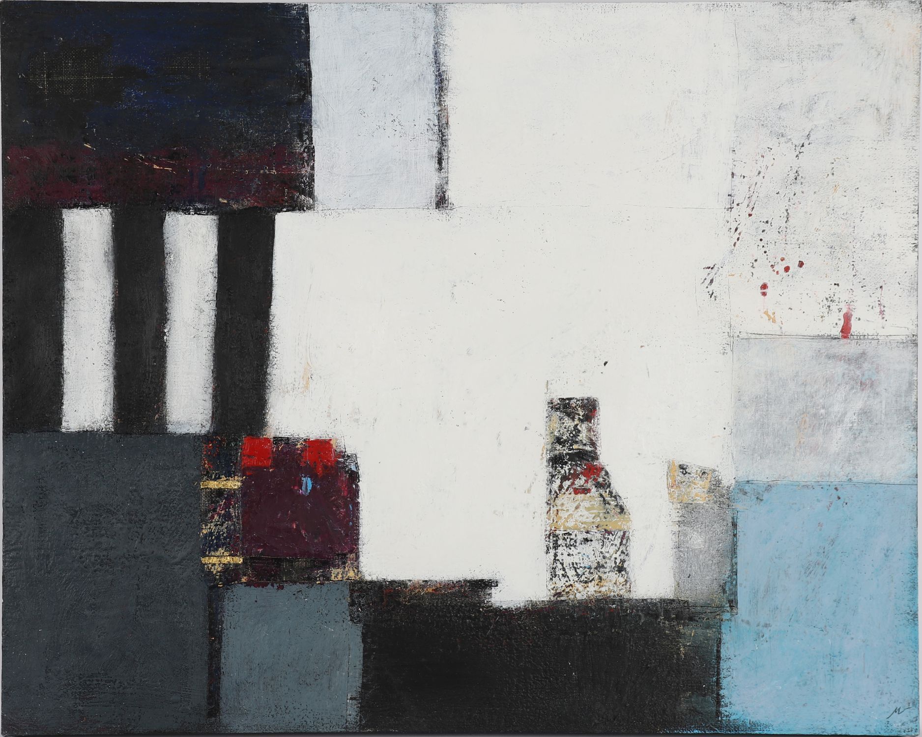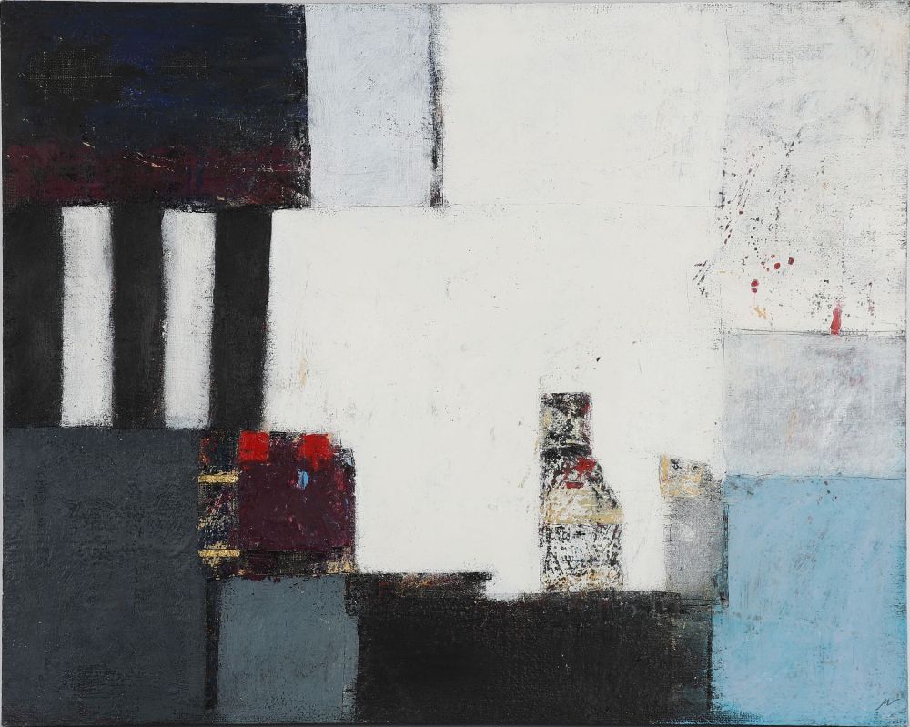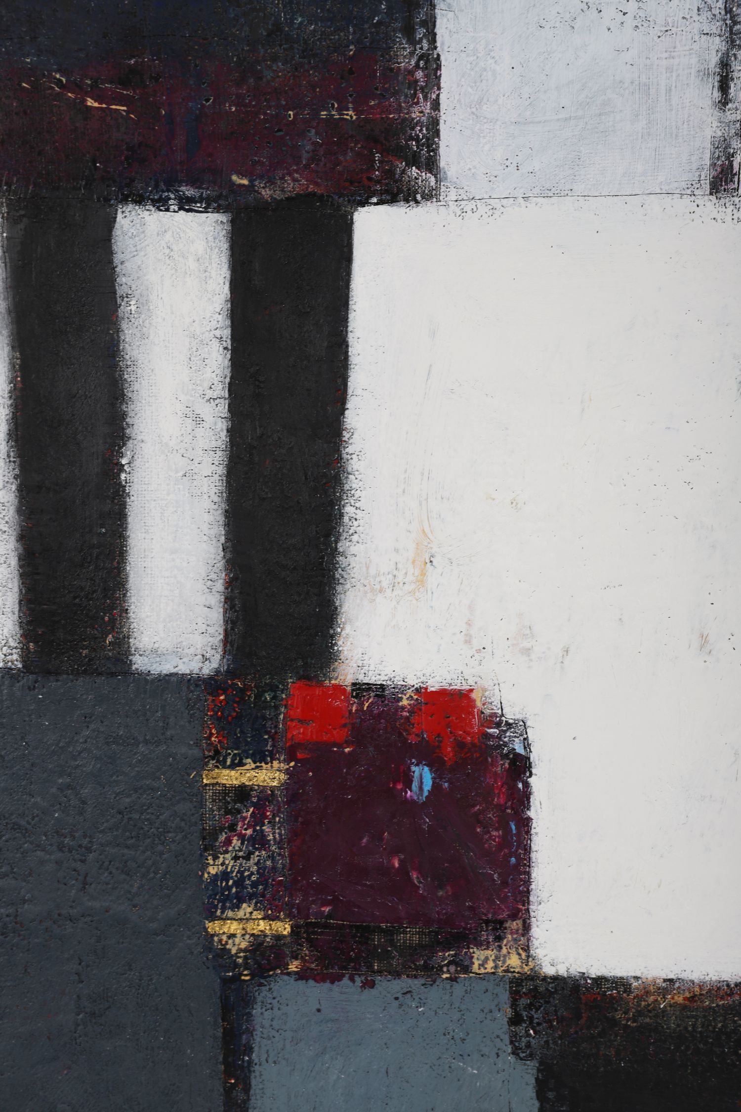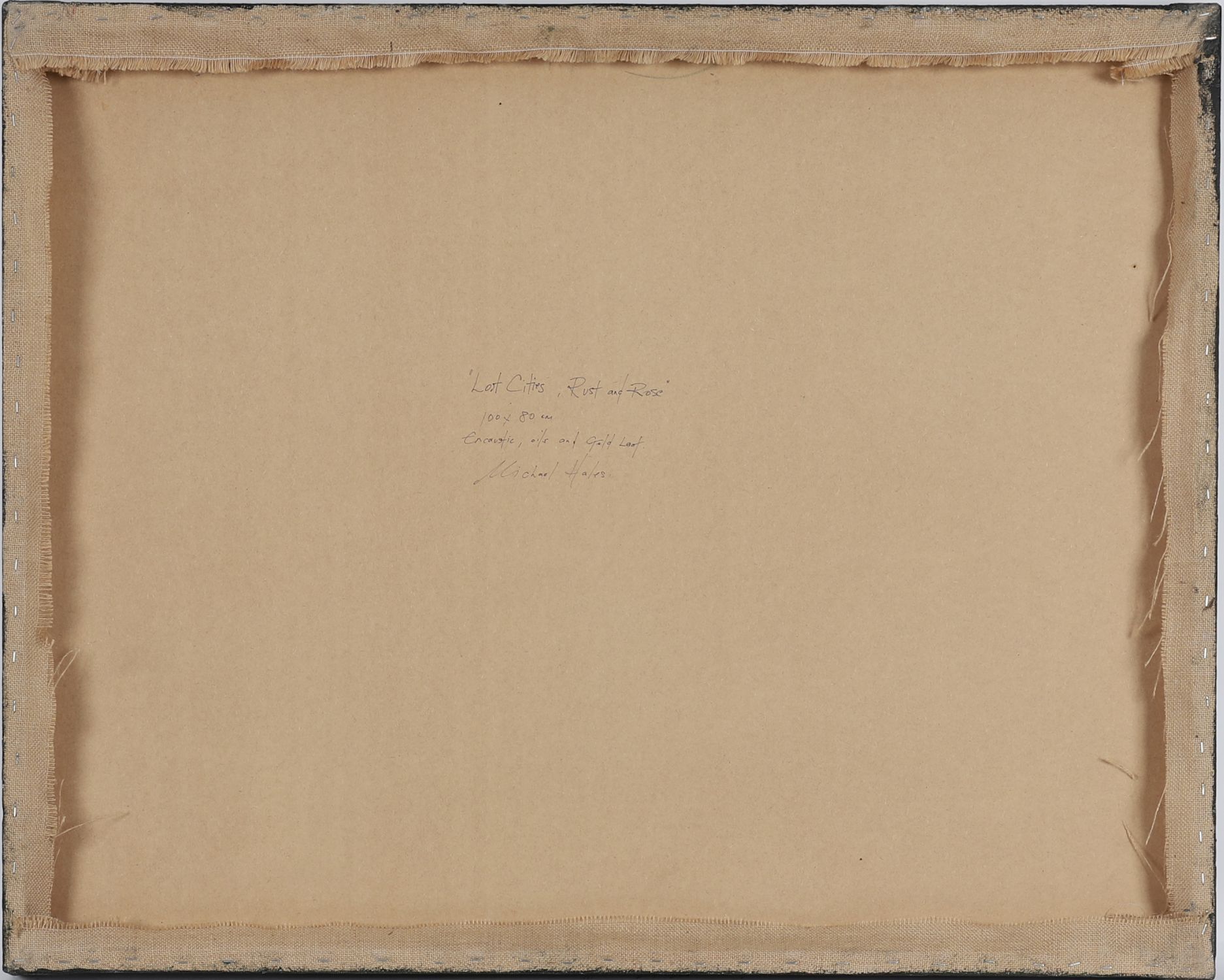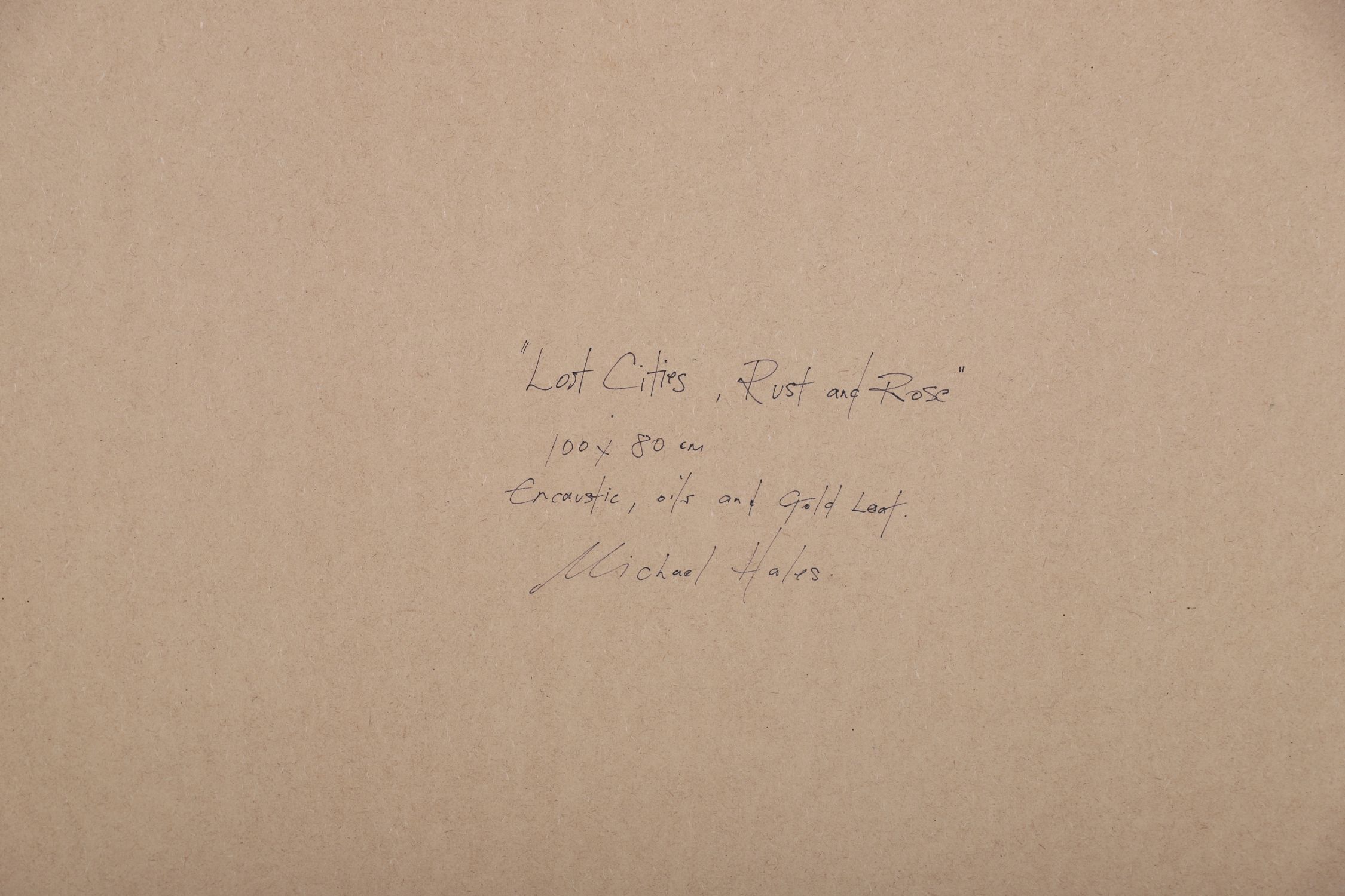An abstract mixed-media painting composed with encaustic, oils, and gold leaf. Geometric sections in pale and dark tones evoke urban ruins and floral forms. Signed bottom right