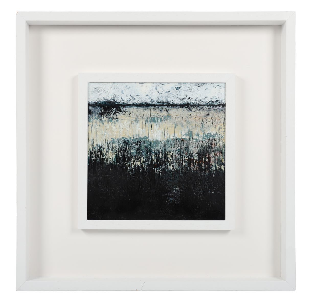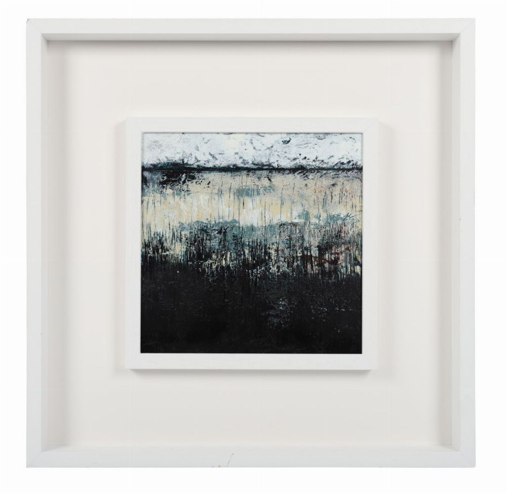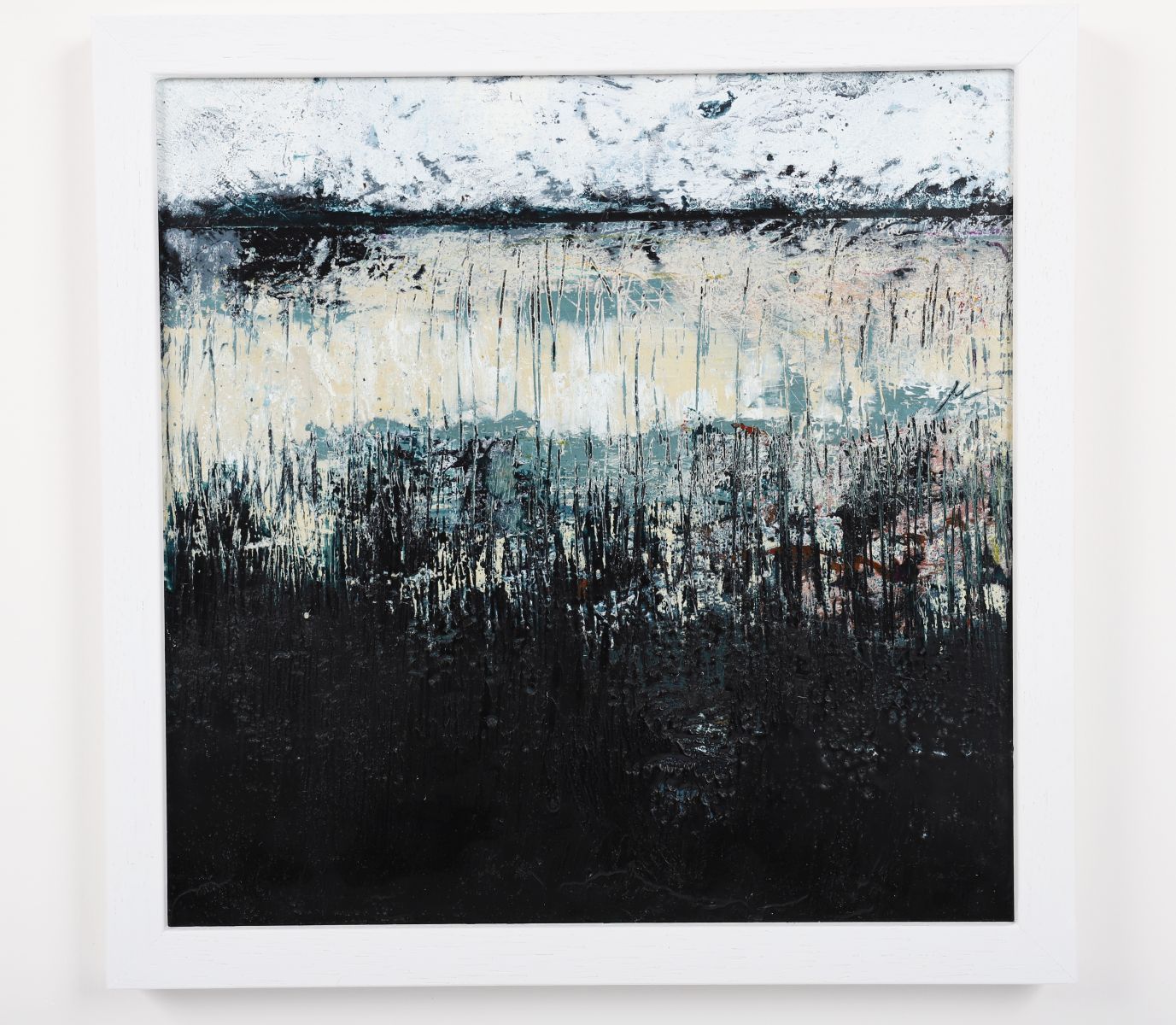 A moody abstracted landscape executed in layered encaustic and oil, with dark tonal fields and subtle highlights evoking depth and horizon. The surface texture is richly worked, emphasising Hales’ tactile approach to painting.