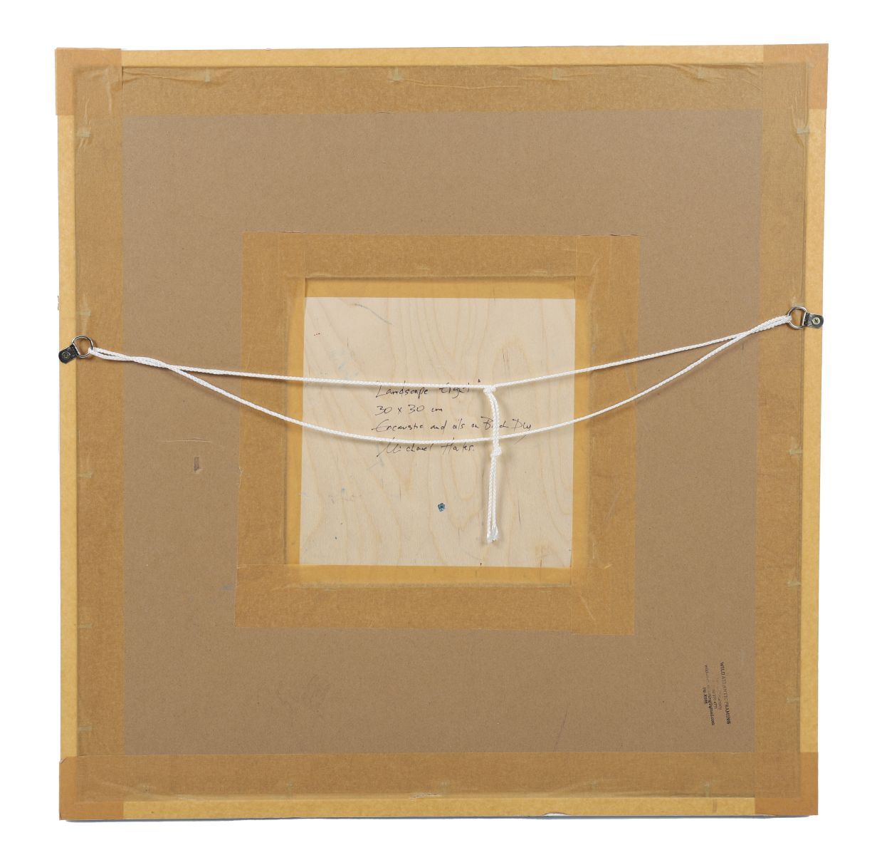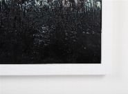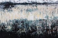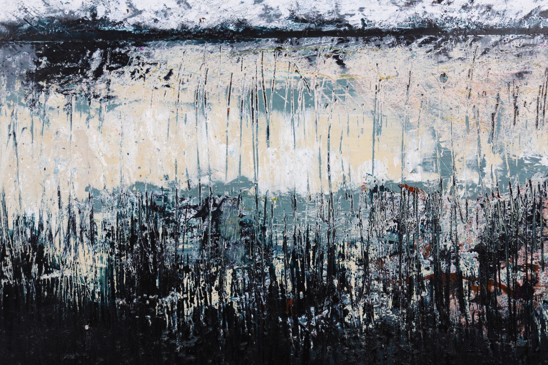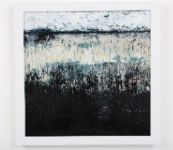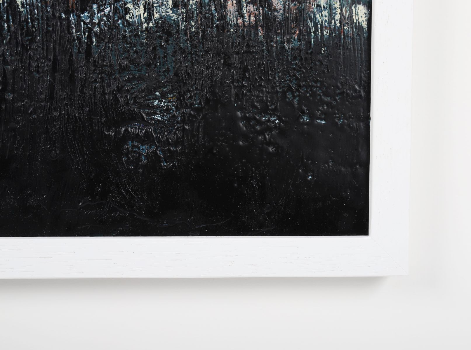 A moody abstracted landscape executed in layered encaustic and oil, with dark tonal fields and subtle highlights evoking depth and horizon. The surface texture is richly worked, emphasising Hales’ tactile approach to painting.