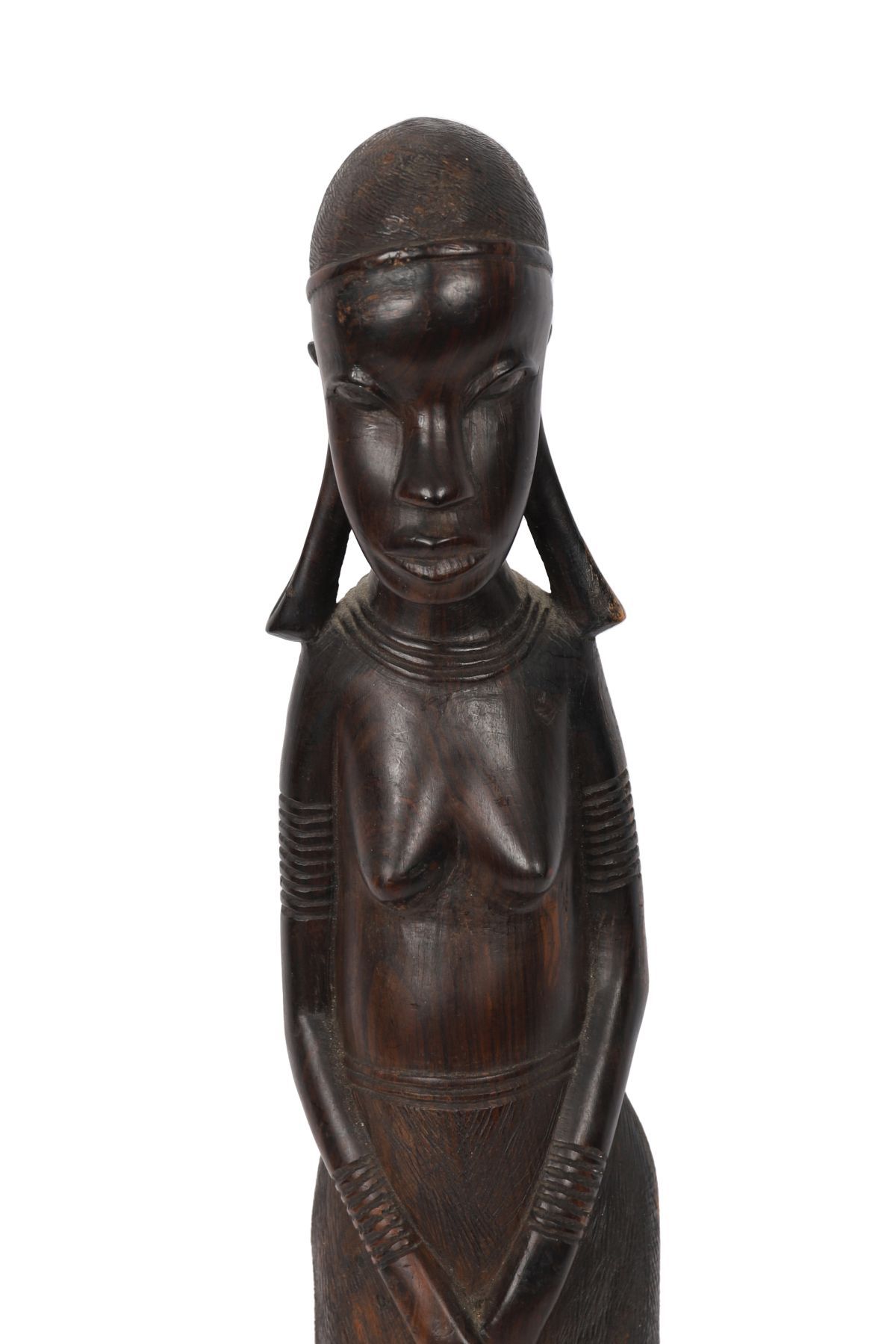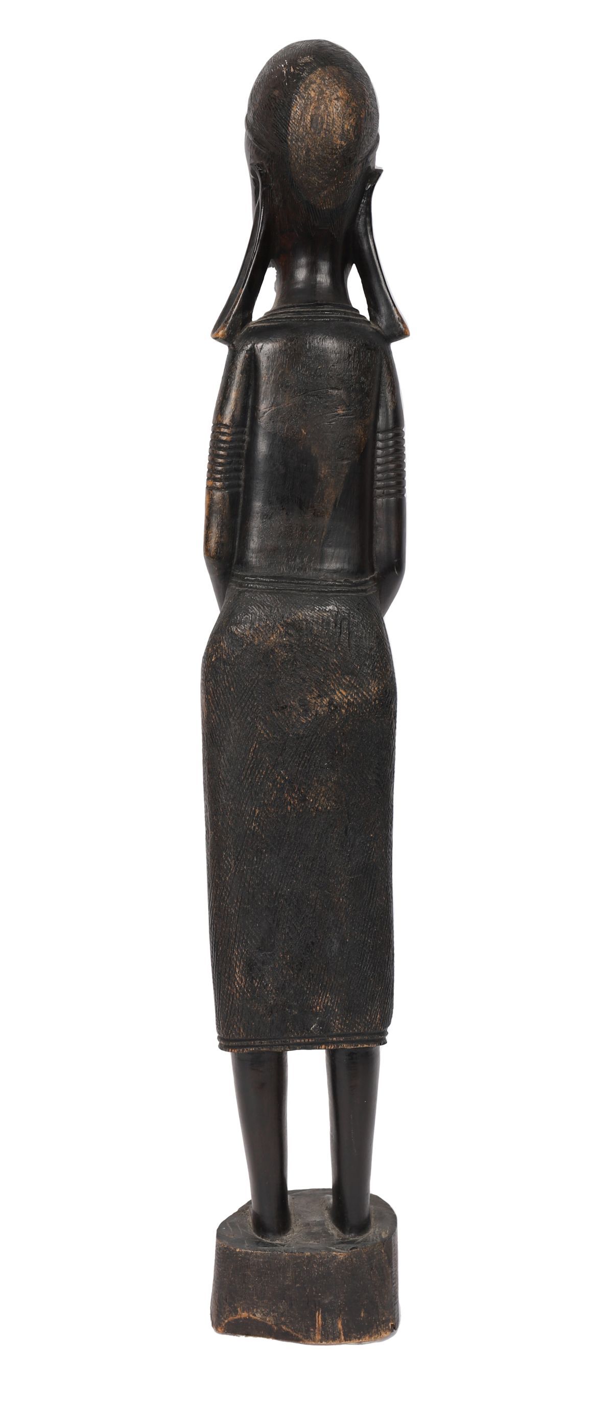 A carved hardwood standing female figure of elongated form with stylised facial features, incised neck and arm banding, hands clasped before the body, raised on an integral circular base, dark patinated surface.