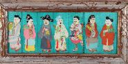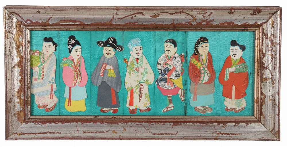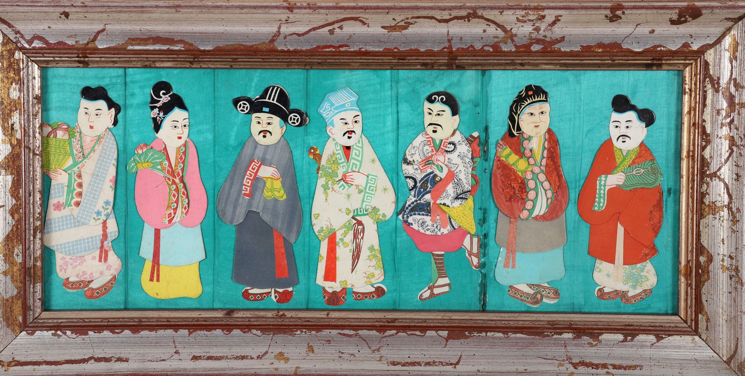 A rectangular Chinese panel depicting seven standing figures in traditional costume, worked in applied fabric and textile elements against a turquoise ground, mounted in a distressed frame
