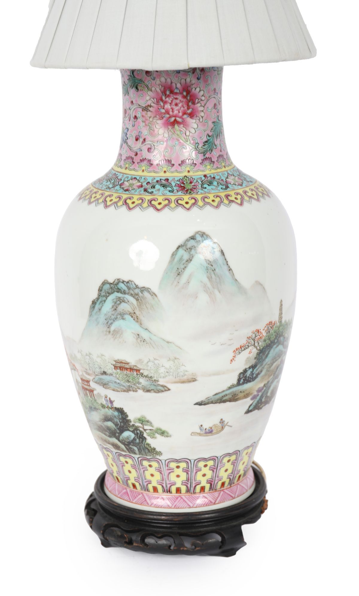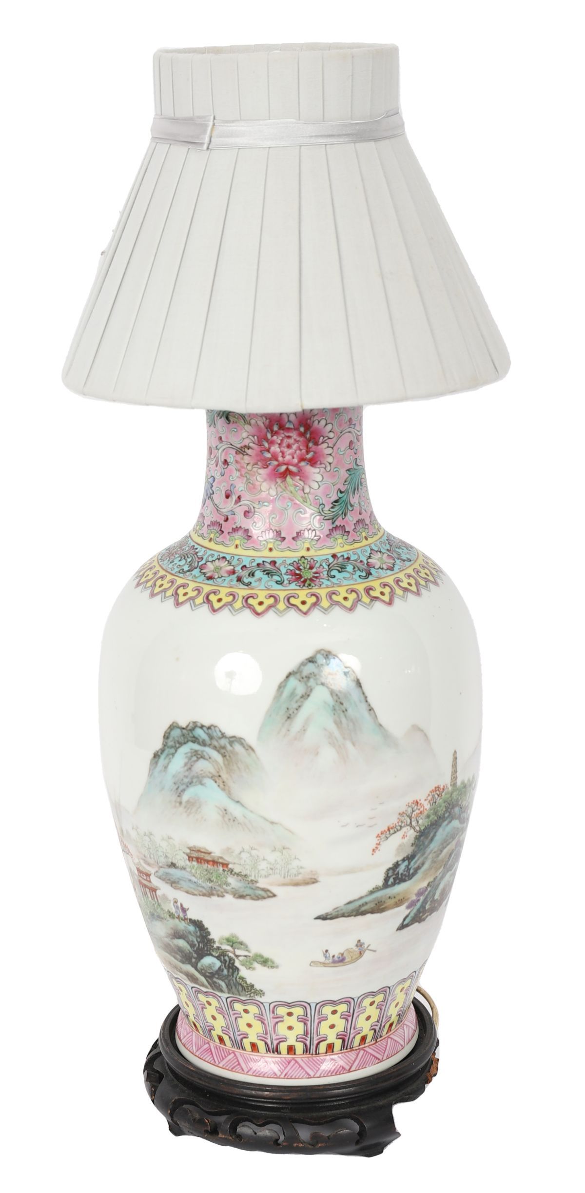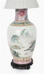 A Chinese porcelain landscape vase later converted for use as a table lamp, decorated with mountainous river scenes beneath a brightly coloured ornamental collar. Raised on a hardwood stand and fitted for electricity.
