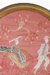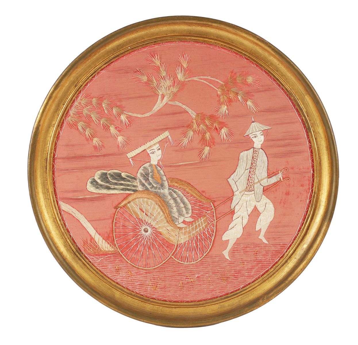 A circular silk embroidered panel depicting a rickshaw scene beneath a pine tree, mounted in a circular gilt frame.