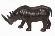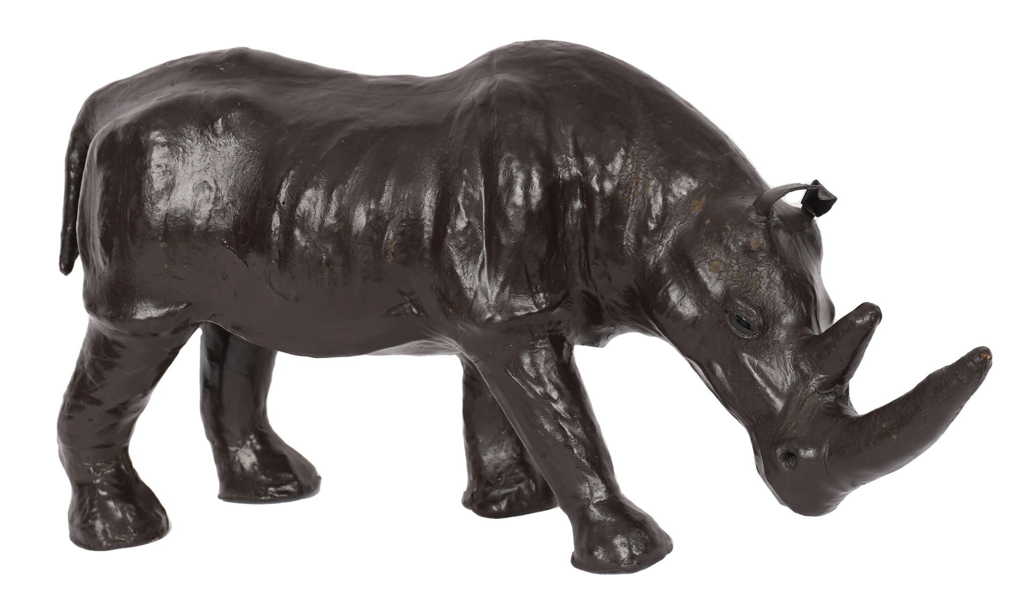 A carved rhinoceros form wrapped in brown leather with inset glass eyes, modelled in standing pose with naturalistic body contours. Surface wear consistent with age.