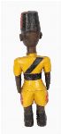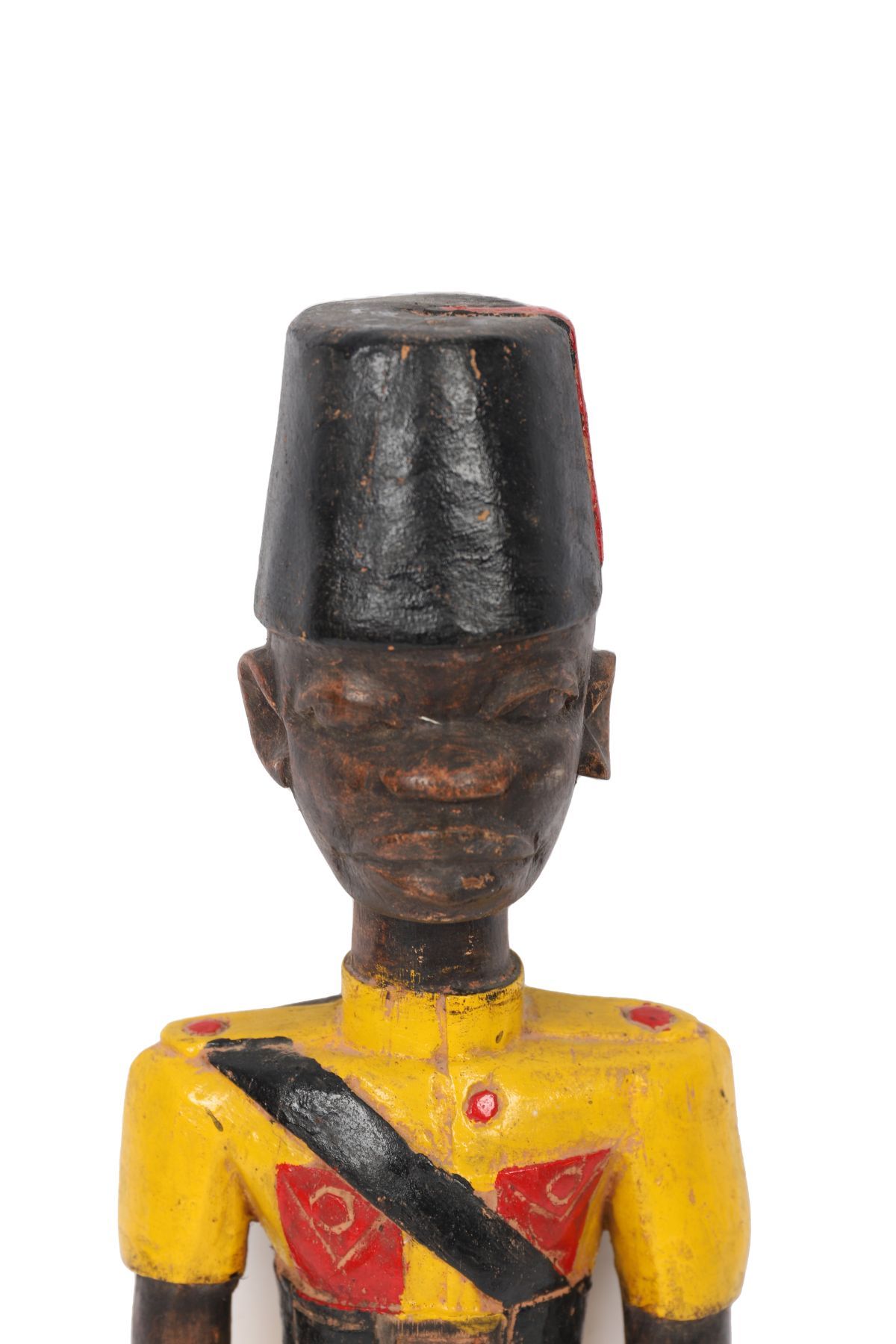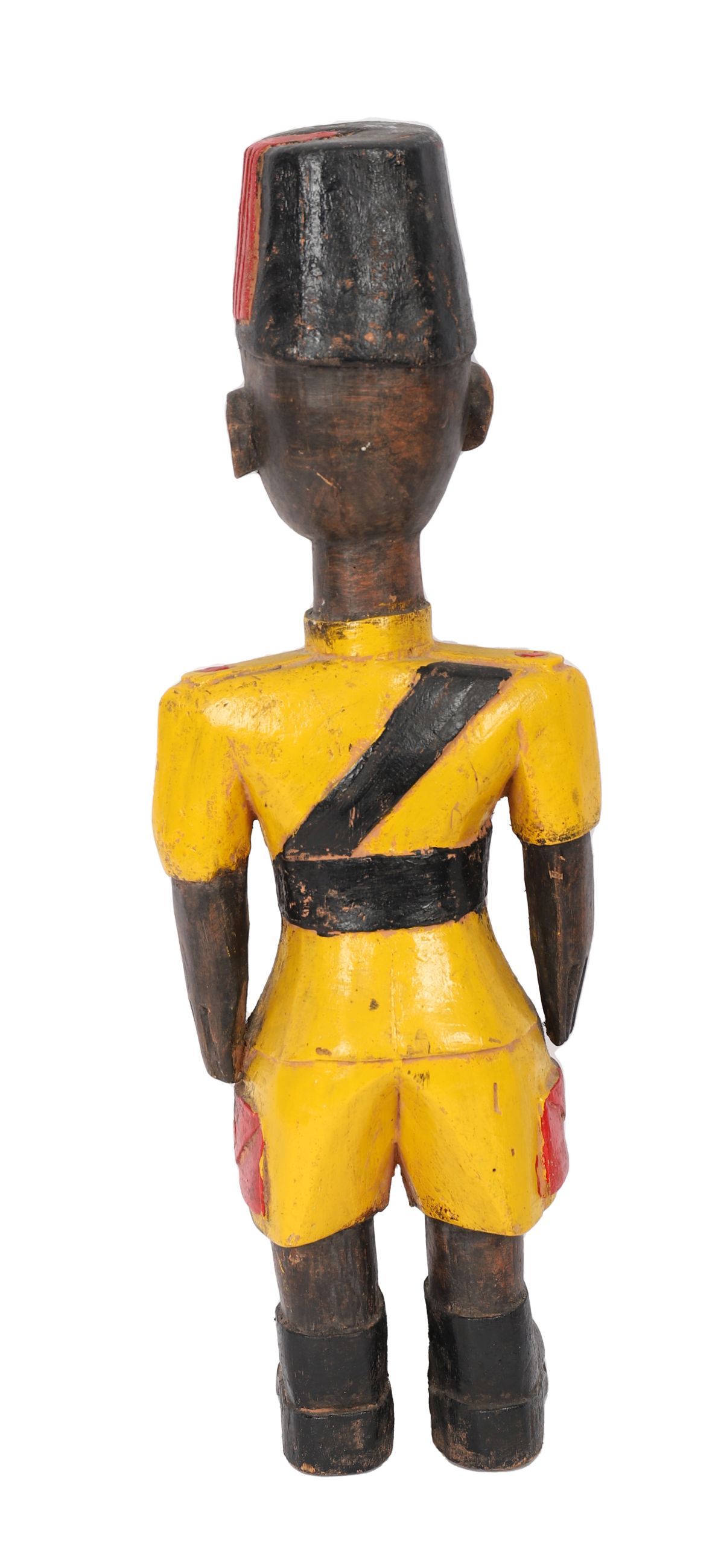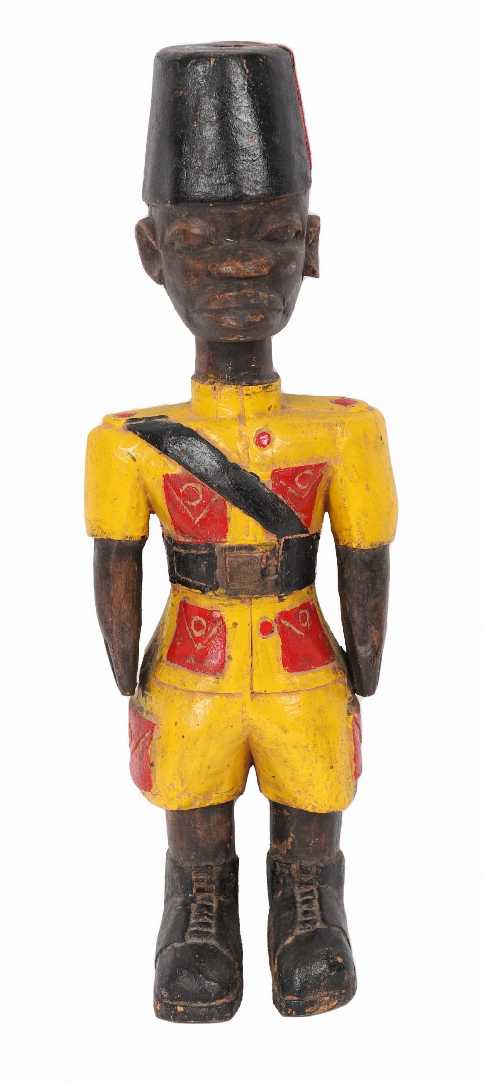 A carved and polychrome-painted wooden figure of a uniformed soldier with cap, sash and boots, in the manner of West African colonial-period carvings.