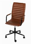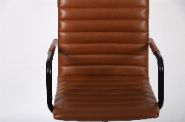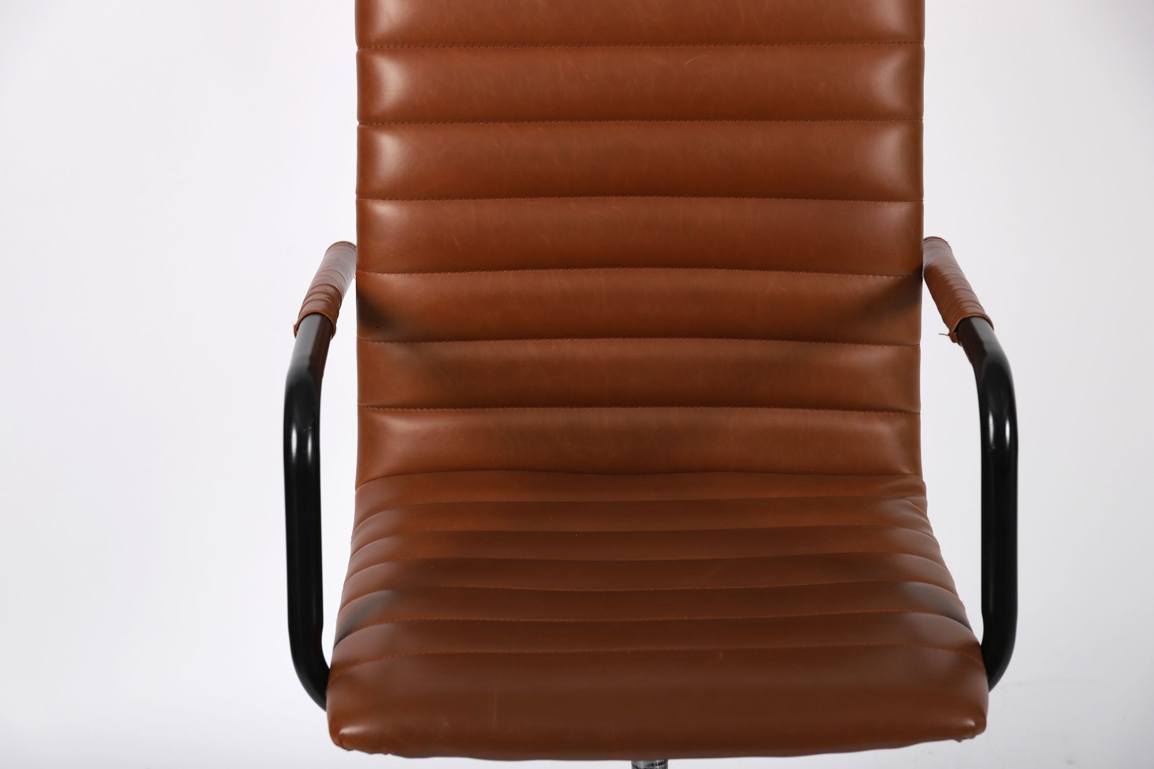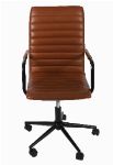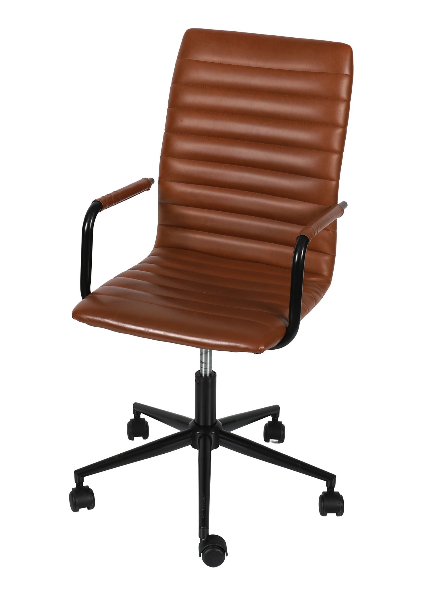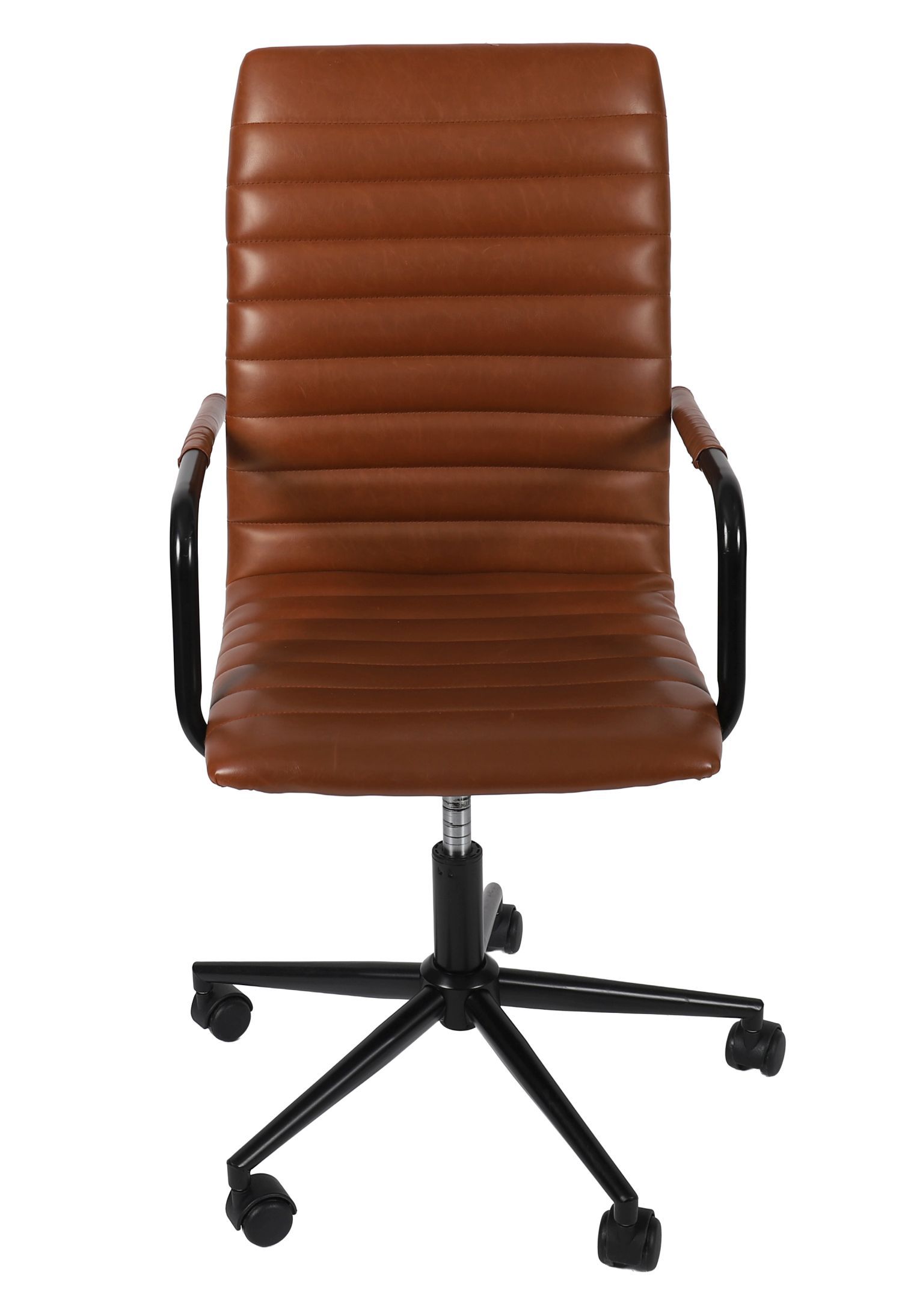 Tan leatherette office chair with ribbed seat and backrest, adjustable height, and black five-star wheeled base. Comfortable and smart with retro flair.