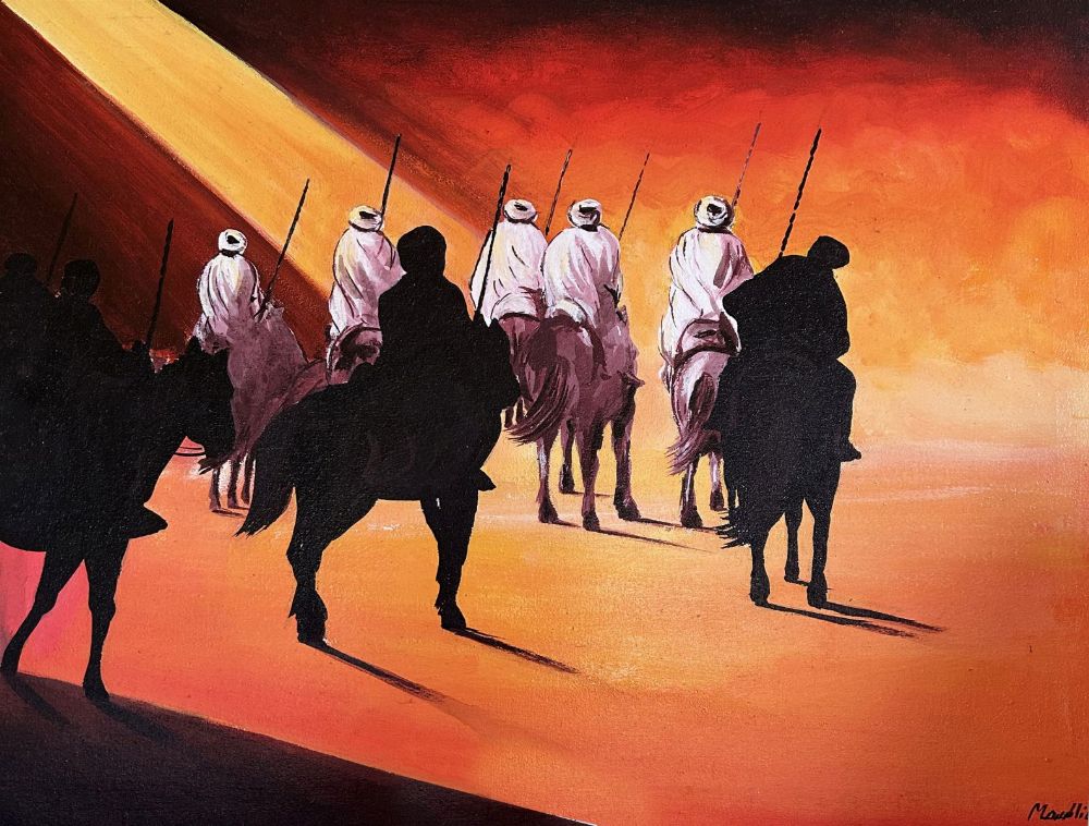 Horsemen in the Desert. Signed oil on canvas.