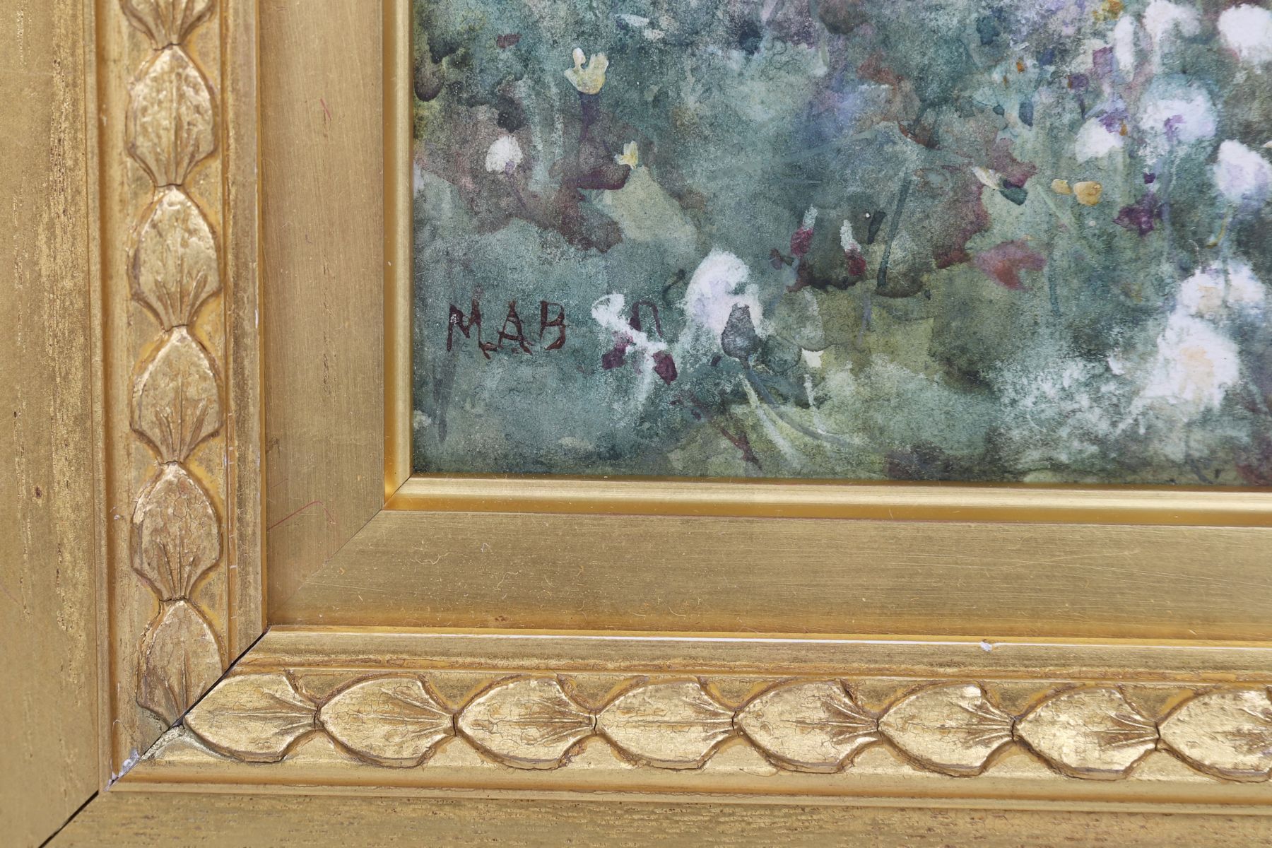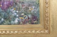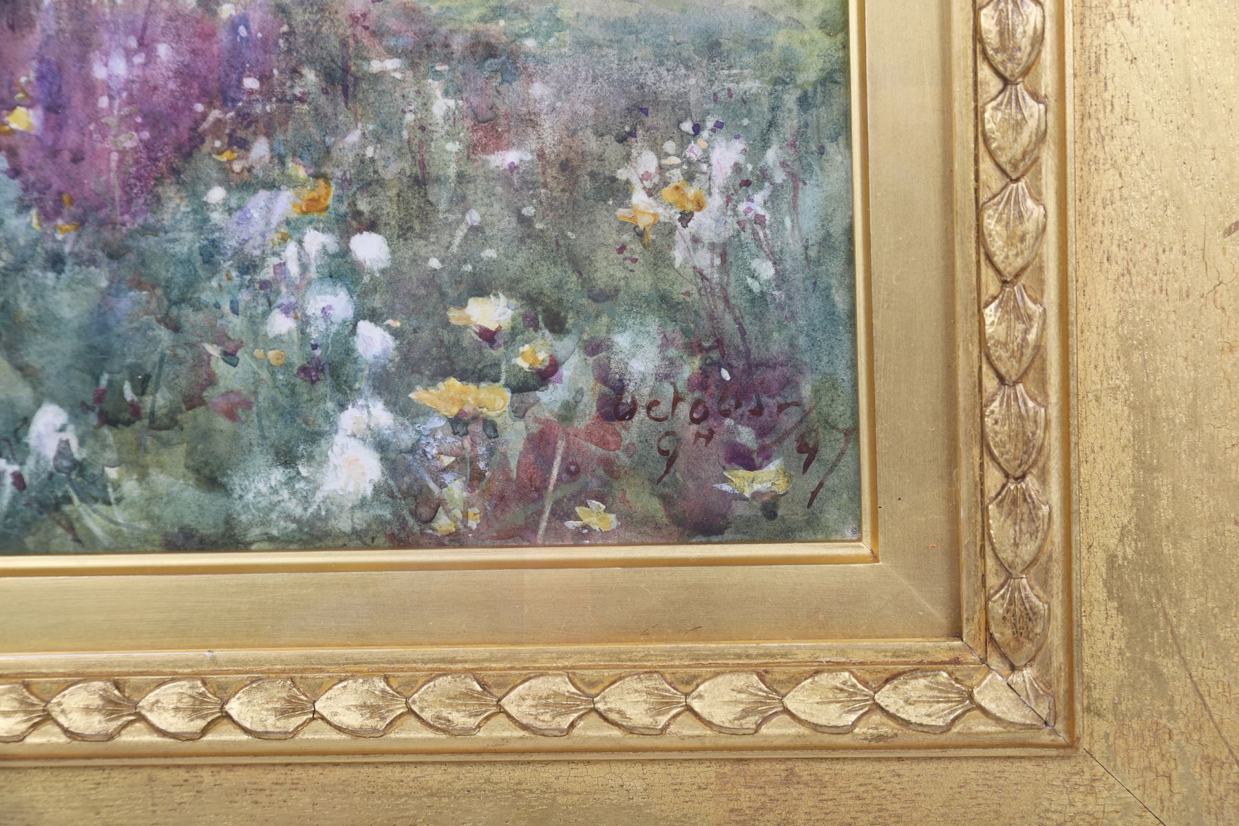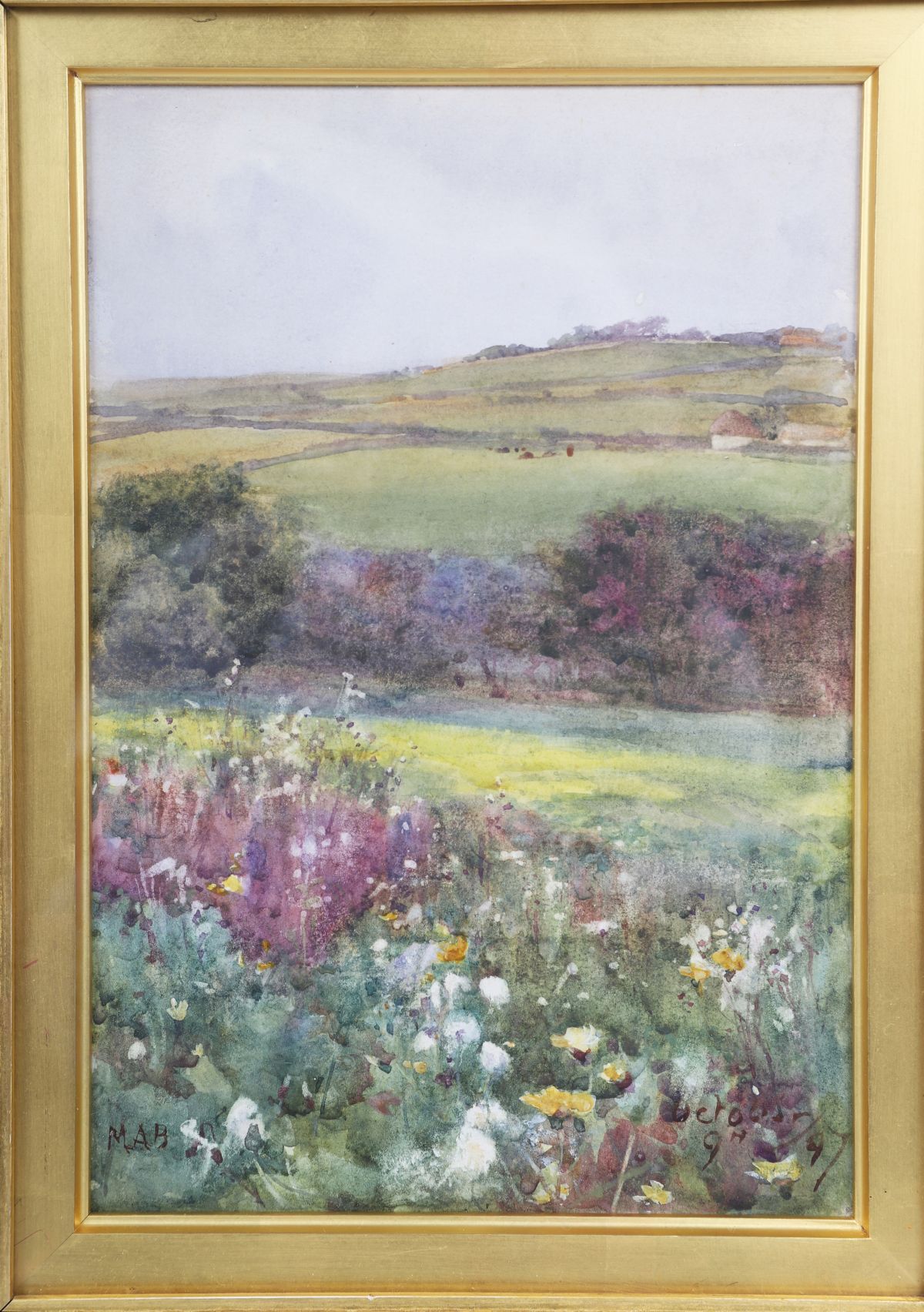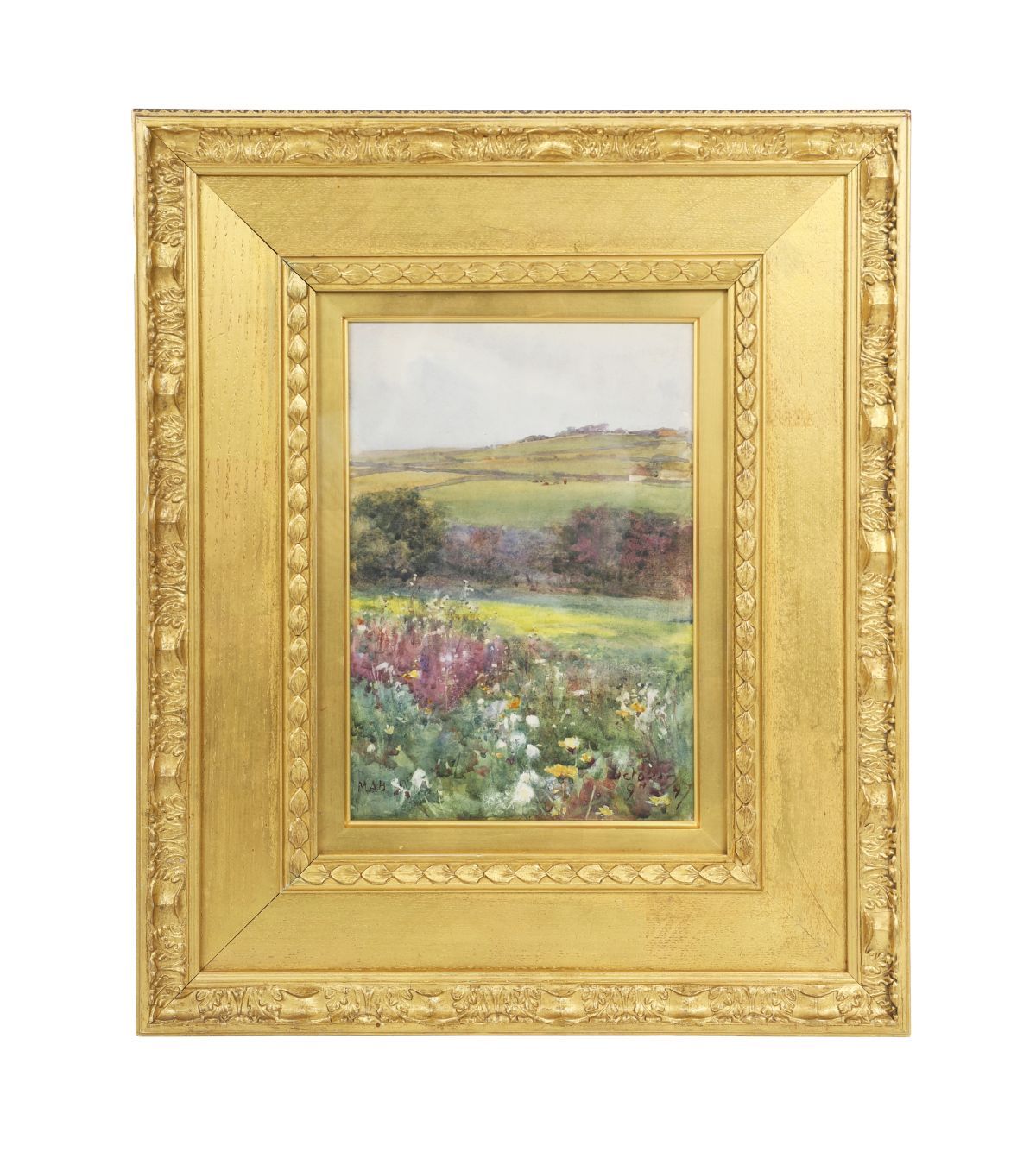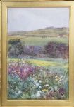 Watercolour landscape depicting a sunlit rural scene with wildflowers and rolling fields, painted with Butler’s characteristic freshness and delicate naturalism. Presented in a gilt frame with decorative moulding.