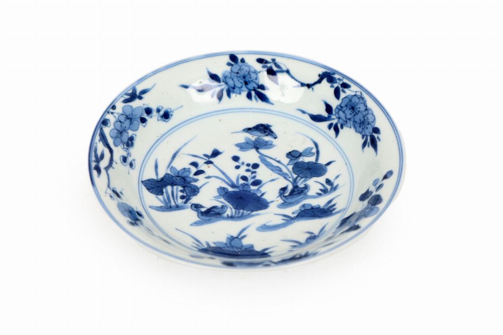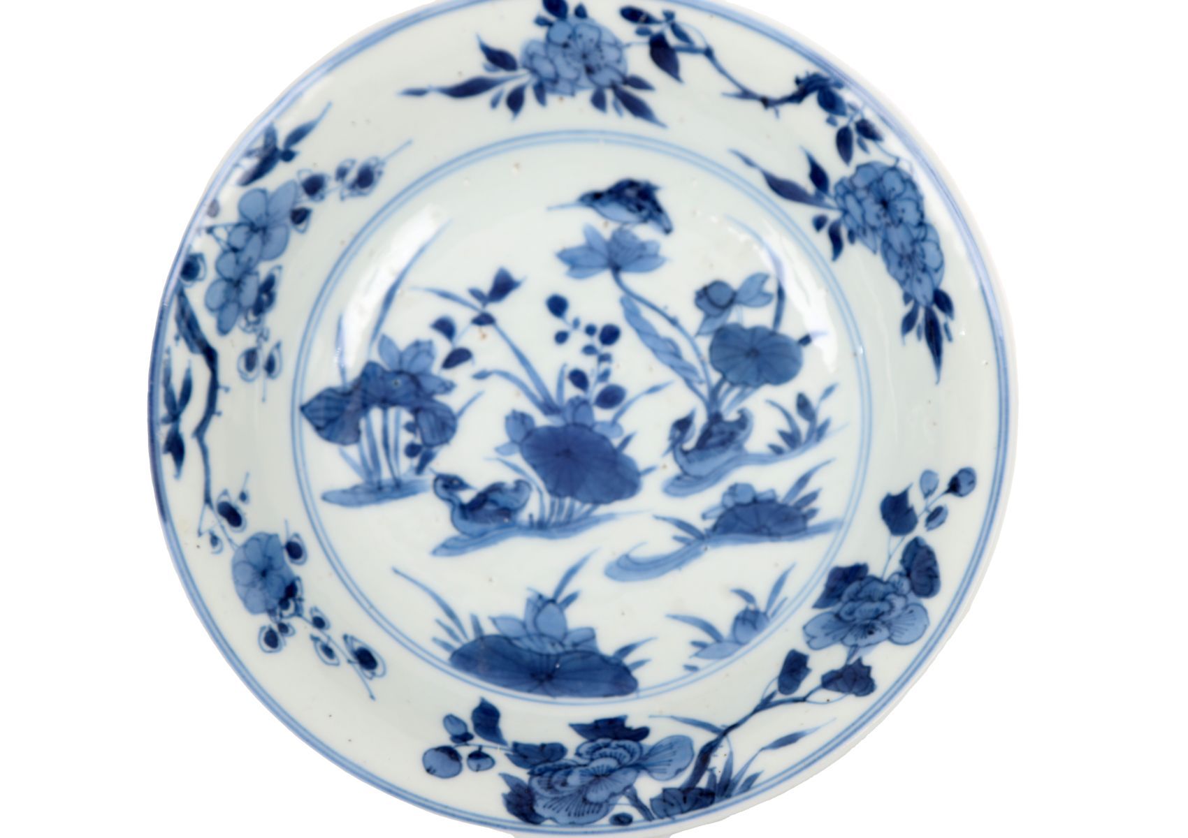Circular dish painted in underglaze blue with ducks swimming among lotus and aquatic plants, the cavetto and rim with floral and foliate decoration.