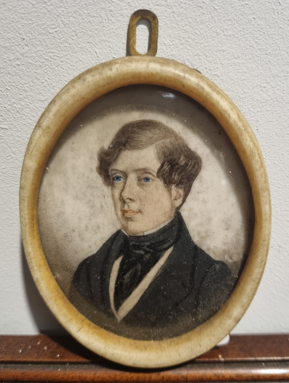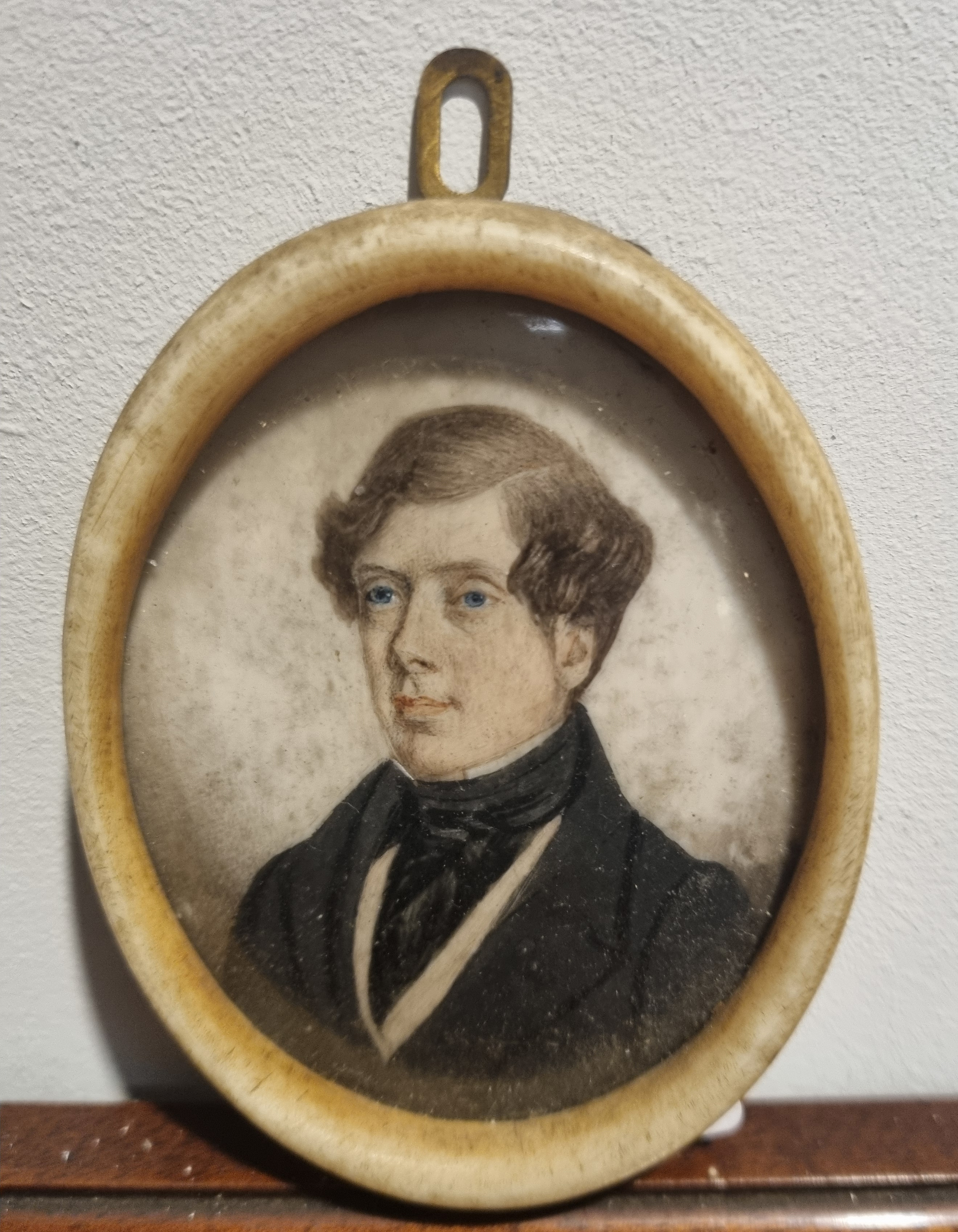 Early 19th century. Watercolour on ivory, showing a seated gentleman in dark coat and white cravat; in small ivory frame.