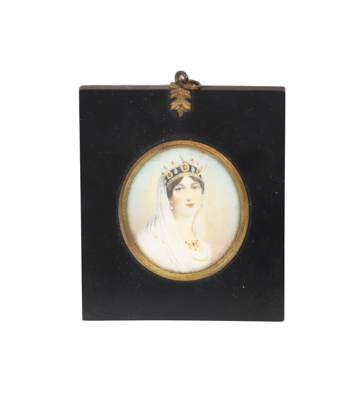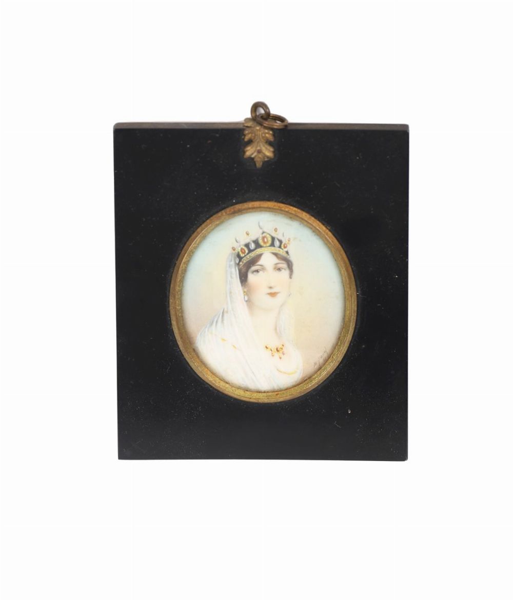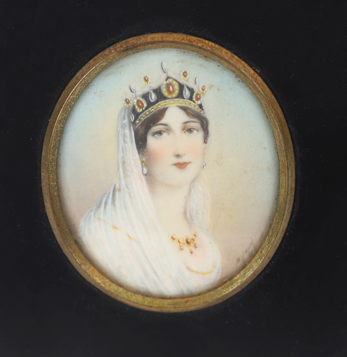 19th century. Watercolour on ivory, oval, depicting a crowned lady in white veil and jewels; signed indistinctly lower right, mounted in ebonised frame with gilt surround.