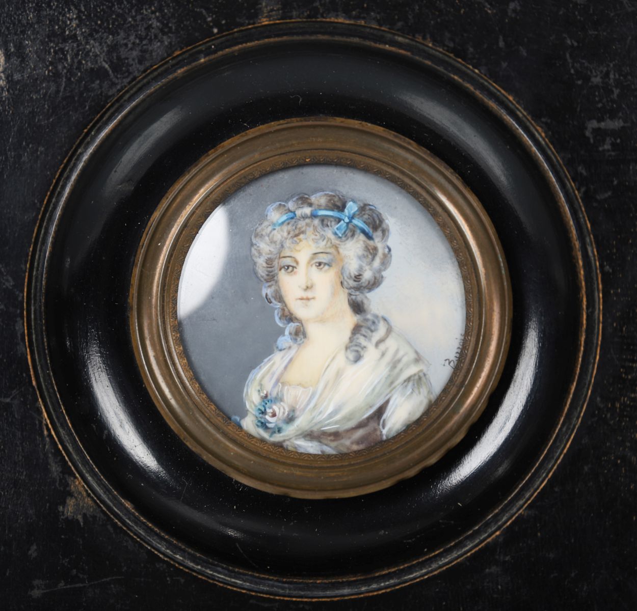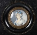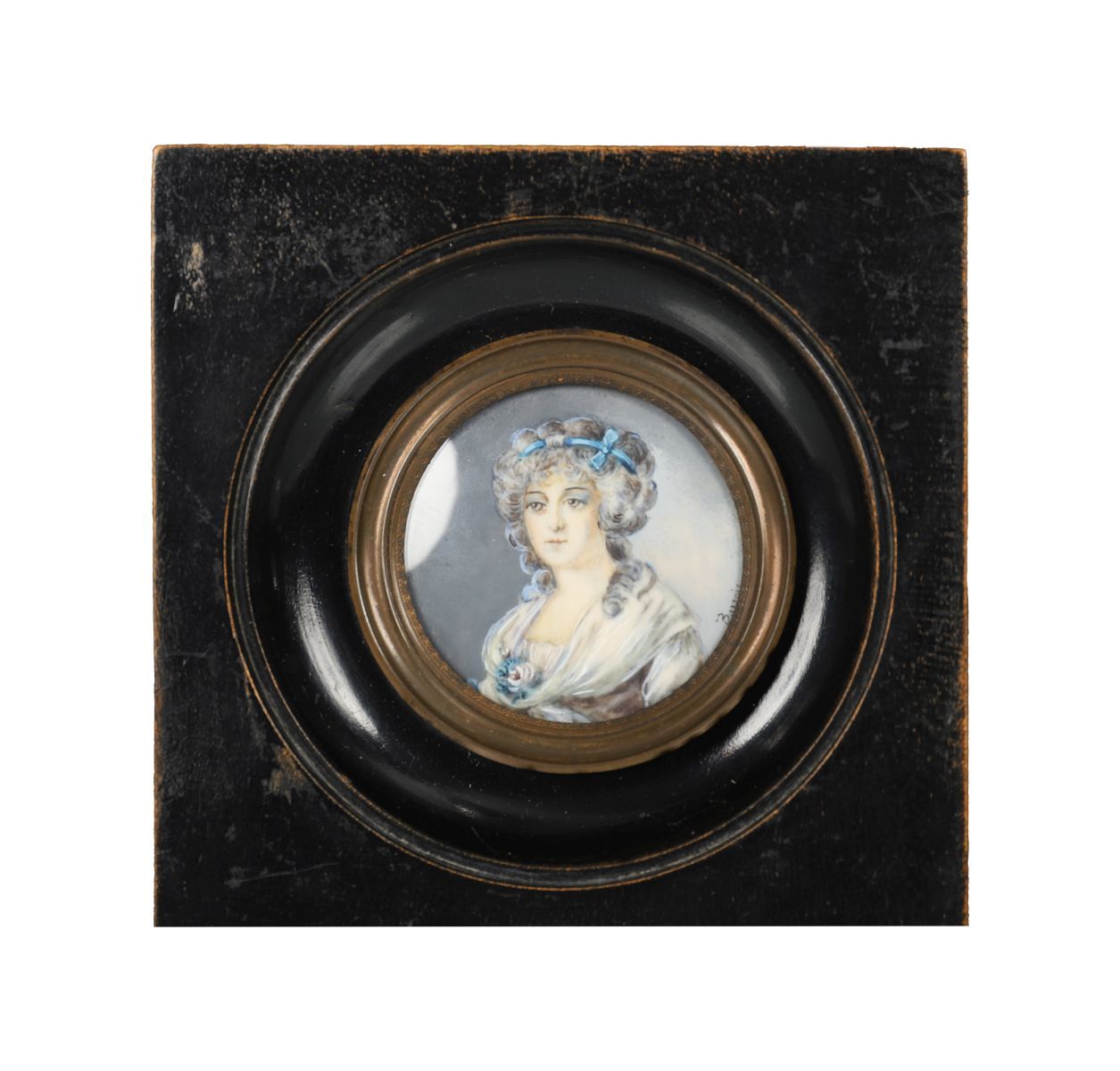 Lot 470 MINIATURE PORTRAIT OF A LADY WITH BLUE RIBBON, IN EBONISED FRAME