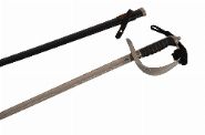 A modern British Army officer's sword, the nickel-plated guard with pierced foliate scrollwork, wire-bound black grip, and black leather knot. The straight fullered blade etched with scrolling foliage and crowned cypher, marked WKC Solingen Germany with knight's head logo to the ricasso. Black leather scabbard with plated chape.
