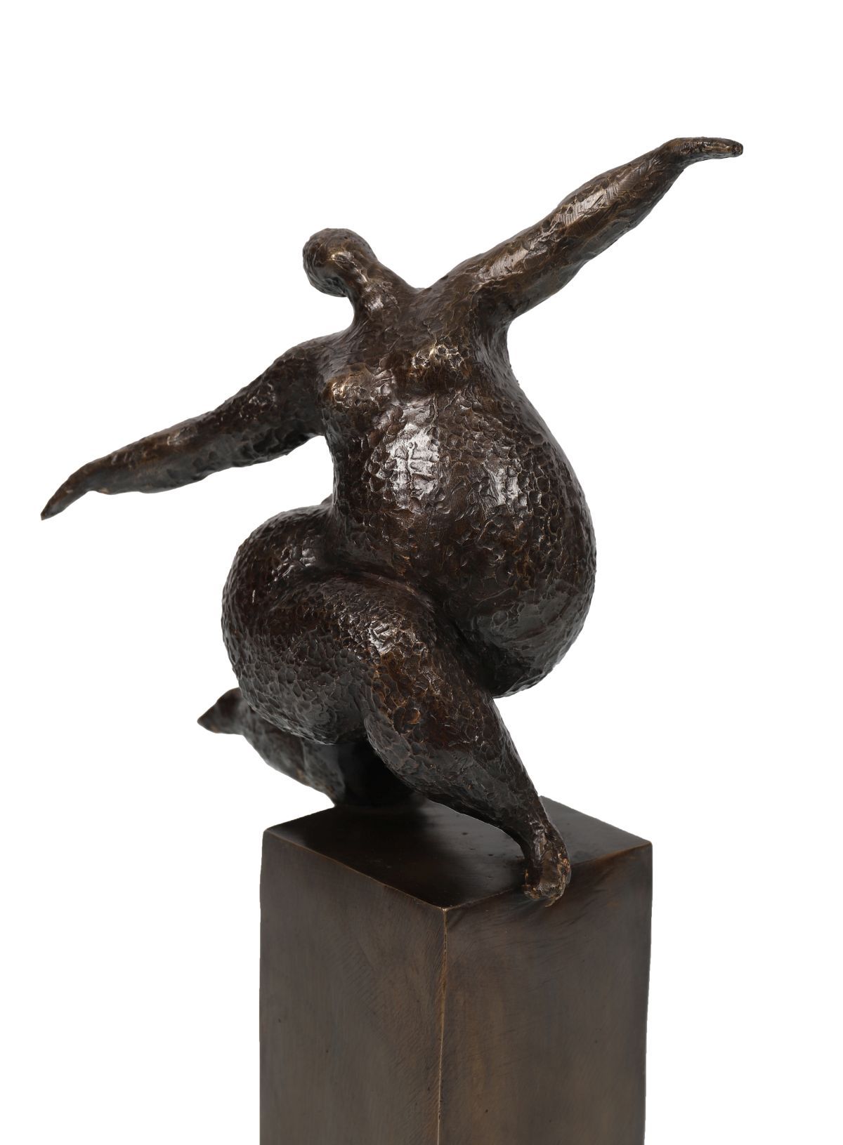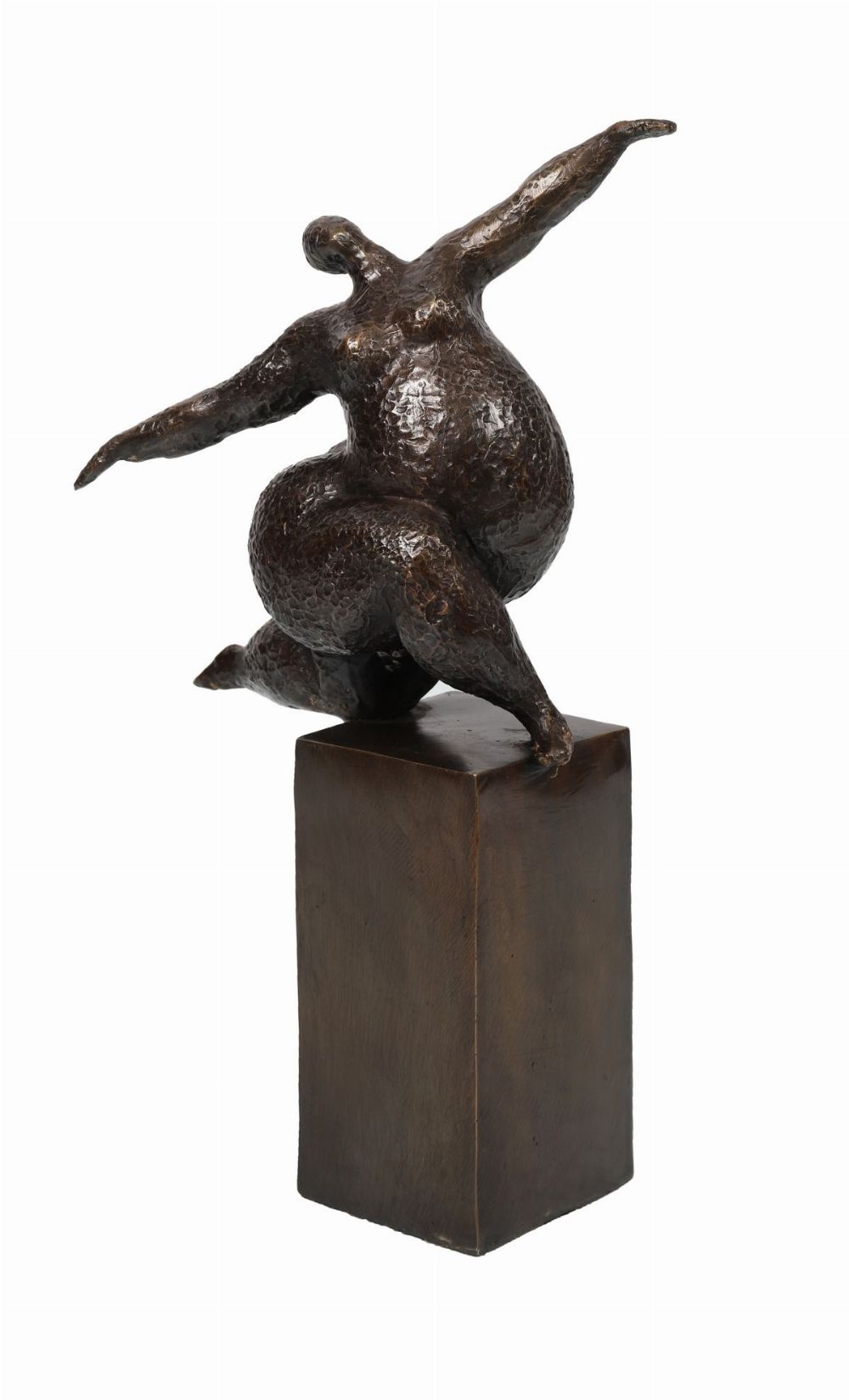 A modern abstract bronze sculpture, depicting a stylised female form with textured surface, mounted on a rectangular bronze plinth.