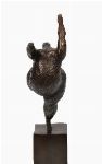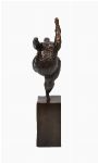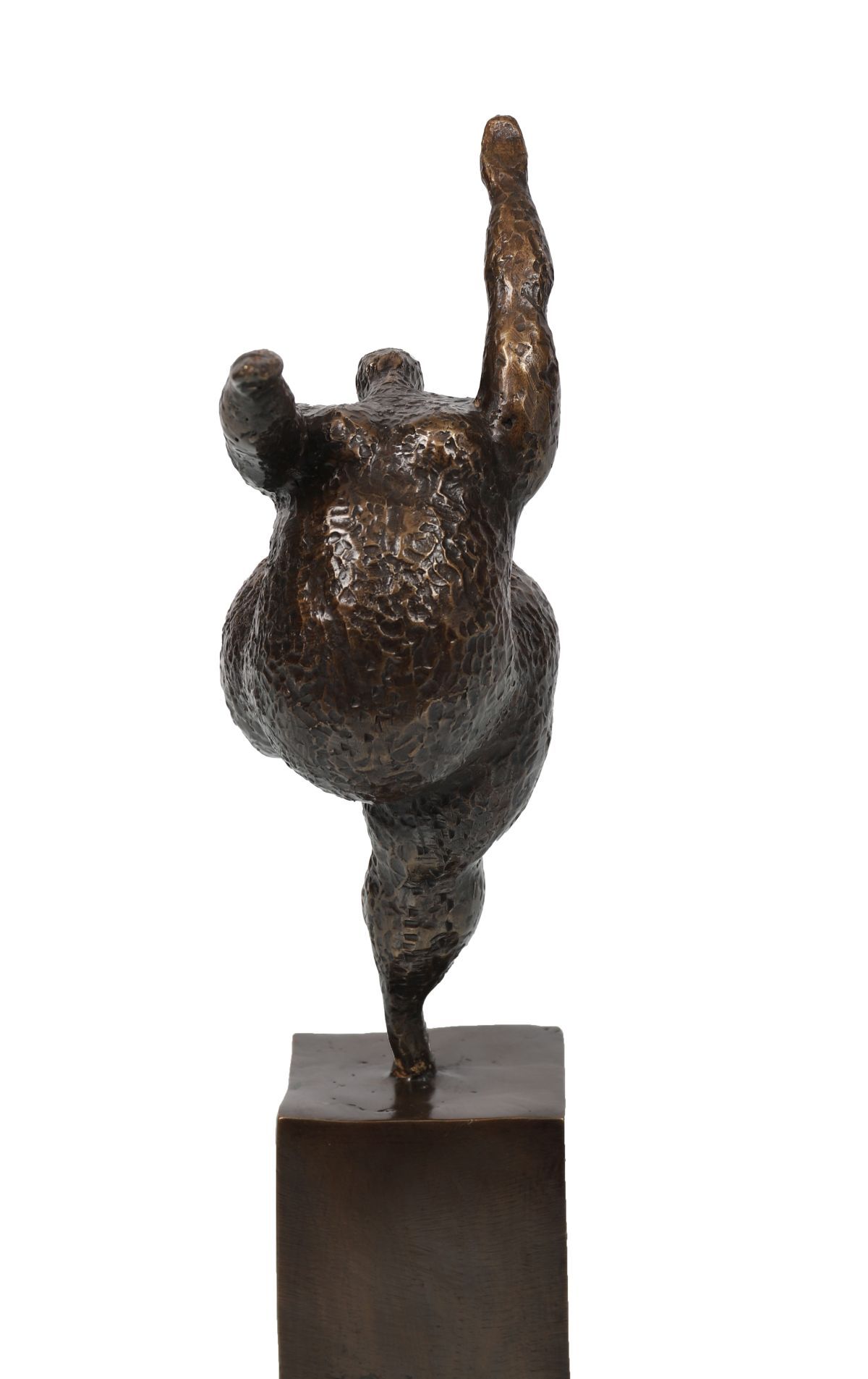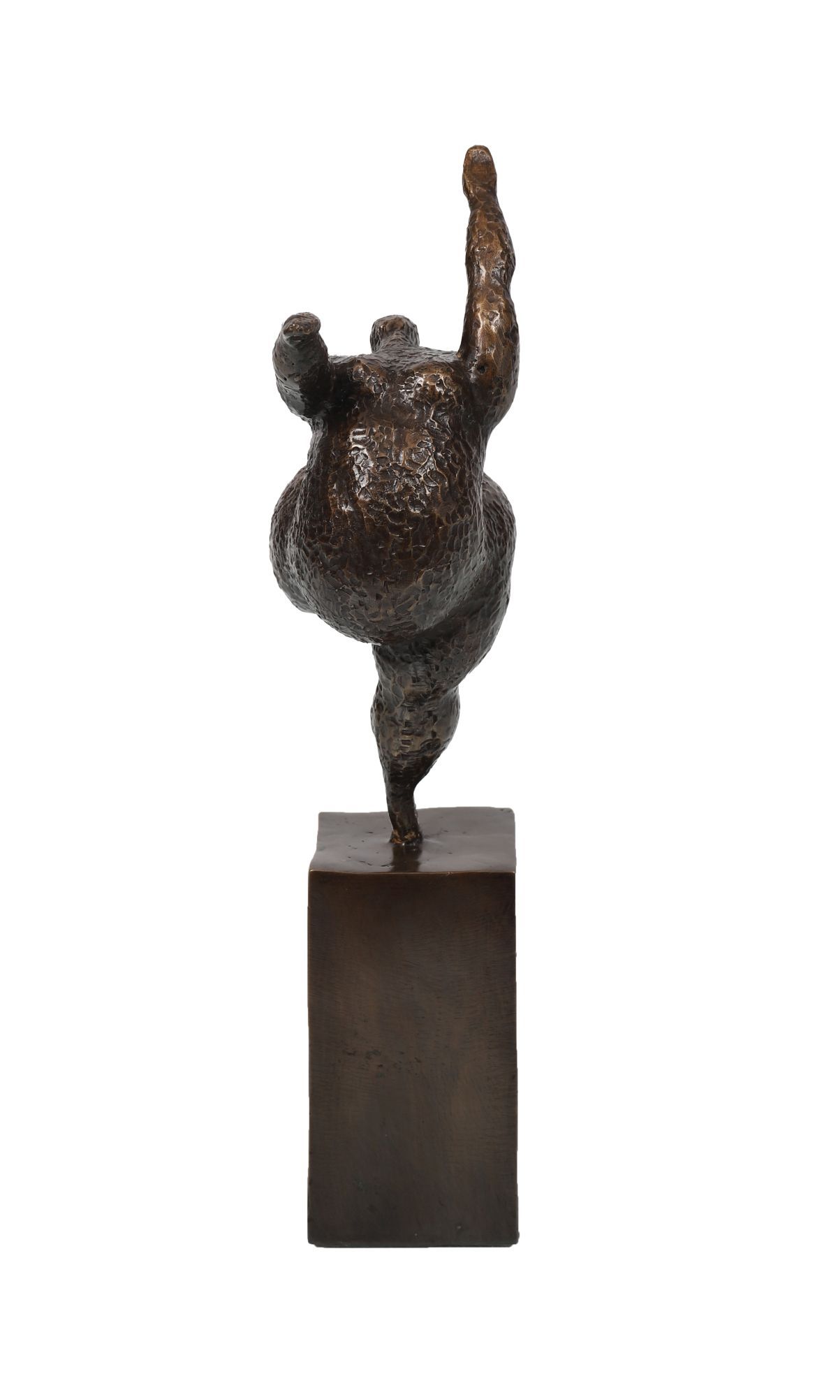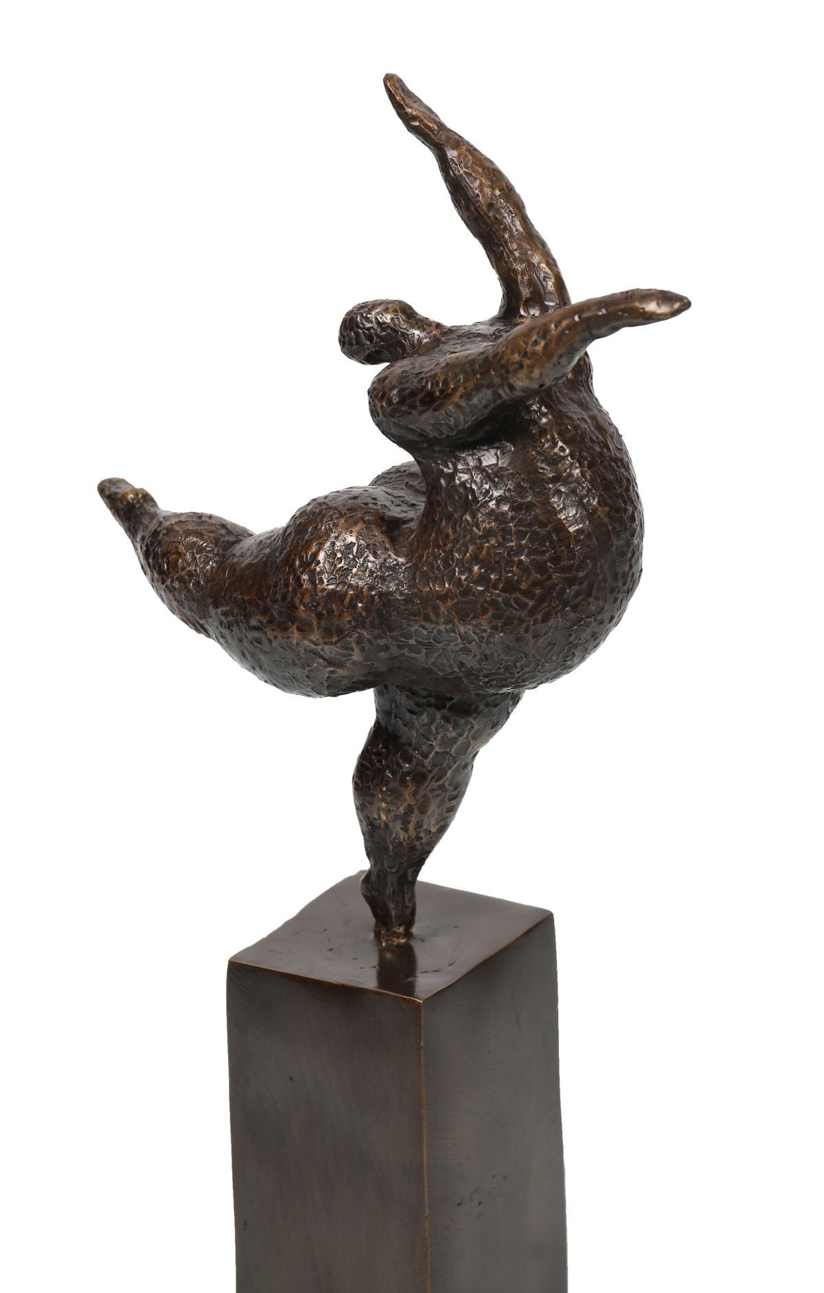 A modern abstract bronze sculpture of a reclining figure with raised arms, textured finish, mounted on a square bronze base.