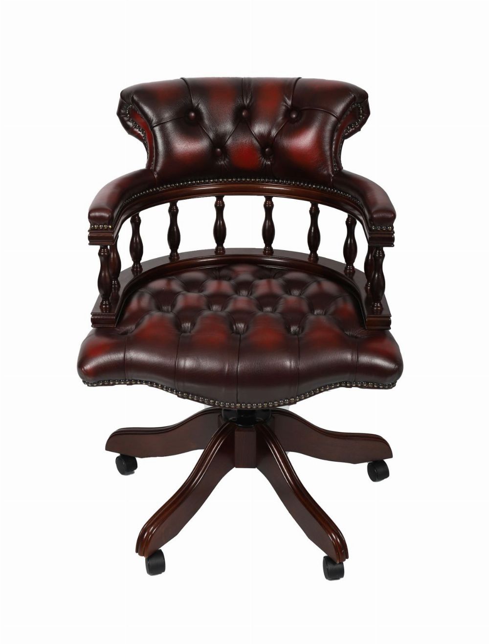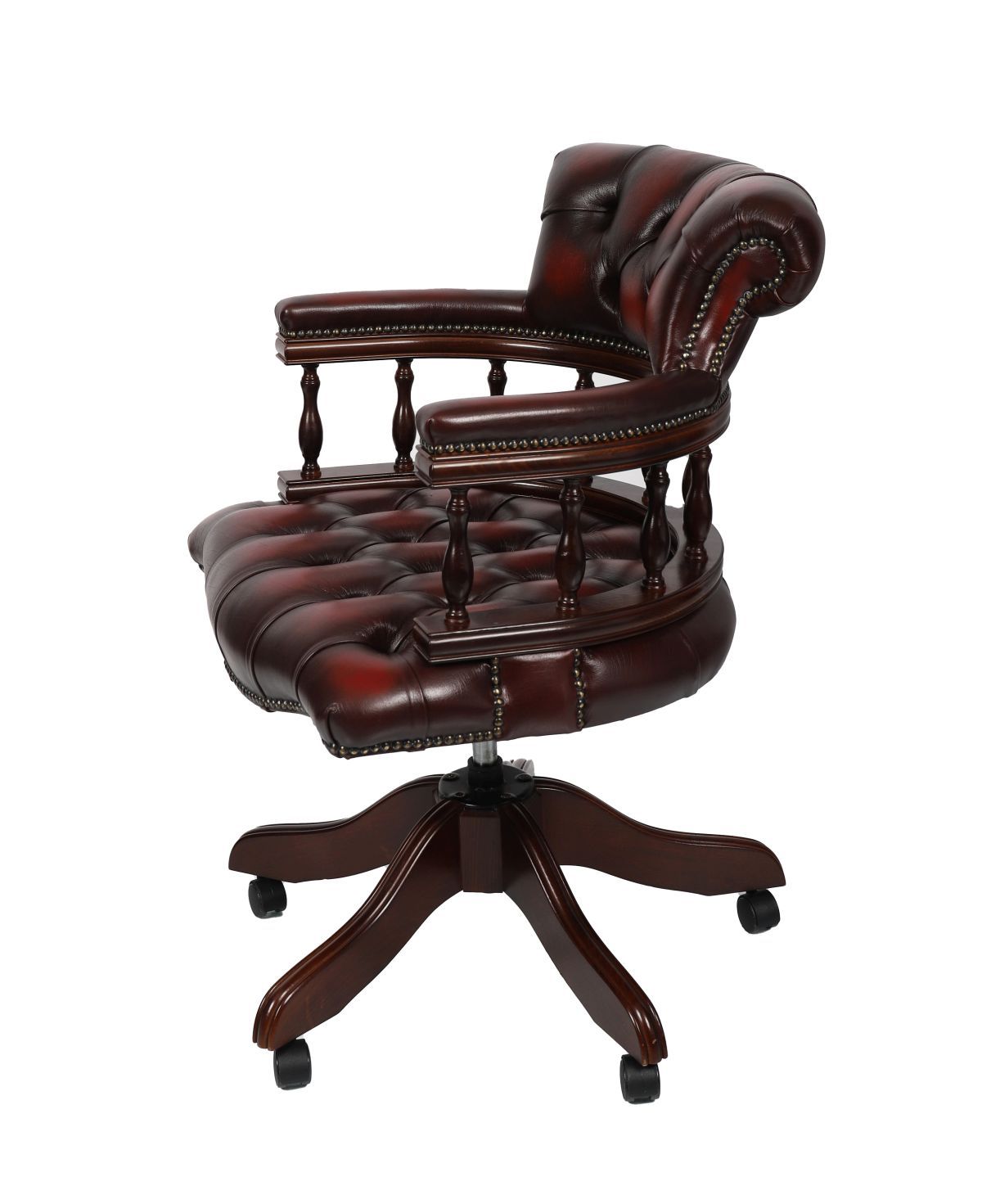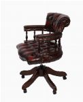 A modern gentleman's desk chair in burgundy leather, the deep buttoned back and seat with brass studwork, raised on a revolving base with splayed legs.