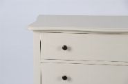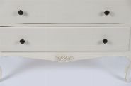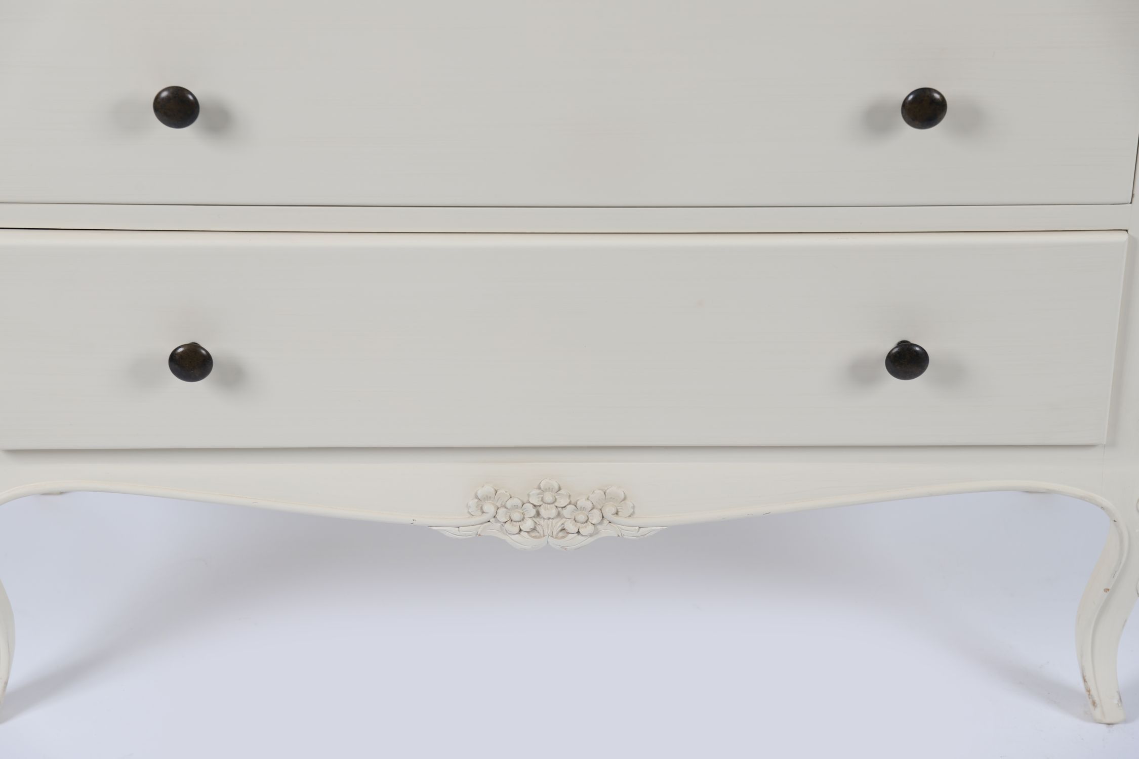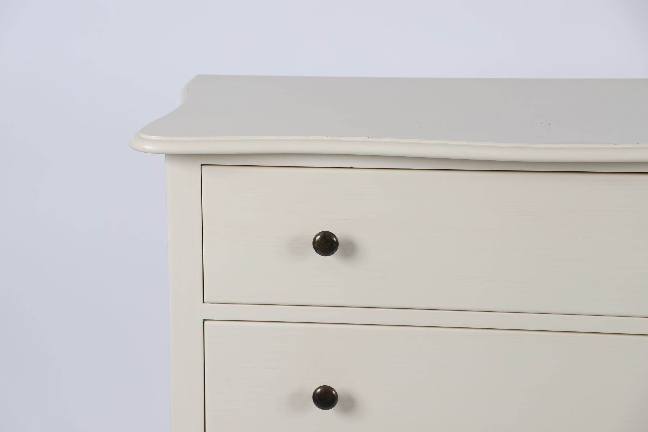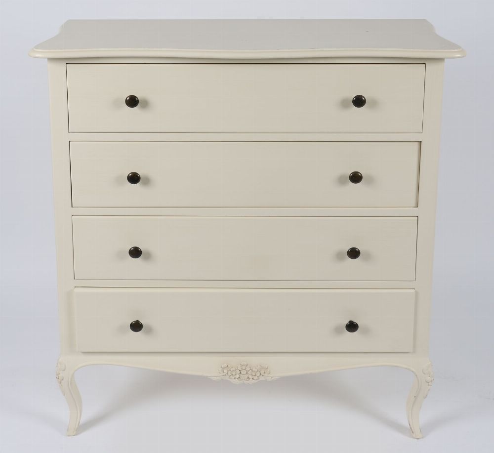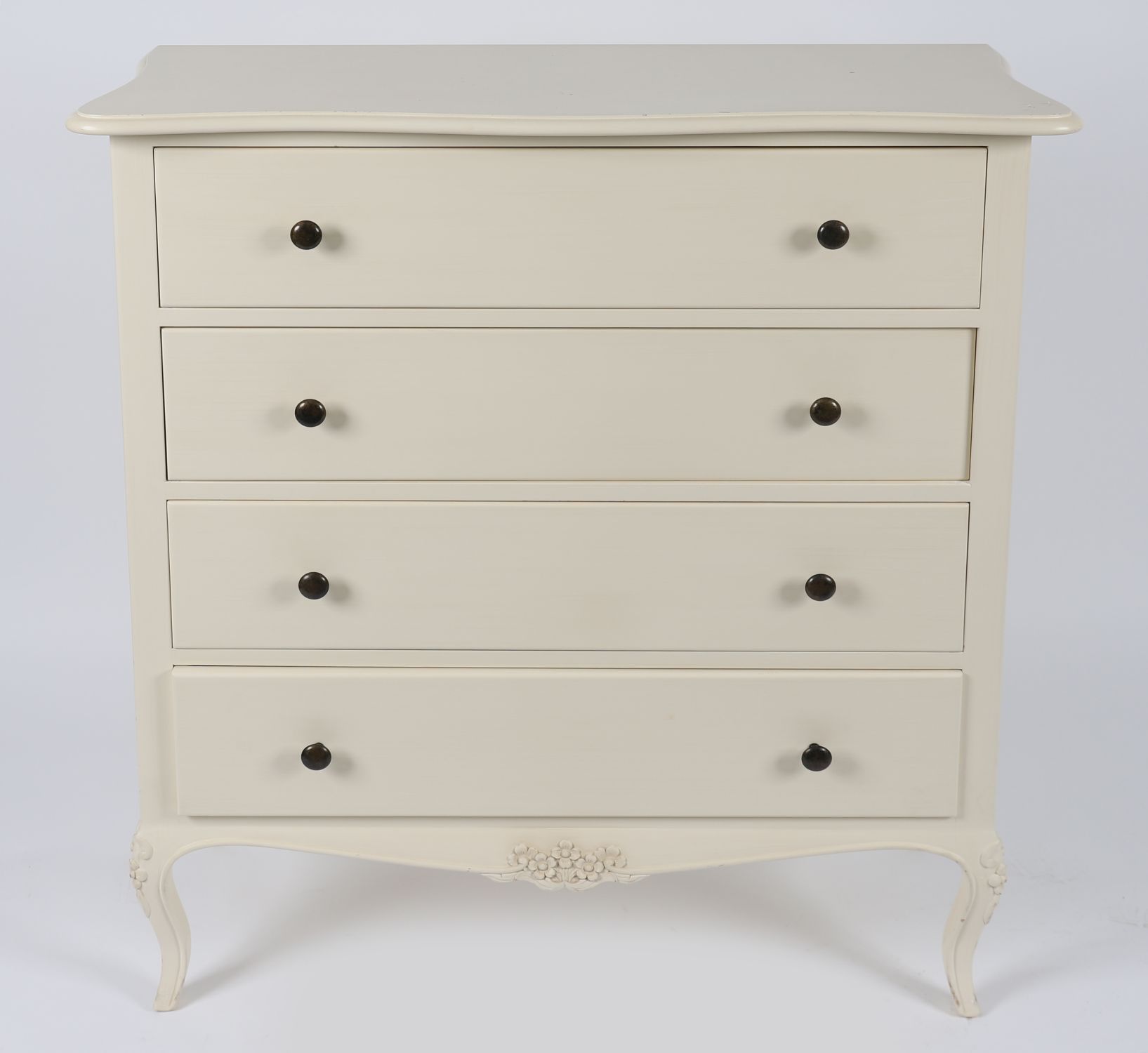 A modern painted chest of drawers with serpentine top and four full-width drawers, each fitted with contrasting black knob handles. The shaped apron and cabriole legs lend a light neoclassical flair to this clean, contemporary piece.