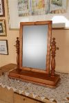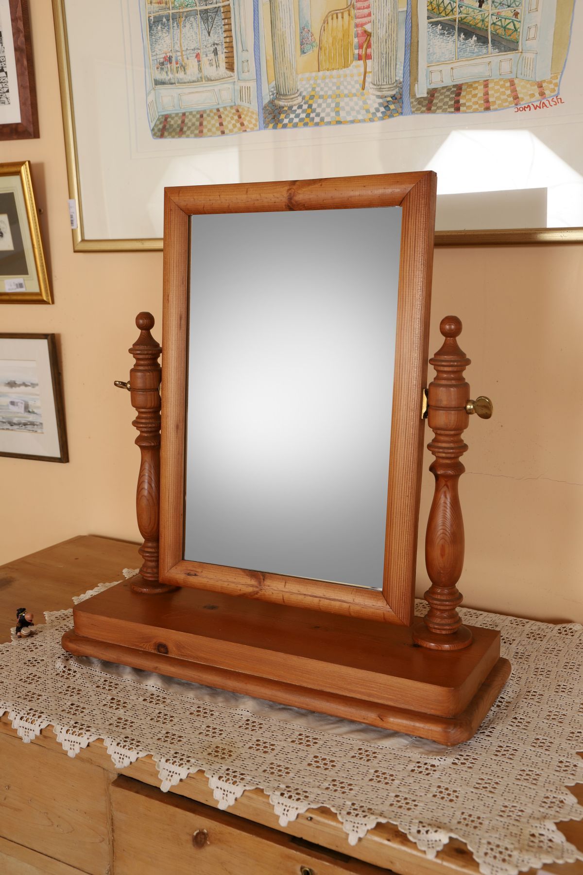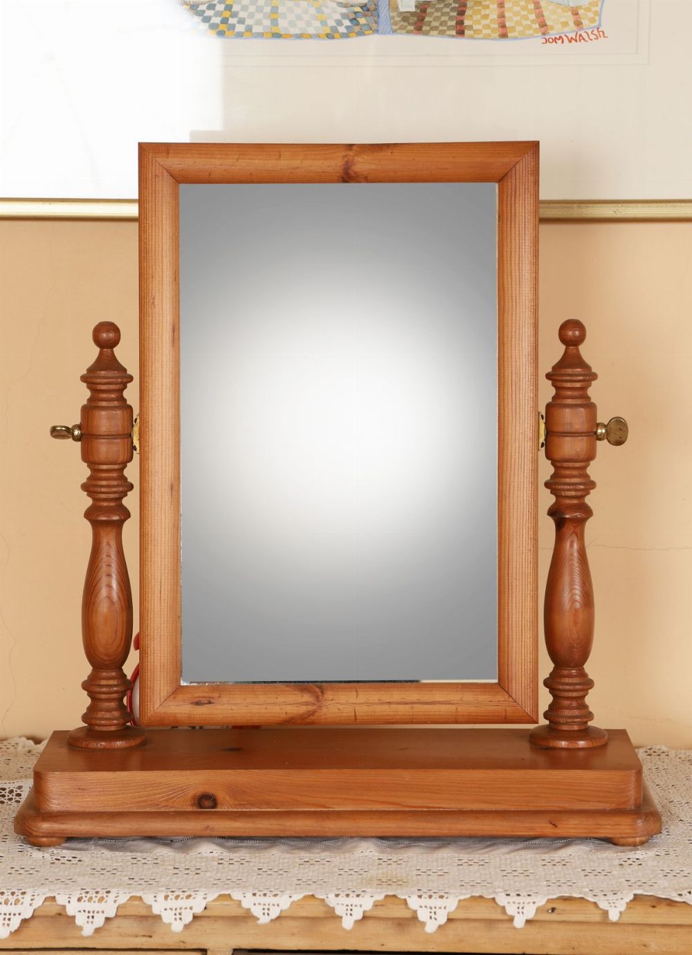 A modern pine crutch mirror, the rectangular plate within a shaped pine frame, supported on crutch-style uprights with turned feet.