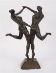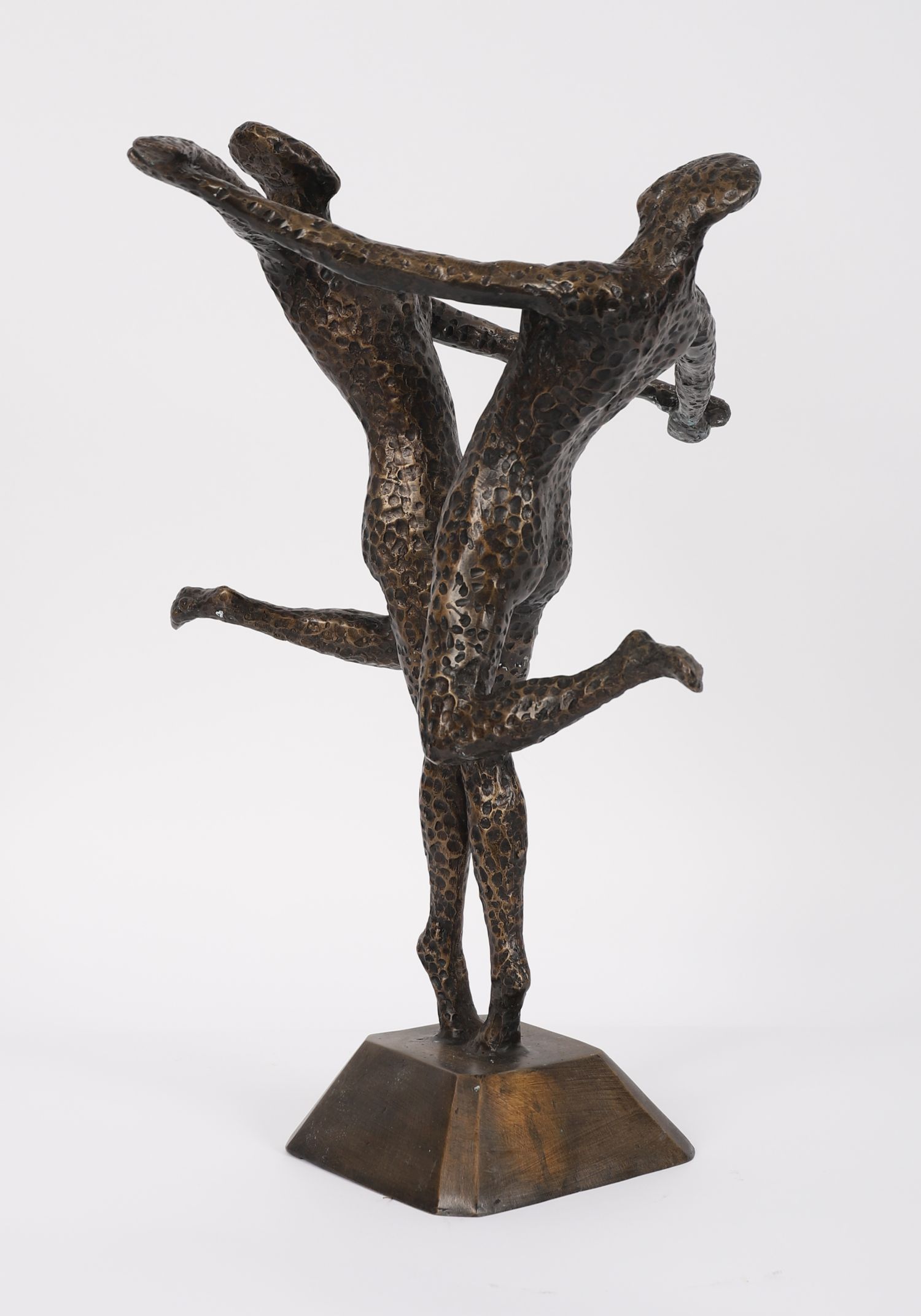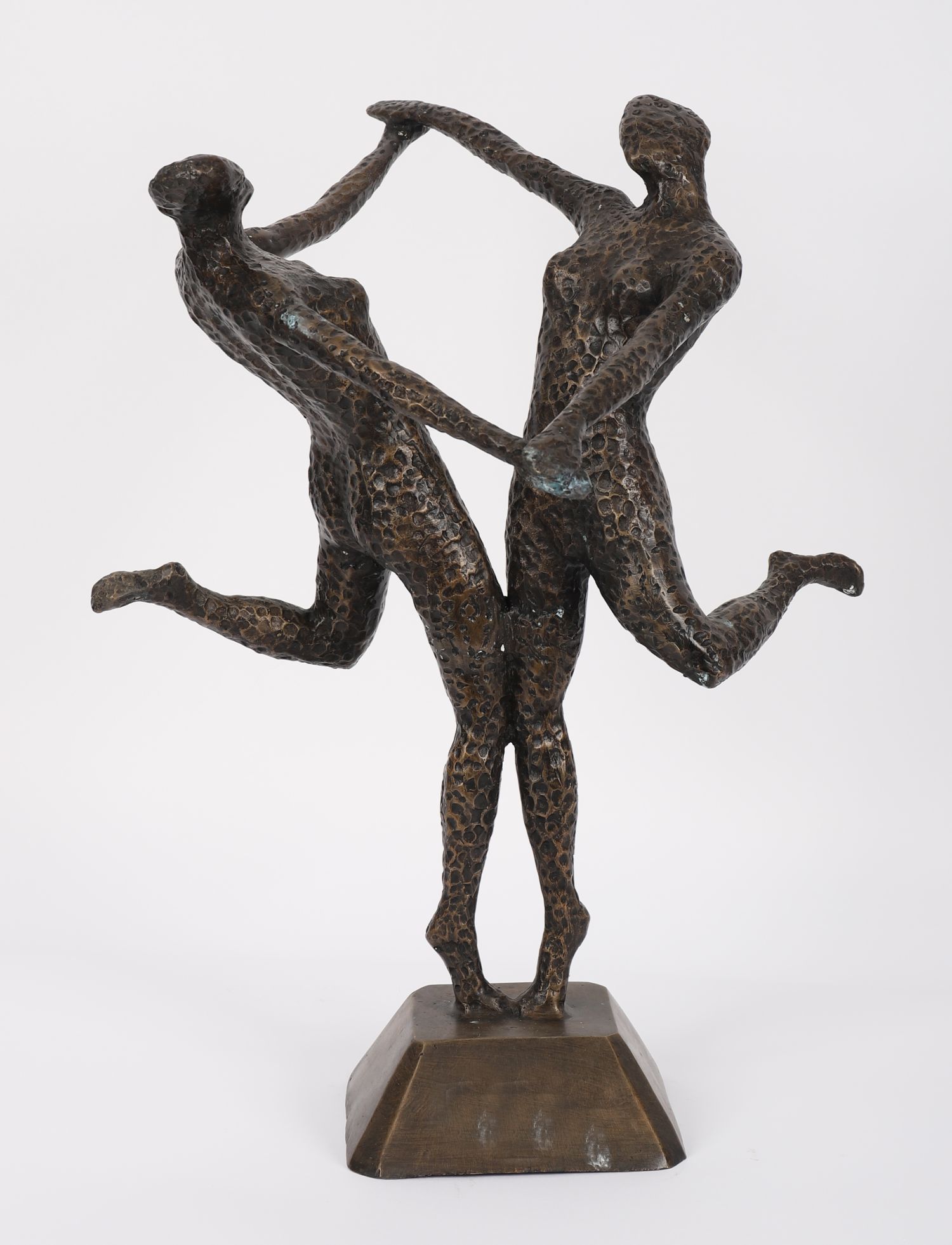 A contemporary patinated bronze sculpture of two stylised dancing figures on a stepped base.