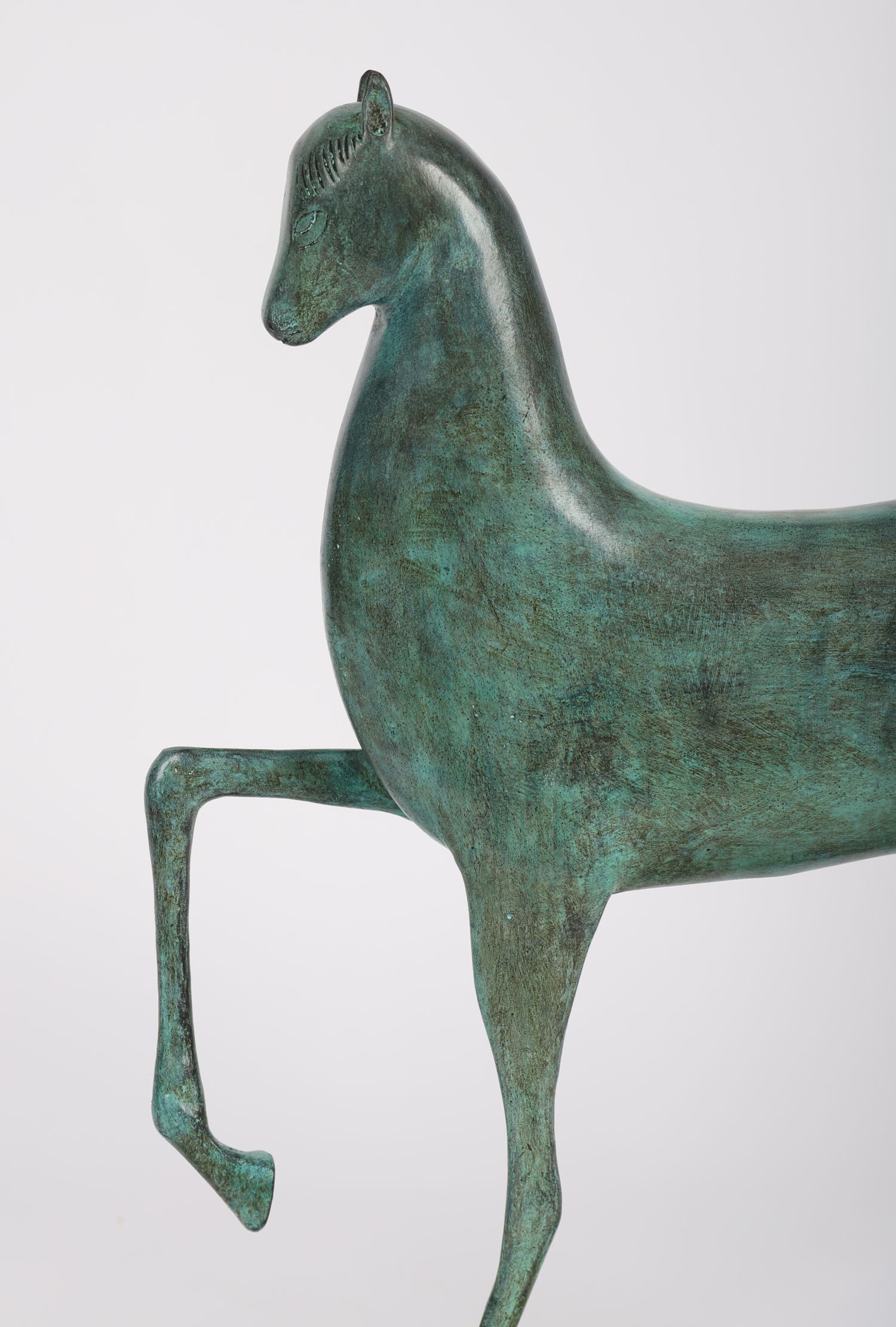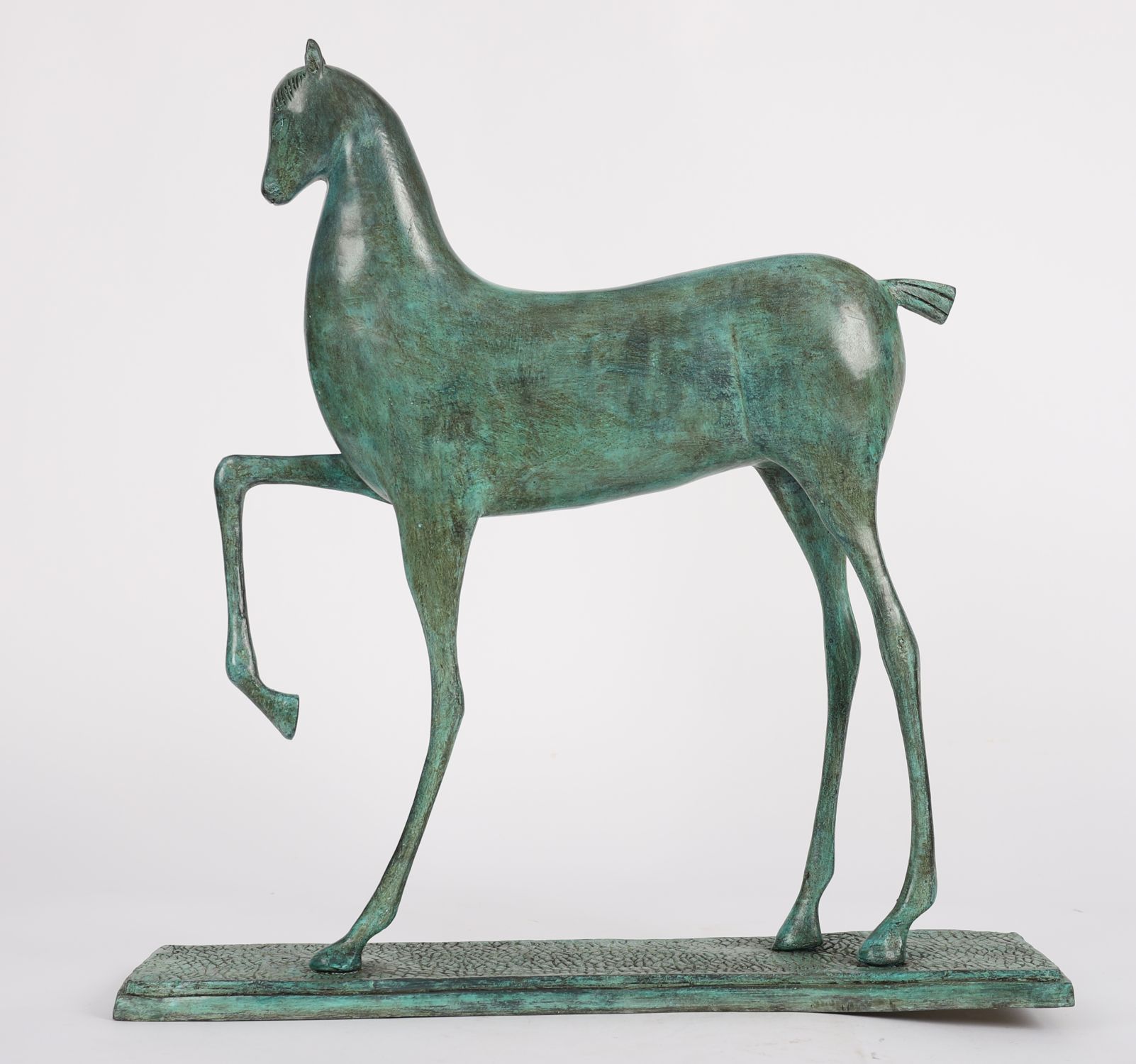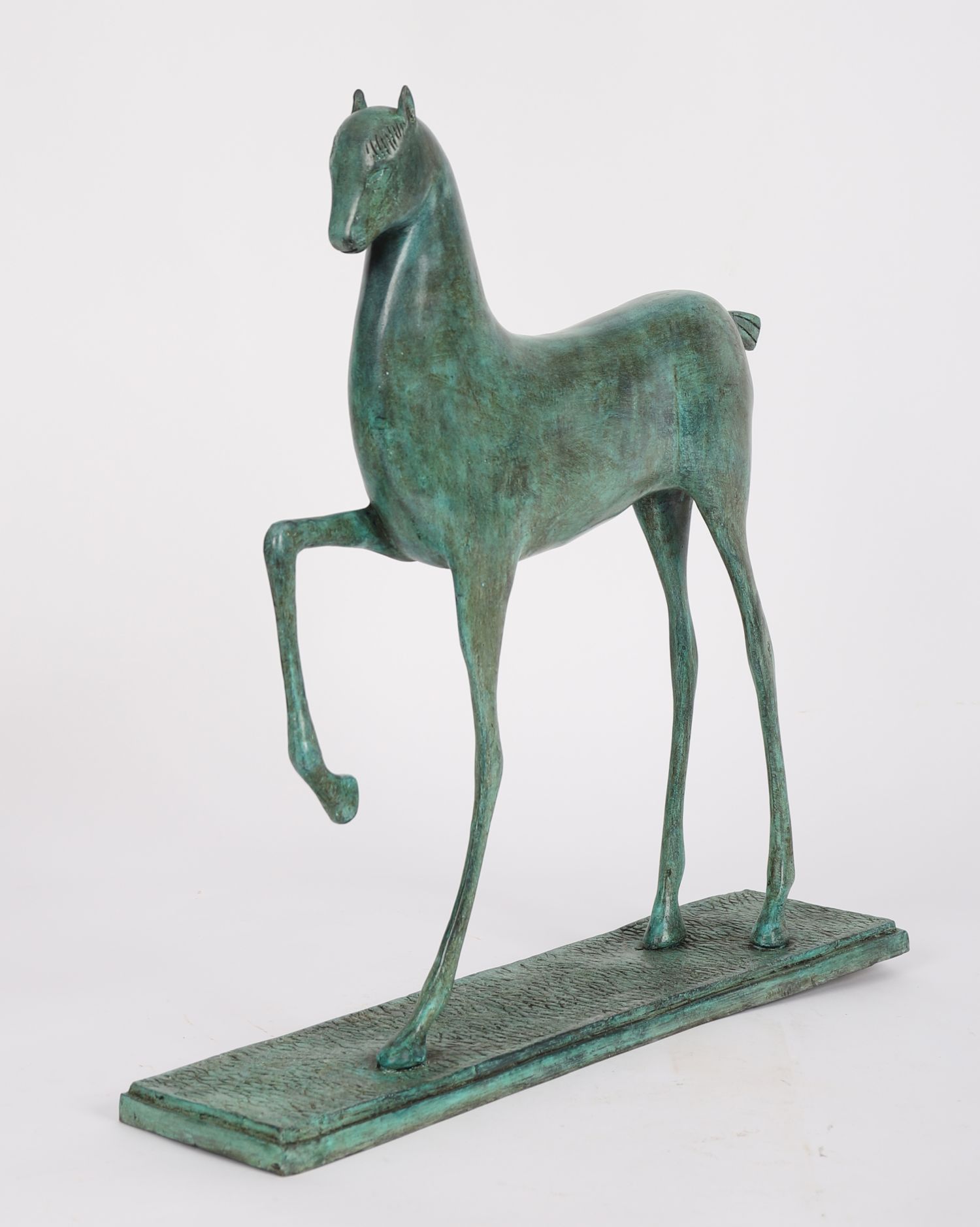 A patinated bronze sculpture of stylised horse form with elongated legs and arched neck, mounted on a textured rectangular base.