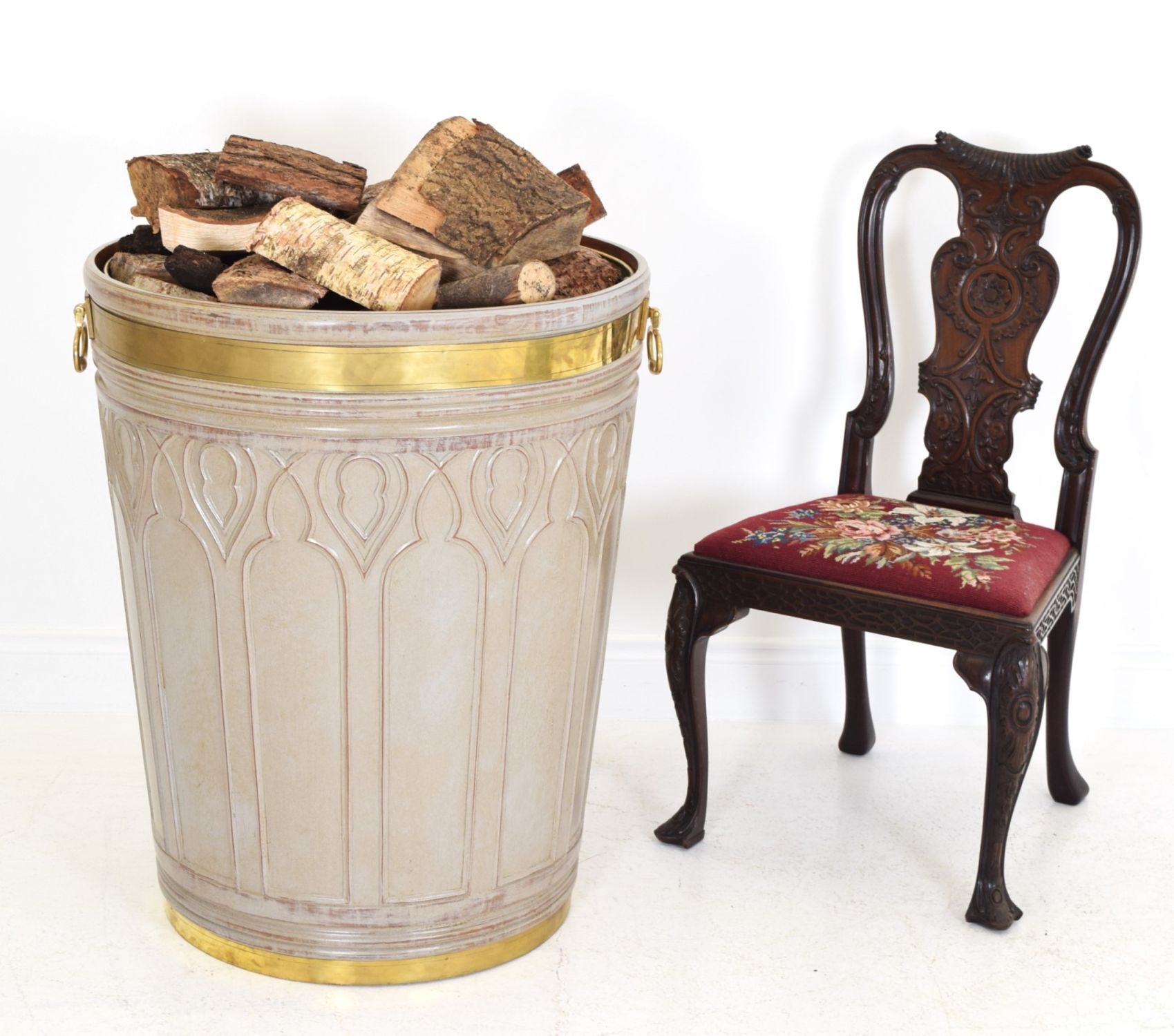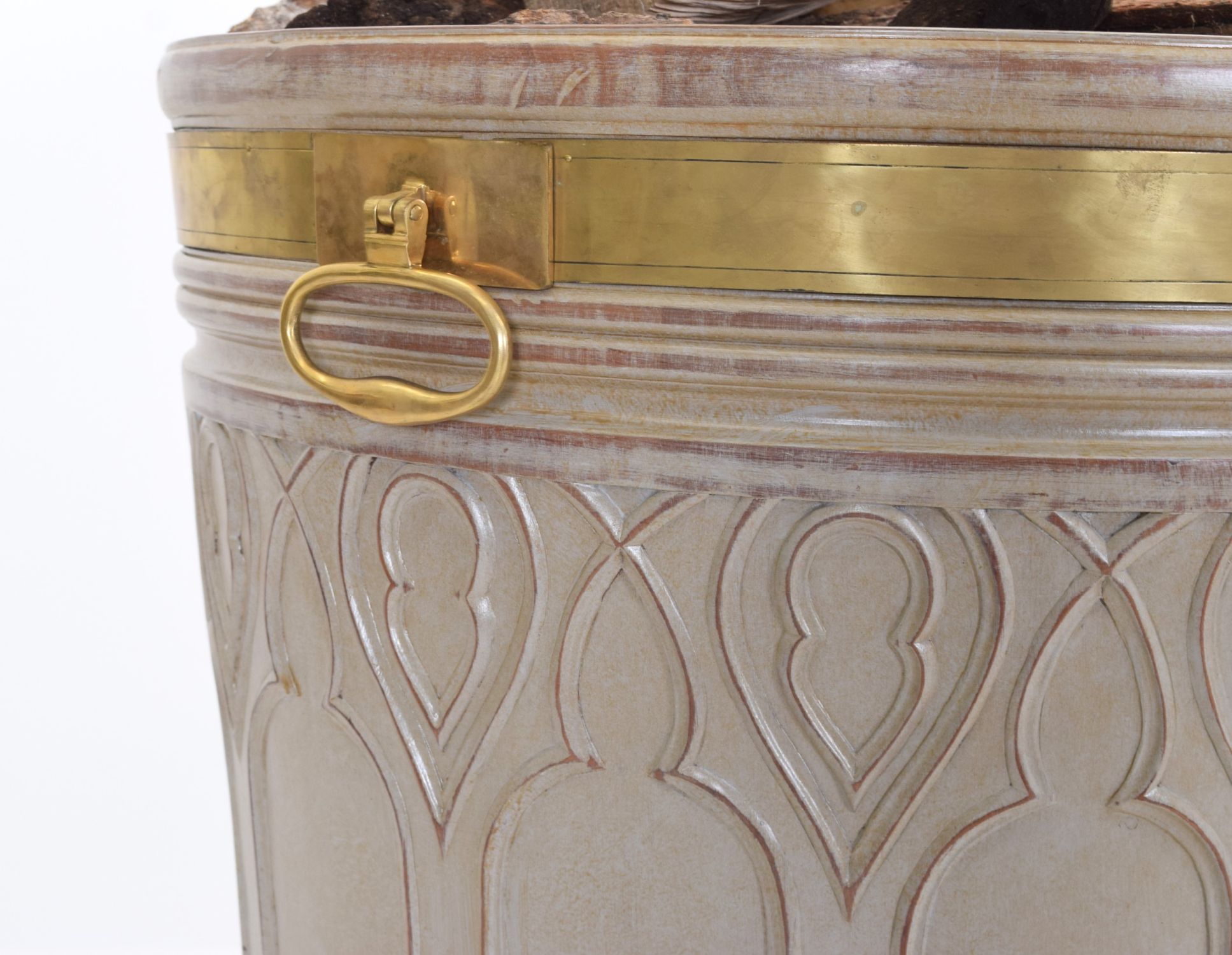 A monumental Gothic-style painted peat barrel, cylindrical with lancet arch mouldings to the body, fitted with brass banding and twin ring handles. Of impressive scale, designed for country house or lodge interiors.
