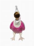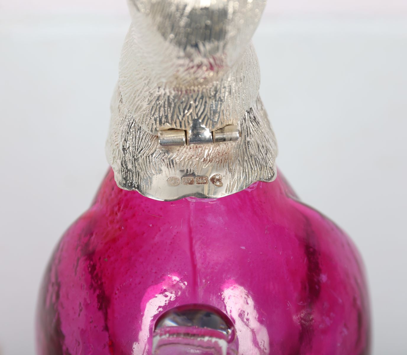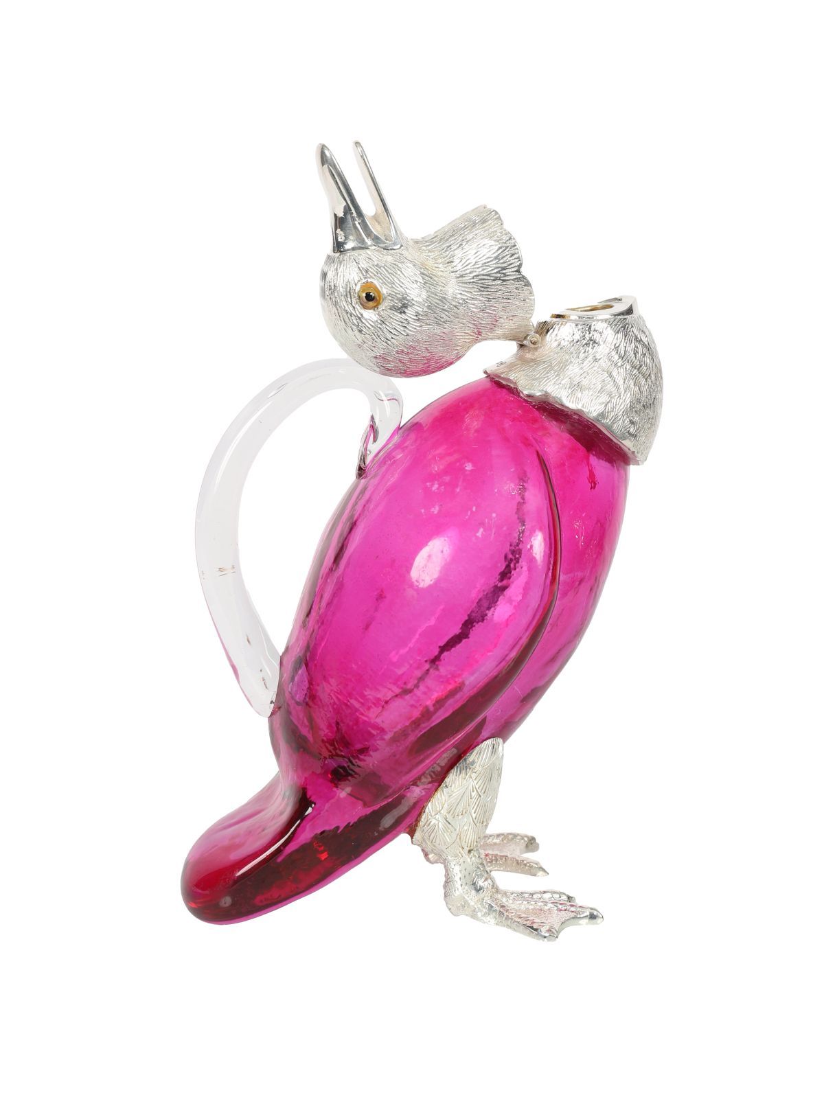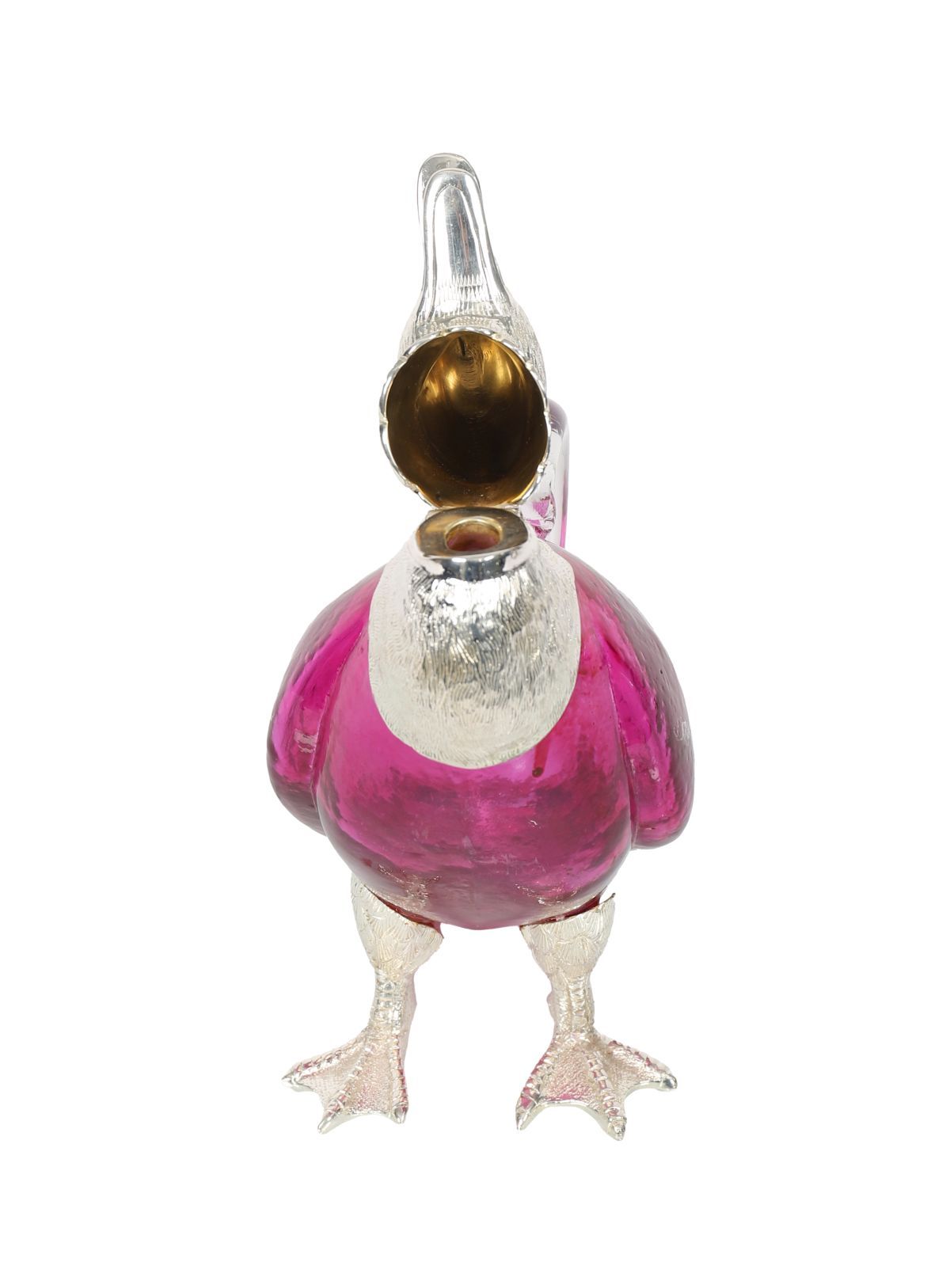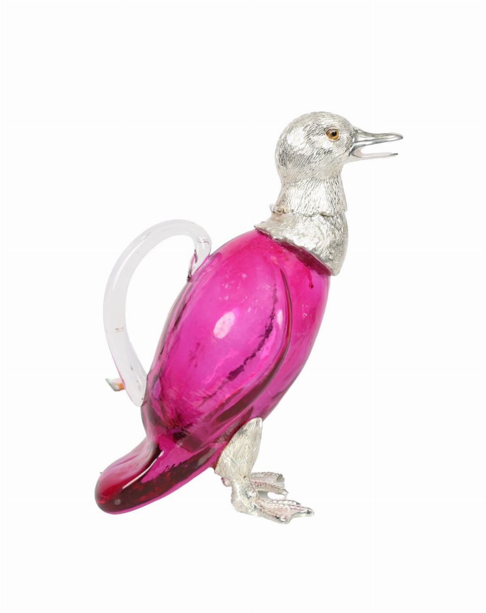A ruby-red Murano glass and silver plate decanter in the form of a duck, with hinged beak stopper, clear glass handle and webbed feet.