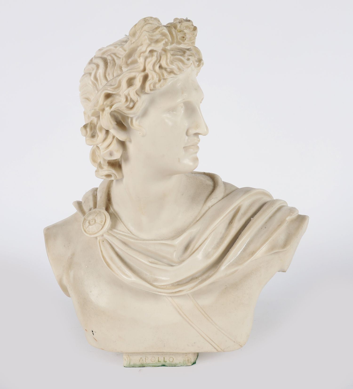 A finely modelled bust of Apollo in classical style, after the antique, crafted from museum-grade composite marble with a naturalistic finish. The bust features detailed curled hair, draped robes, and a serene expression.