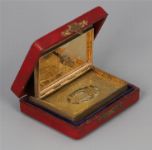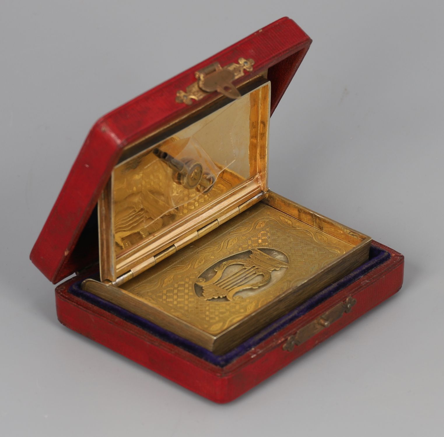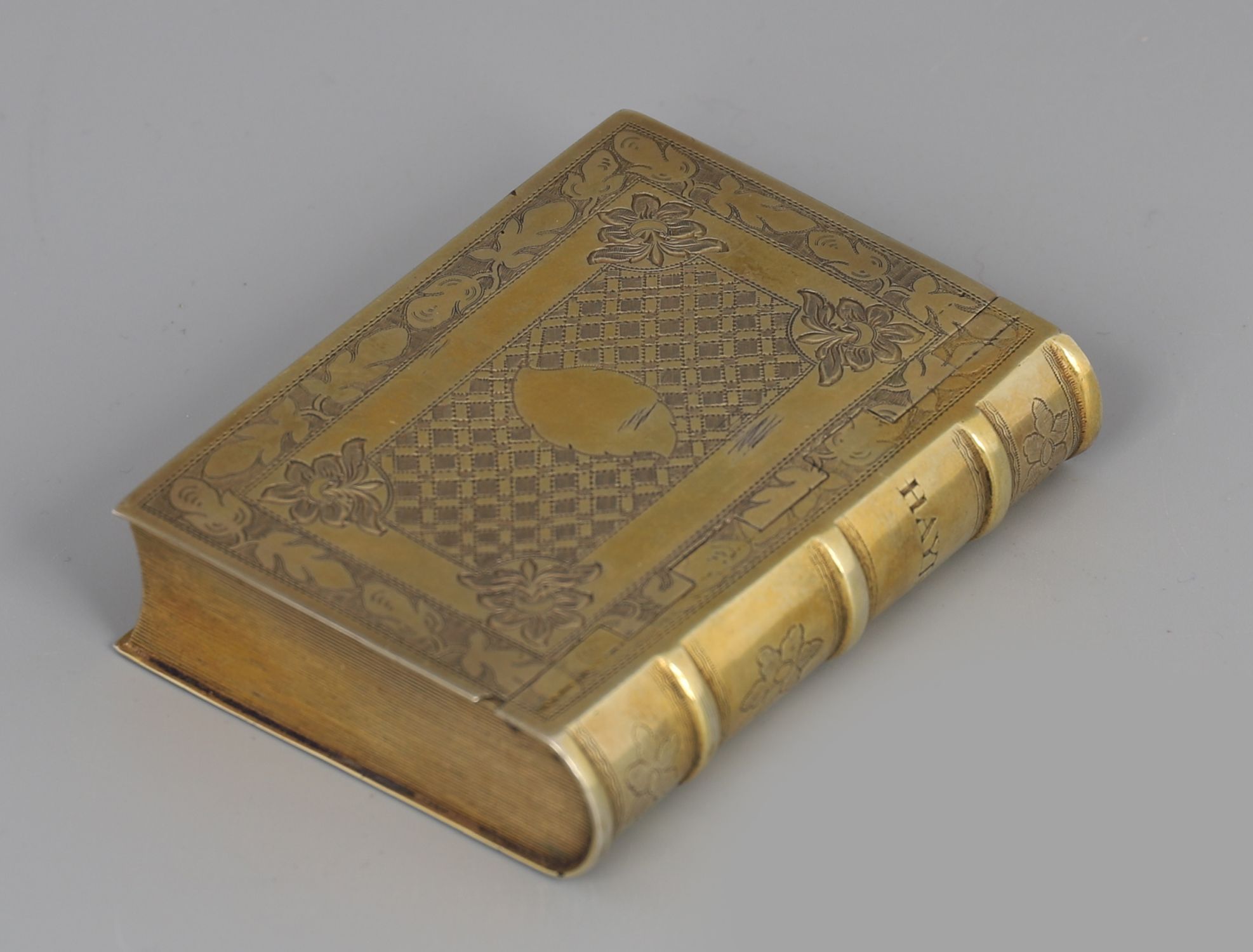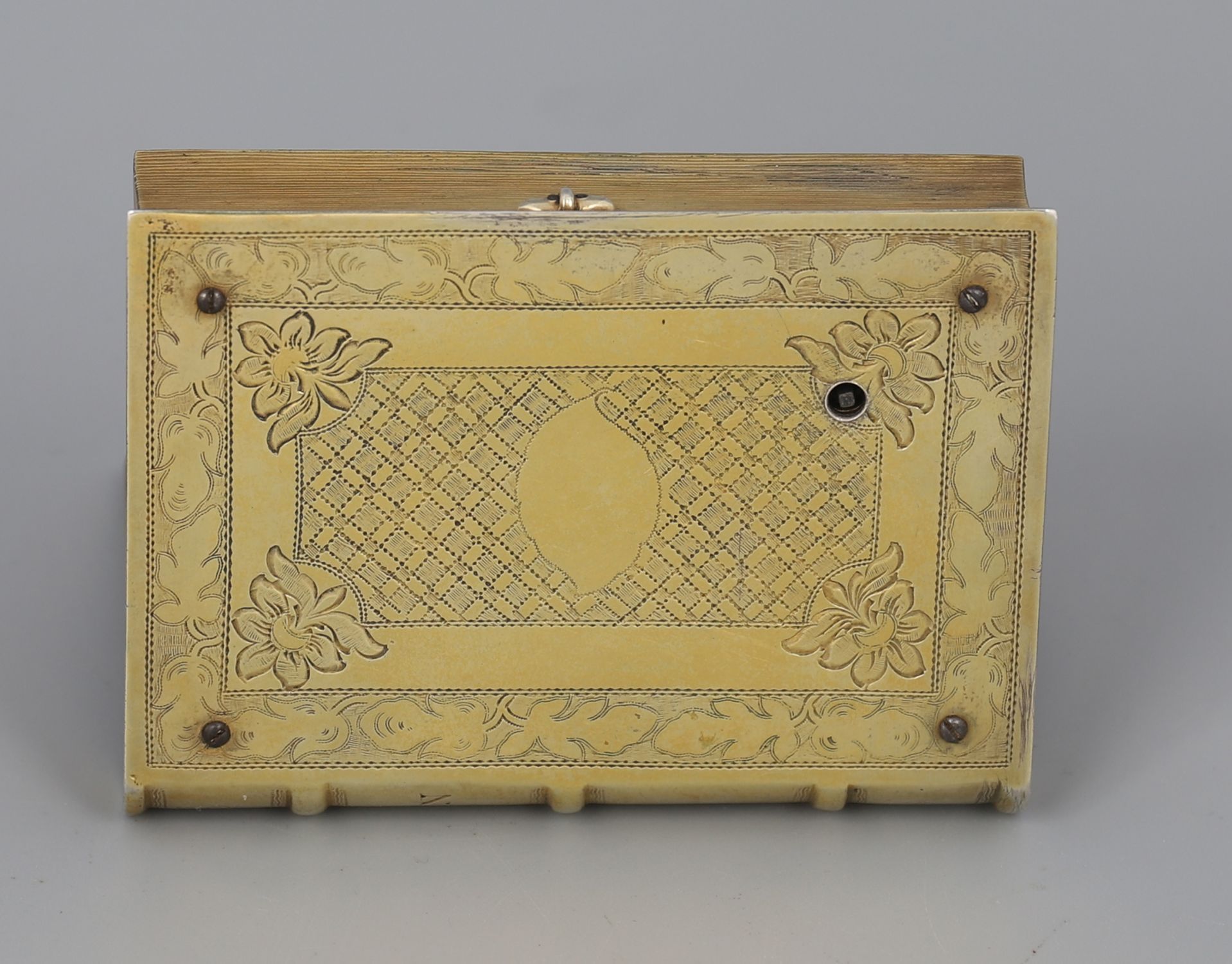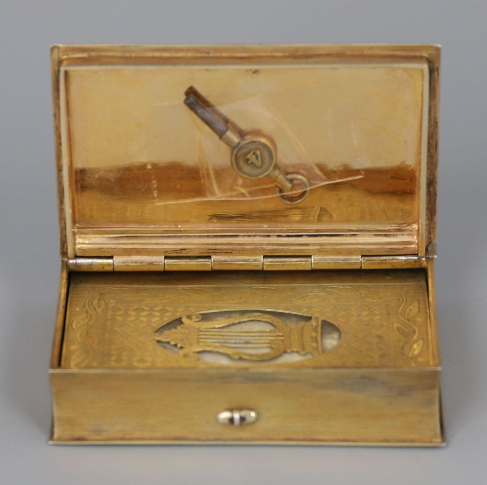 A 19th century gilt-metal music box, cased in the form of a book, the covers engraved with foliate and lattice decoration. Retaining original velvet-lined fitted case.