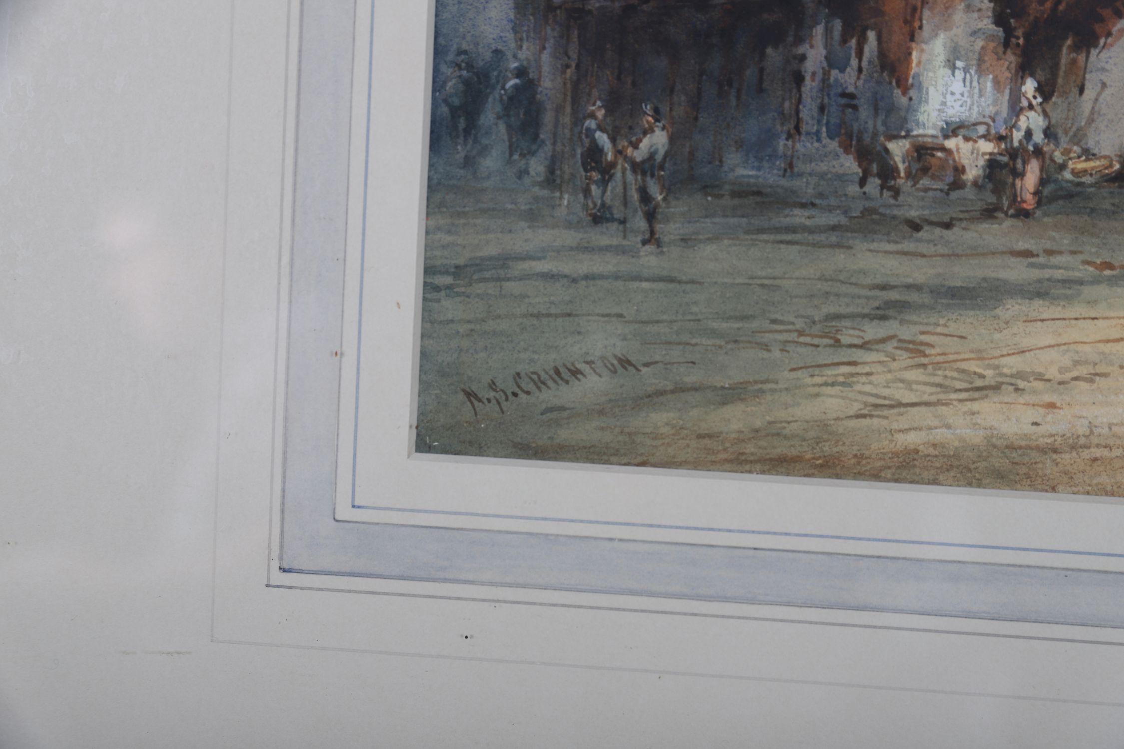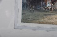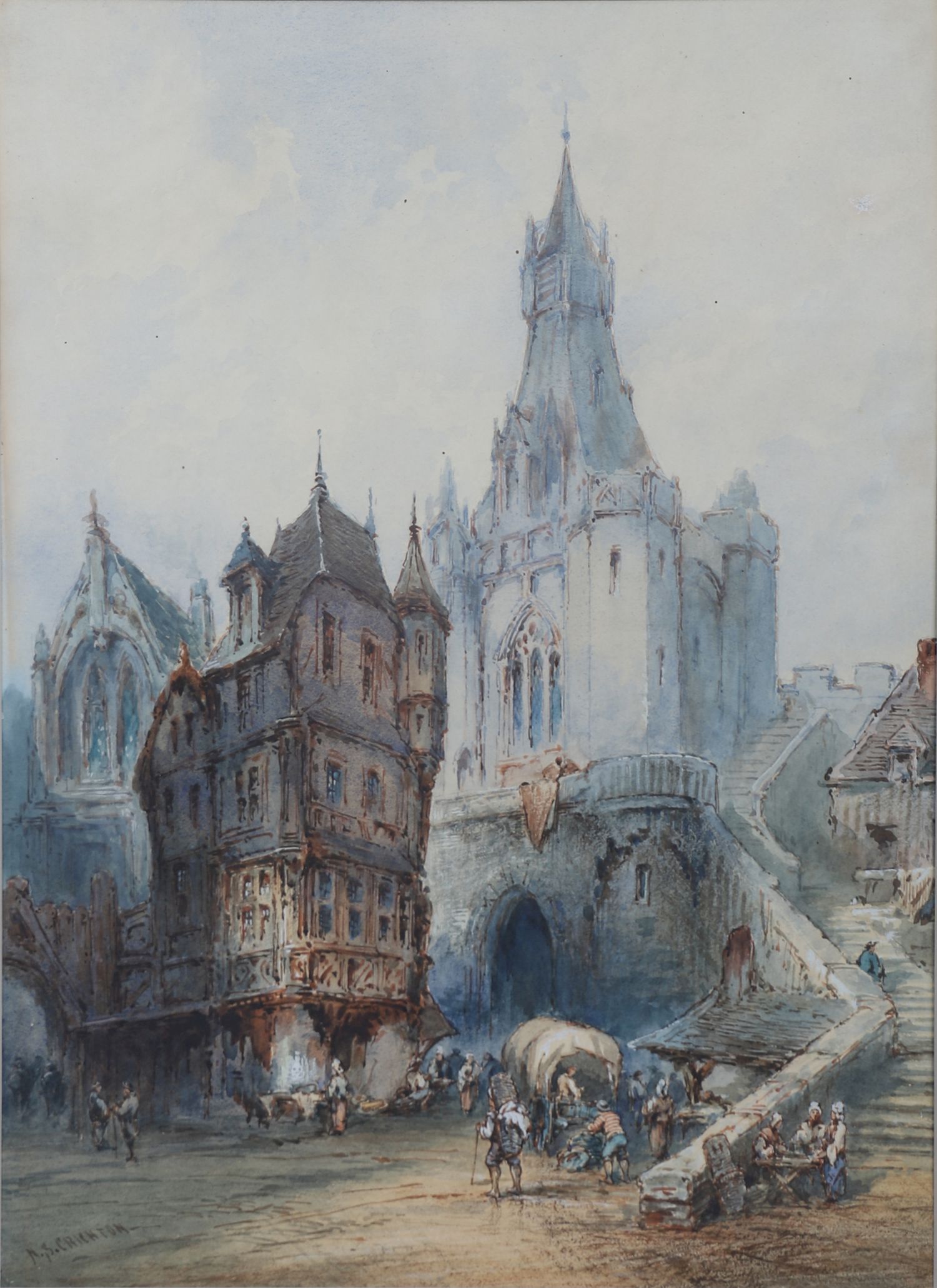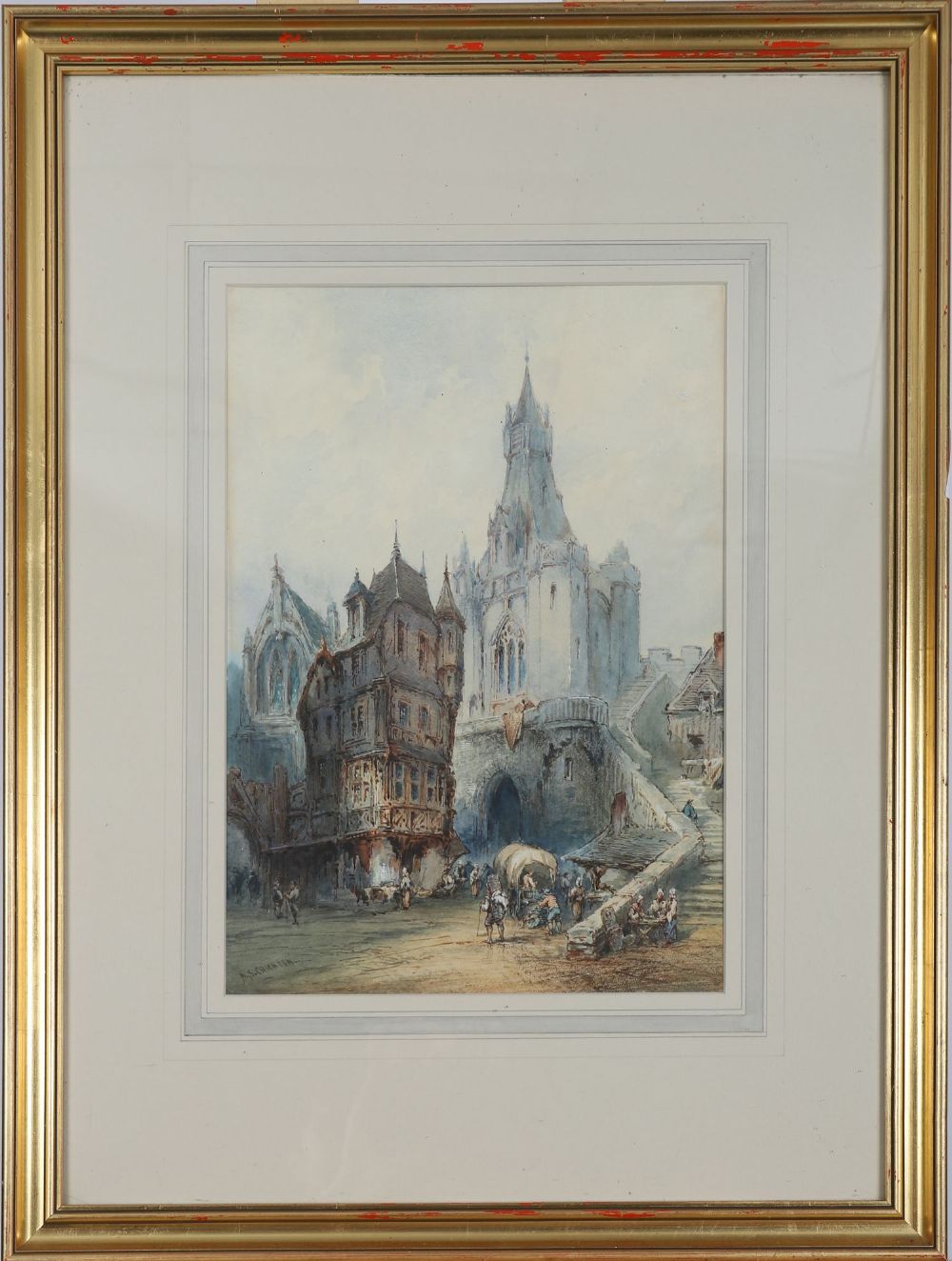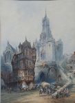 A watercolour depicting a bustling medieval square with half-timbered buildings and a grand Gothic cathedral beyond. Figures and horses populate the foreground. Gilt frame. Signed watercolour.