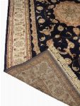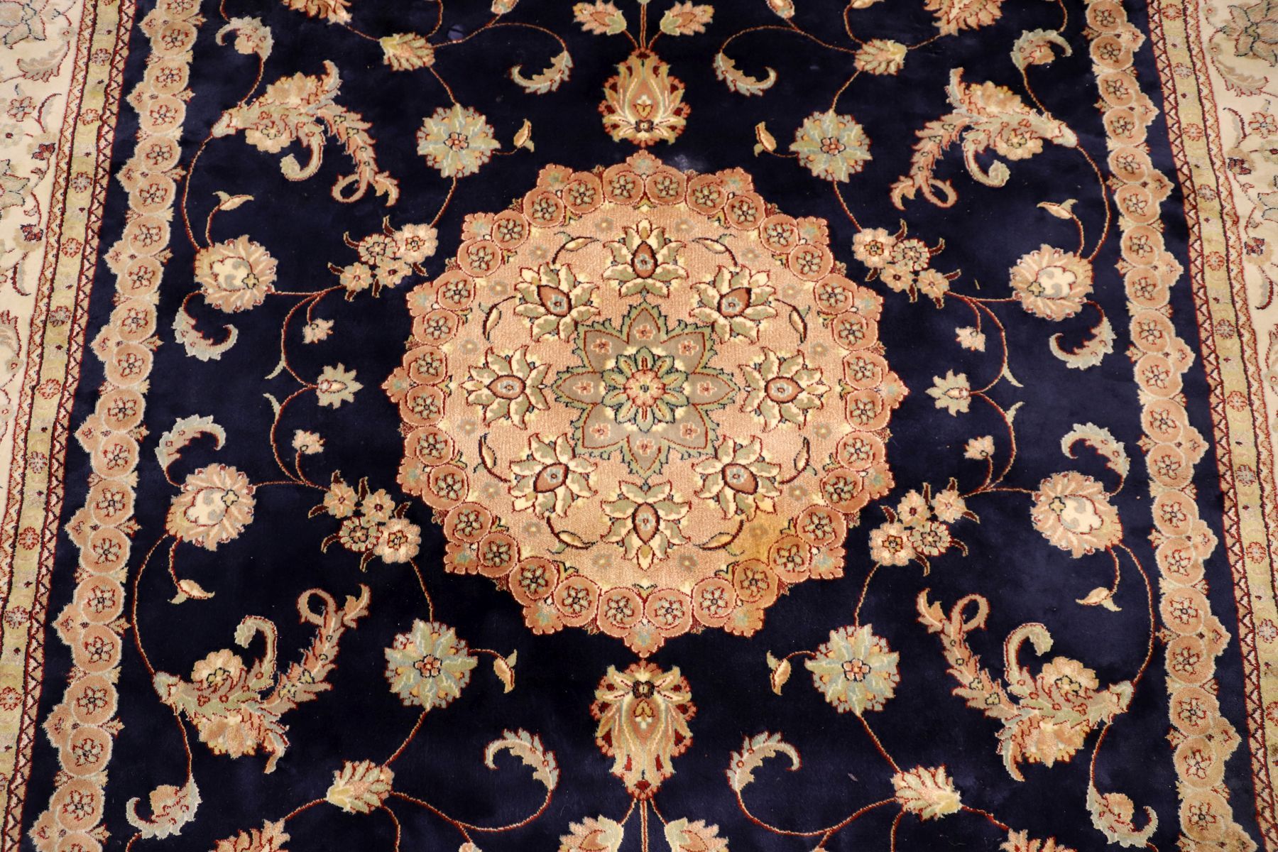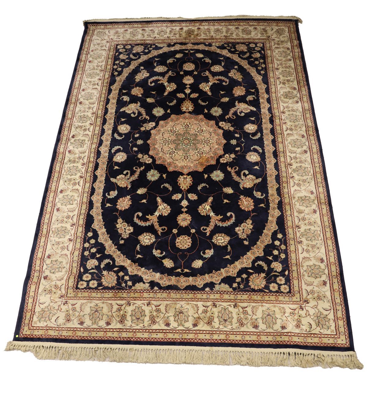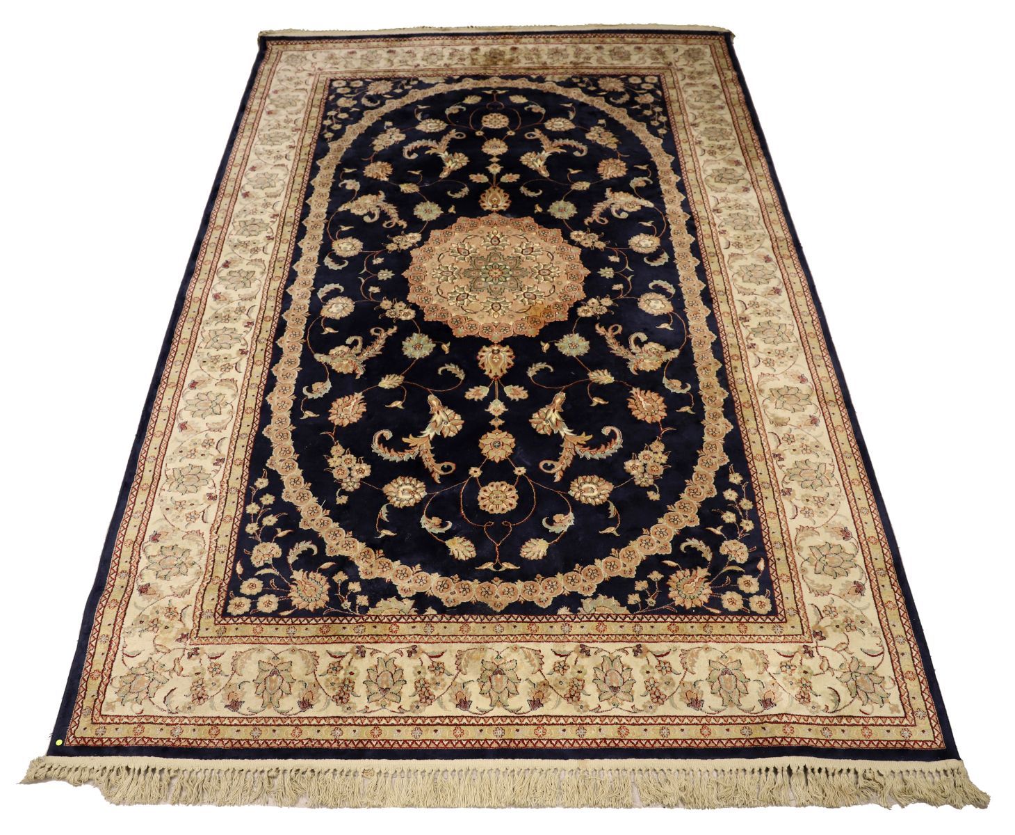 A Persian-style carpet, the dark blue field centred with a floral medallion and filled with scrolling floral and foliate motifs, within a wide cream ground border decorated with further floral ornamentation, framed by multiple guard borders. Finished with fringed ends.