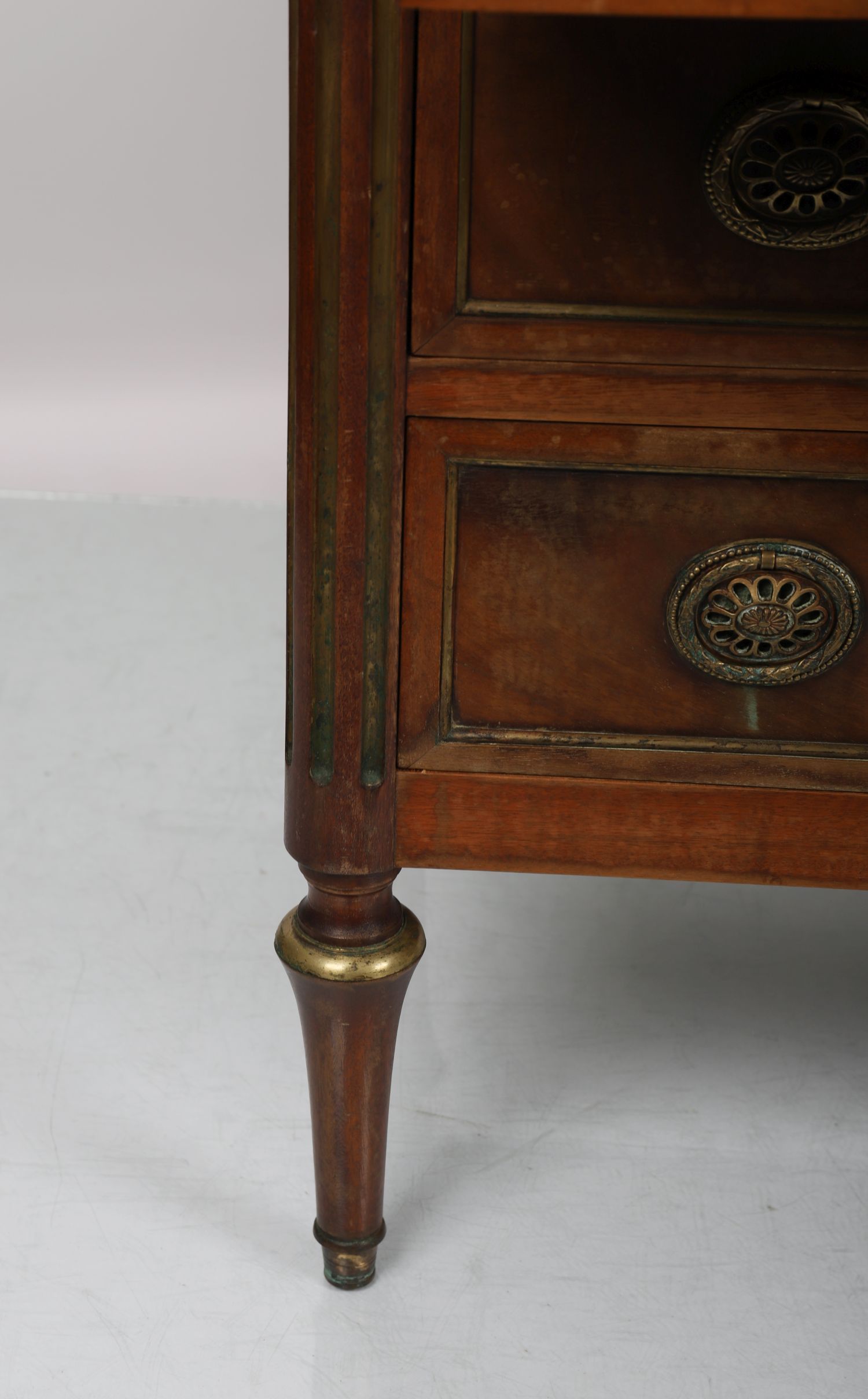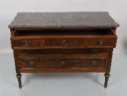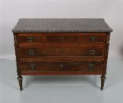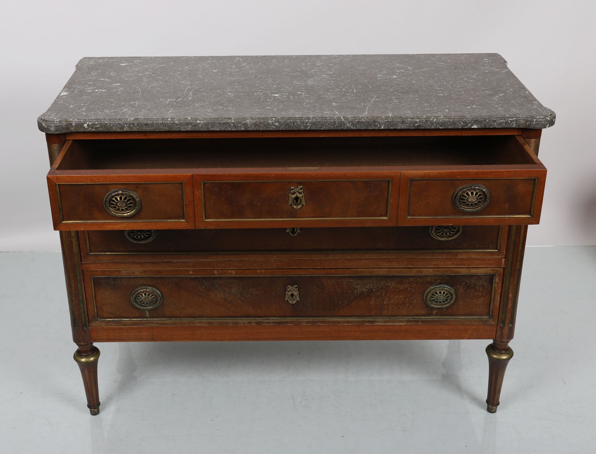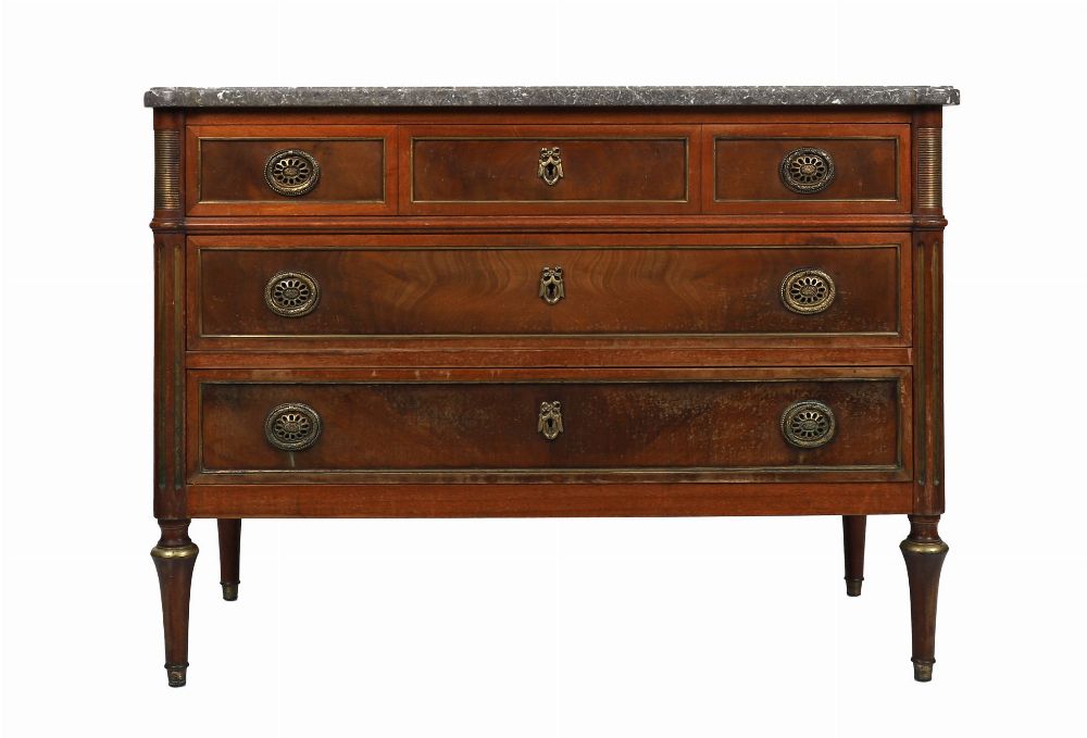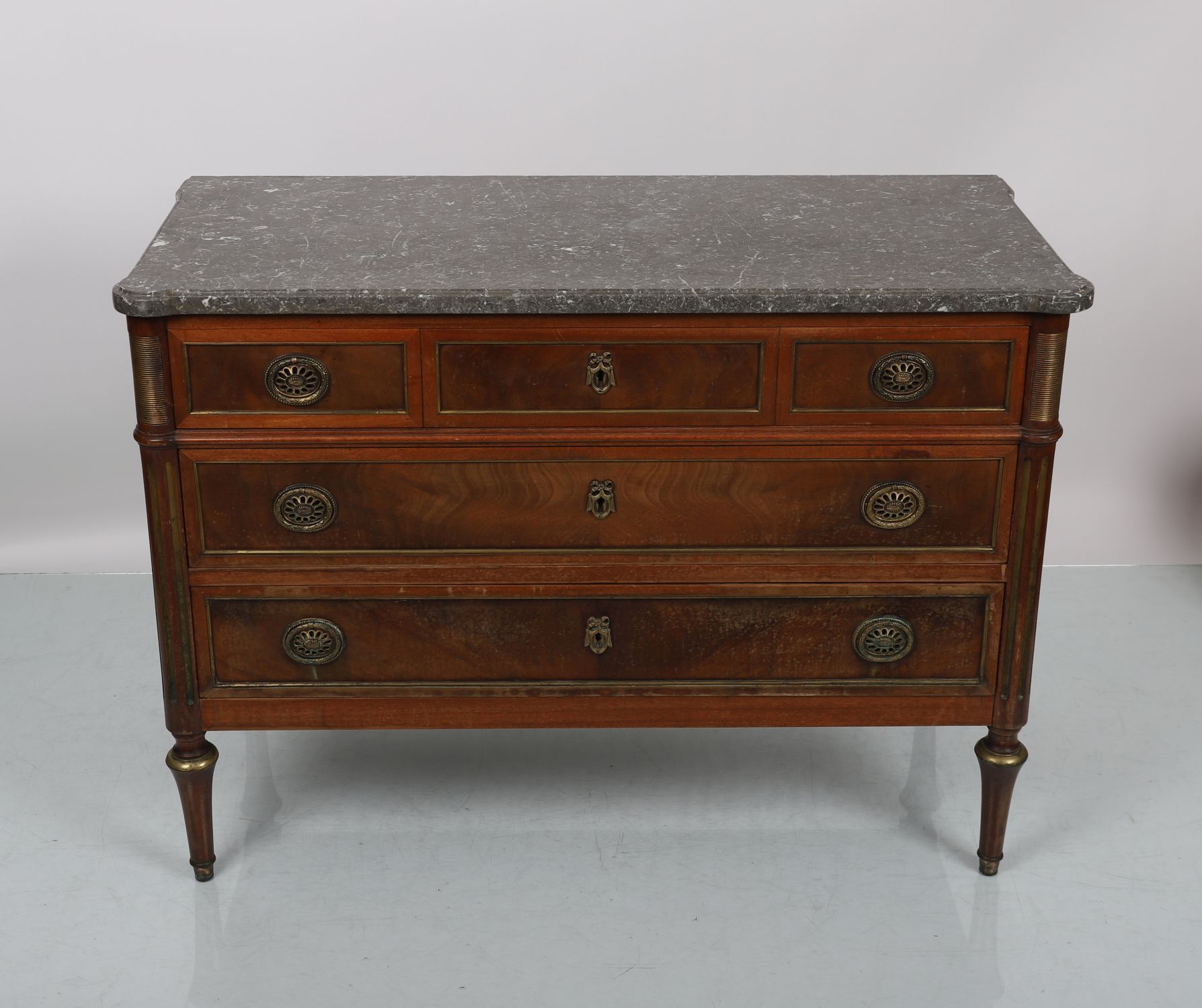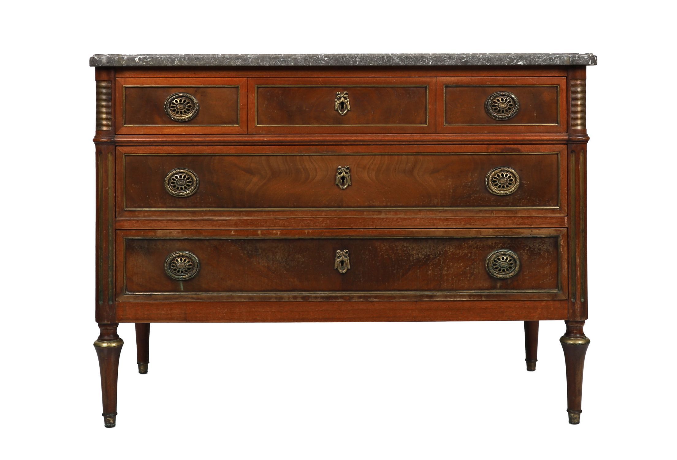 A fine French Napoleon III period mahogany commode, the rectangular top with grey marble inset above 3 short and 2 long drawers, each with inset brass stringing and fitted with decorative brass escutcheons and drop handles. The front stiles with reeded brass mounts, the carcass edged with brass mouldings, and raised on turned tapering legs with brass caps. Retains a warm, well-patinated surface