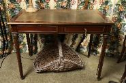 With leather-inset top above a frieze drawer, raised on turned and tapering legs.