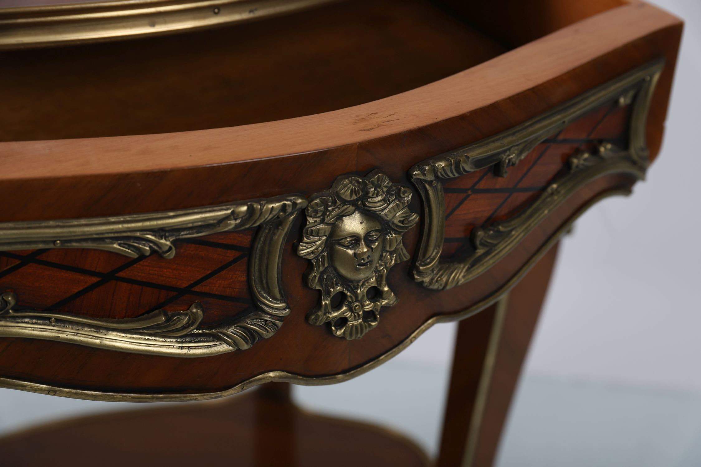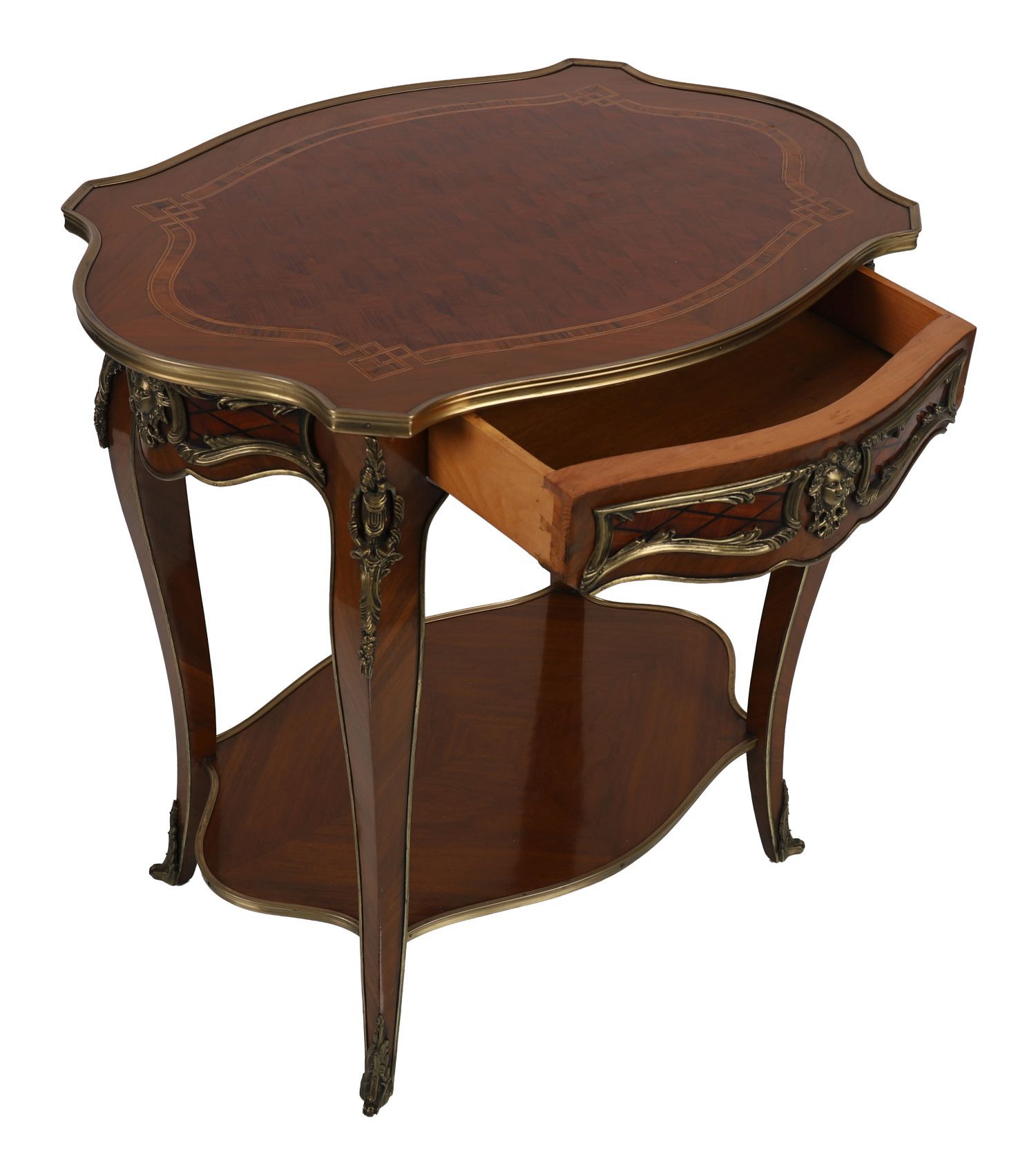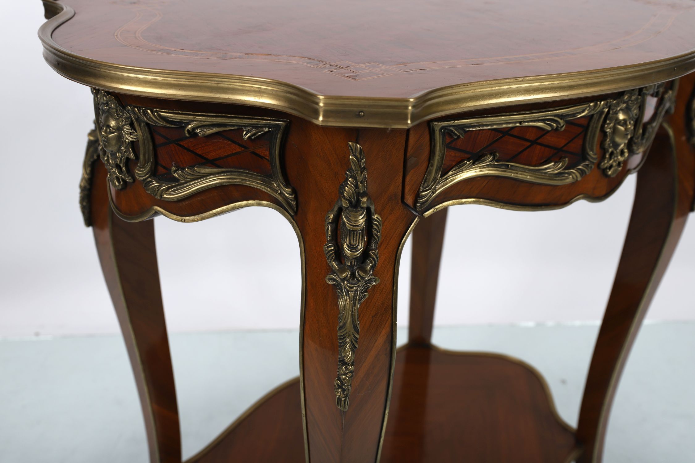 A shaped kingwood centre table in the Napoleon III style, with parquetry top, gilt-bronze mounts, and cabriole legs terminating in ormolu sabots.