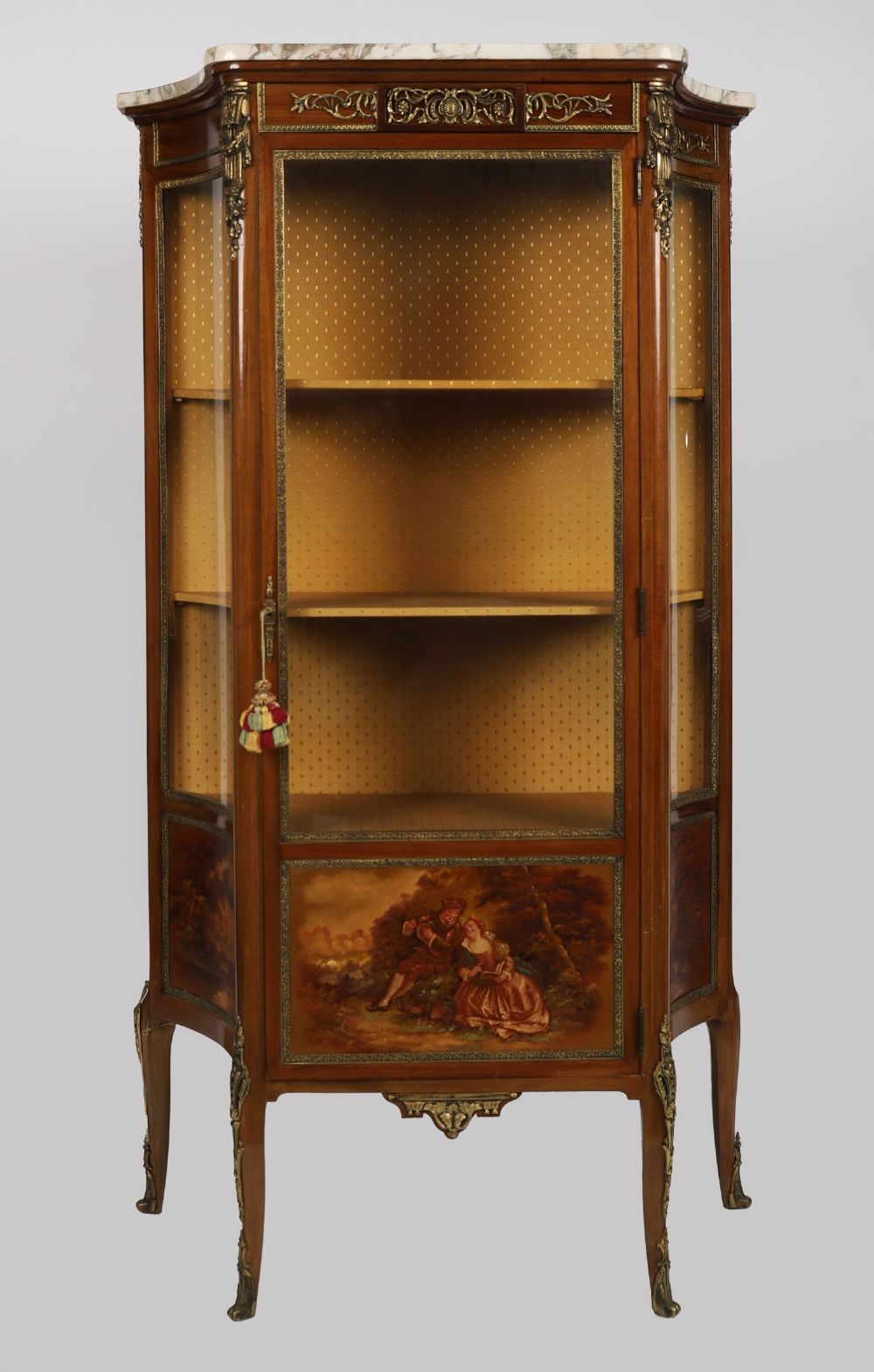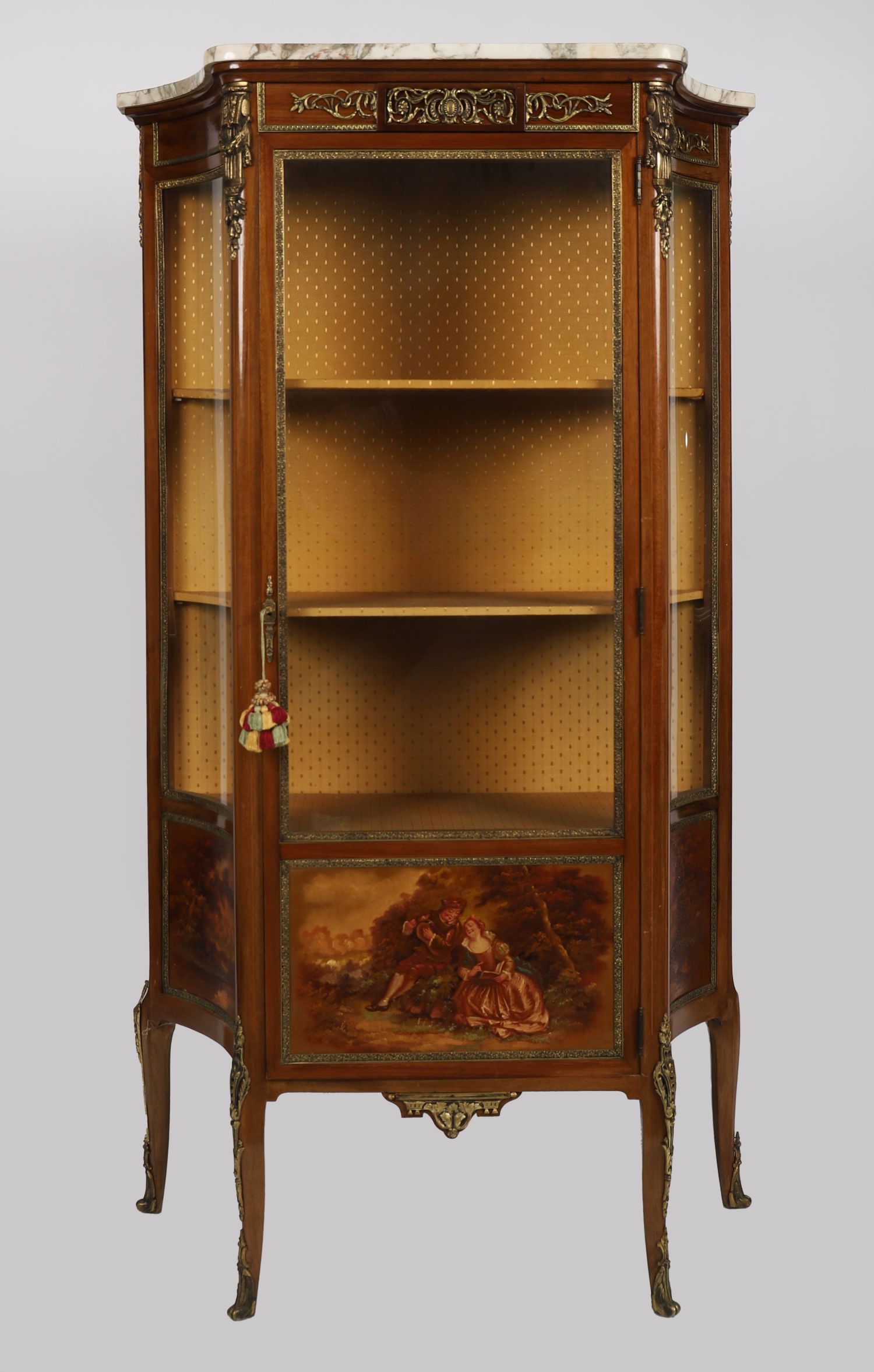 A fine 19th century Napoleon III vitrine, with painted Vernis Martin panels depicting a romantic pastoral scene, mounted with gilt-bronze and surmounted by a marble top. The glazed cabinet is fitted with lined shelves, designed for displaying precious objects.