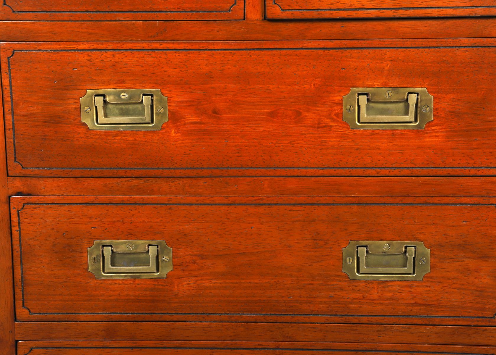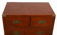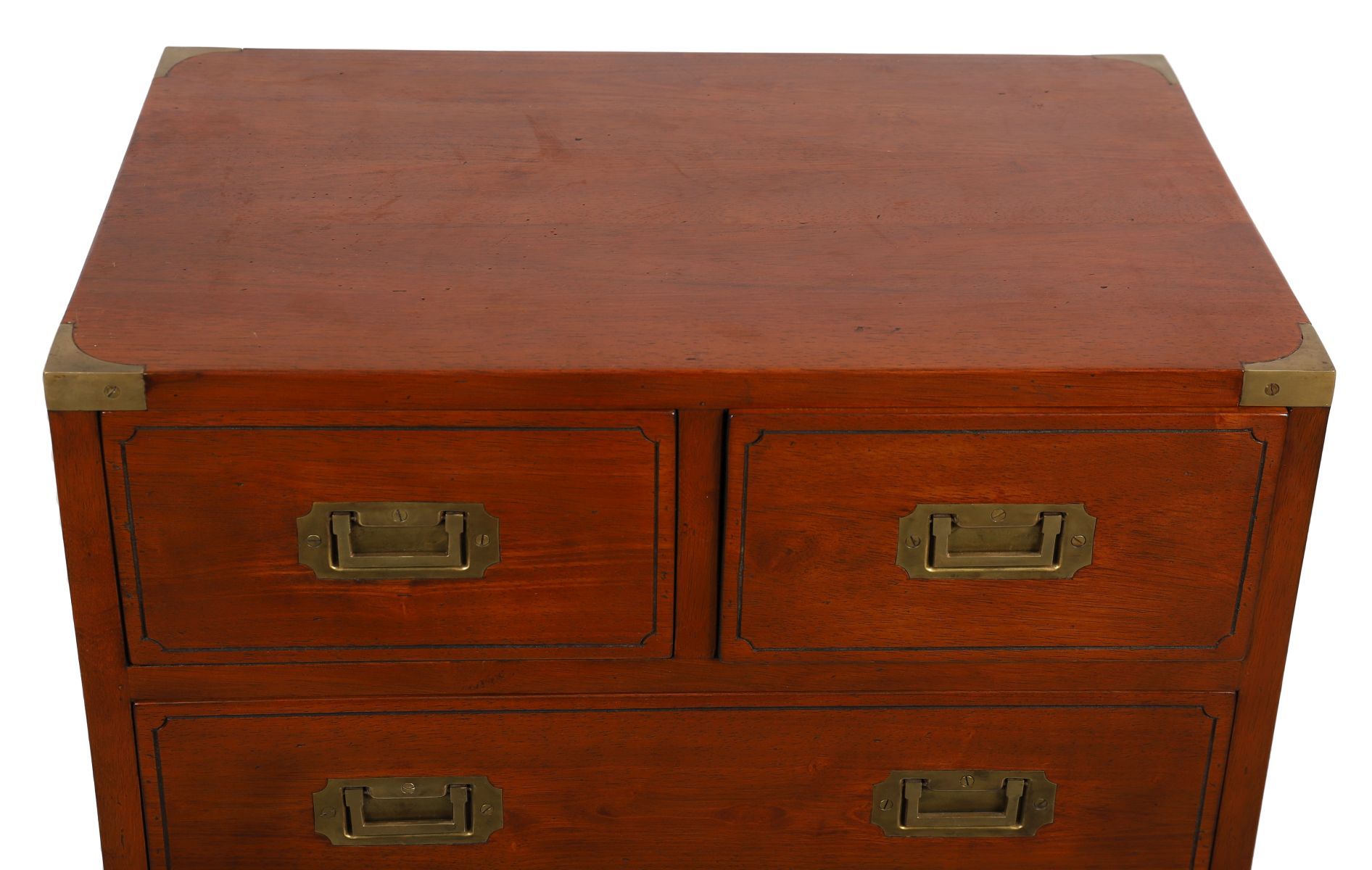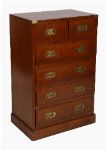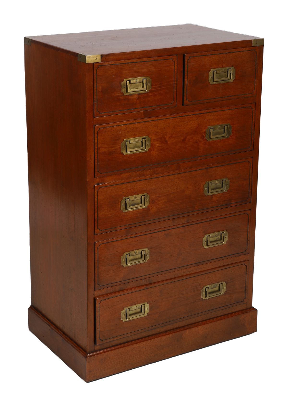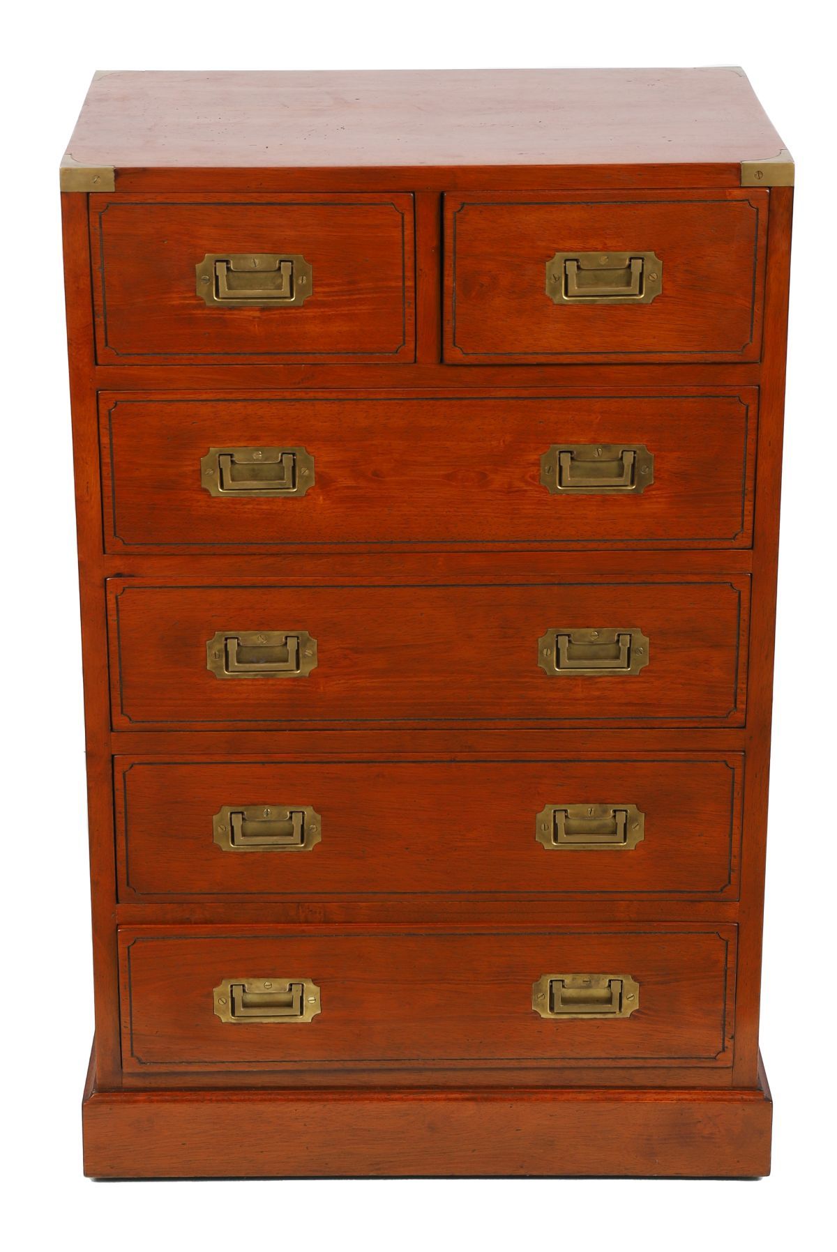 A narrow campaign-style six-drawer chest, the rectangular top above graduated drawers fitted with recessed brass handles and corner mounts.