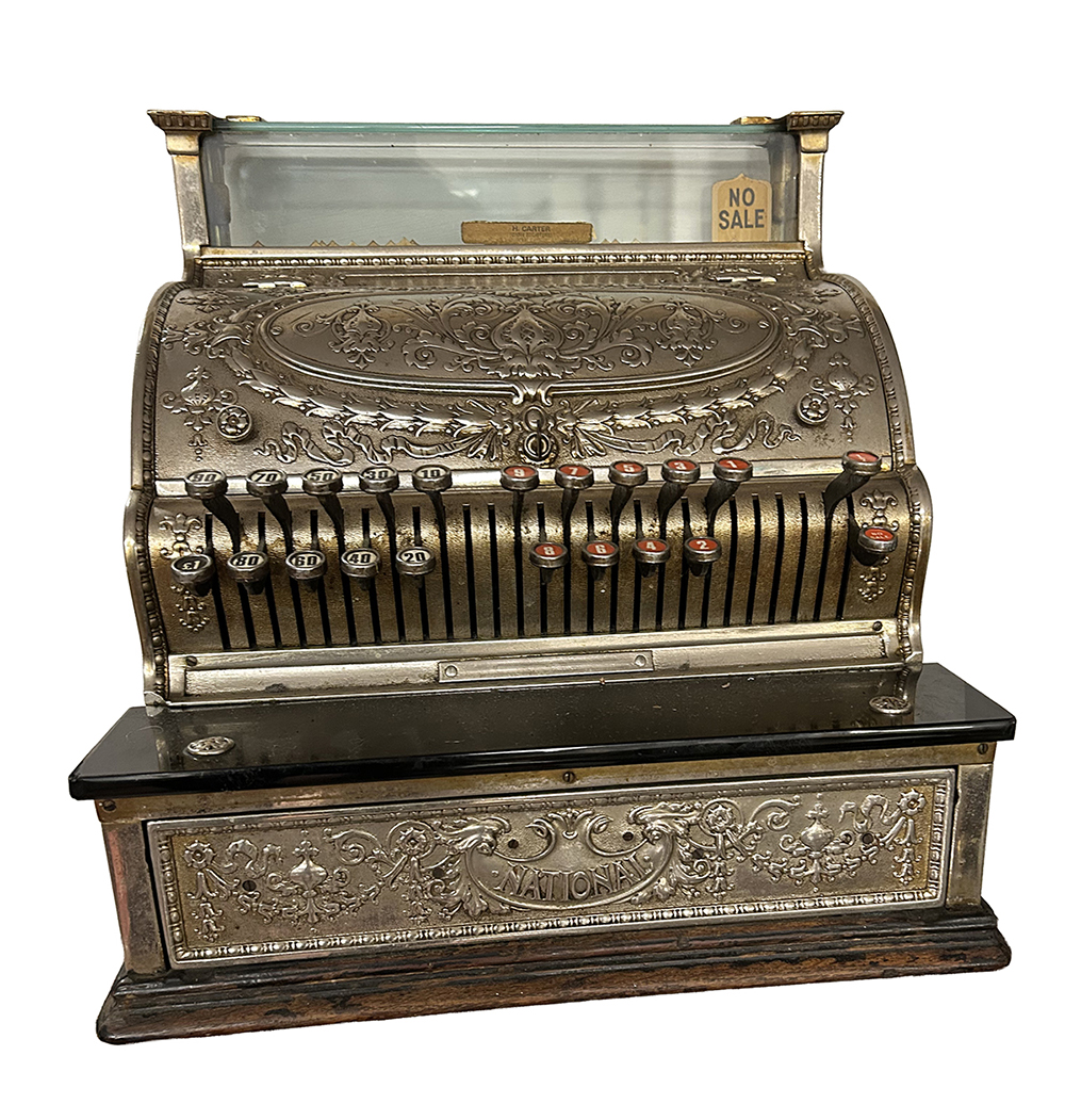 A fine early 20th-century National Cash Register (NCR), Model 313, with richly embossed nickel-plated brass casing featuring scrolling acanthus, foliate motifs, and cartouches typical of the company’s ornate “Art Brass” series. Fitted with original glass price indicator and complete key set with enamelled denomination caps. Mounted on a polished wooden base with matching nickel-plated front panel cast NATIONAL. Retains internal drawer and operating mechanism.