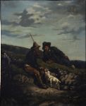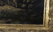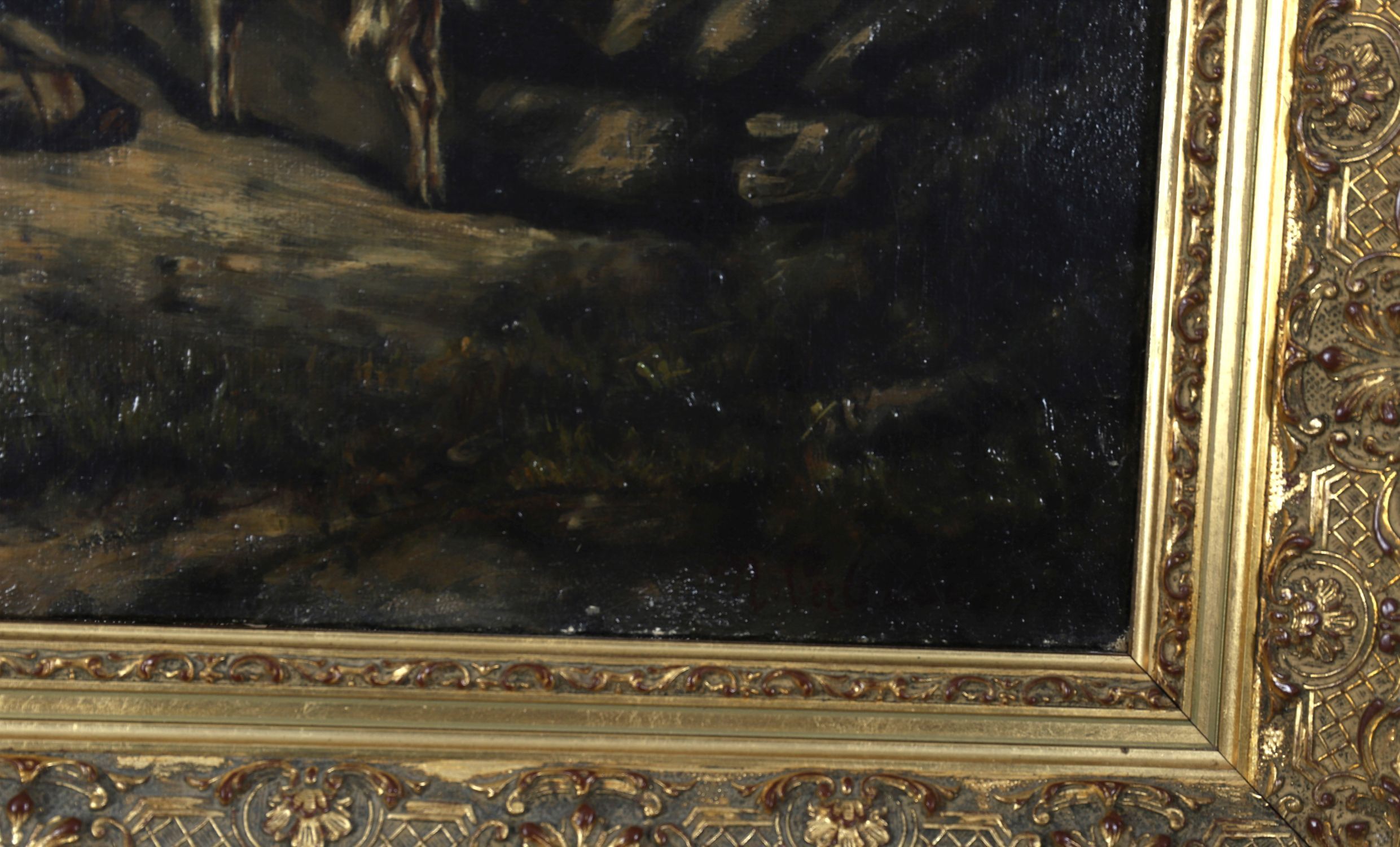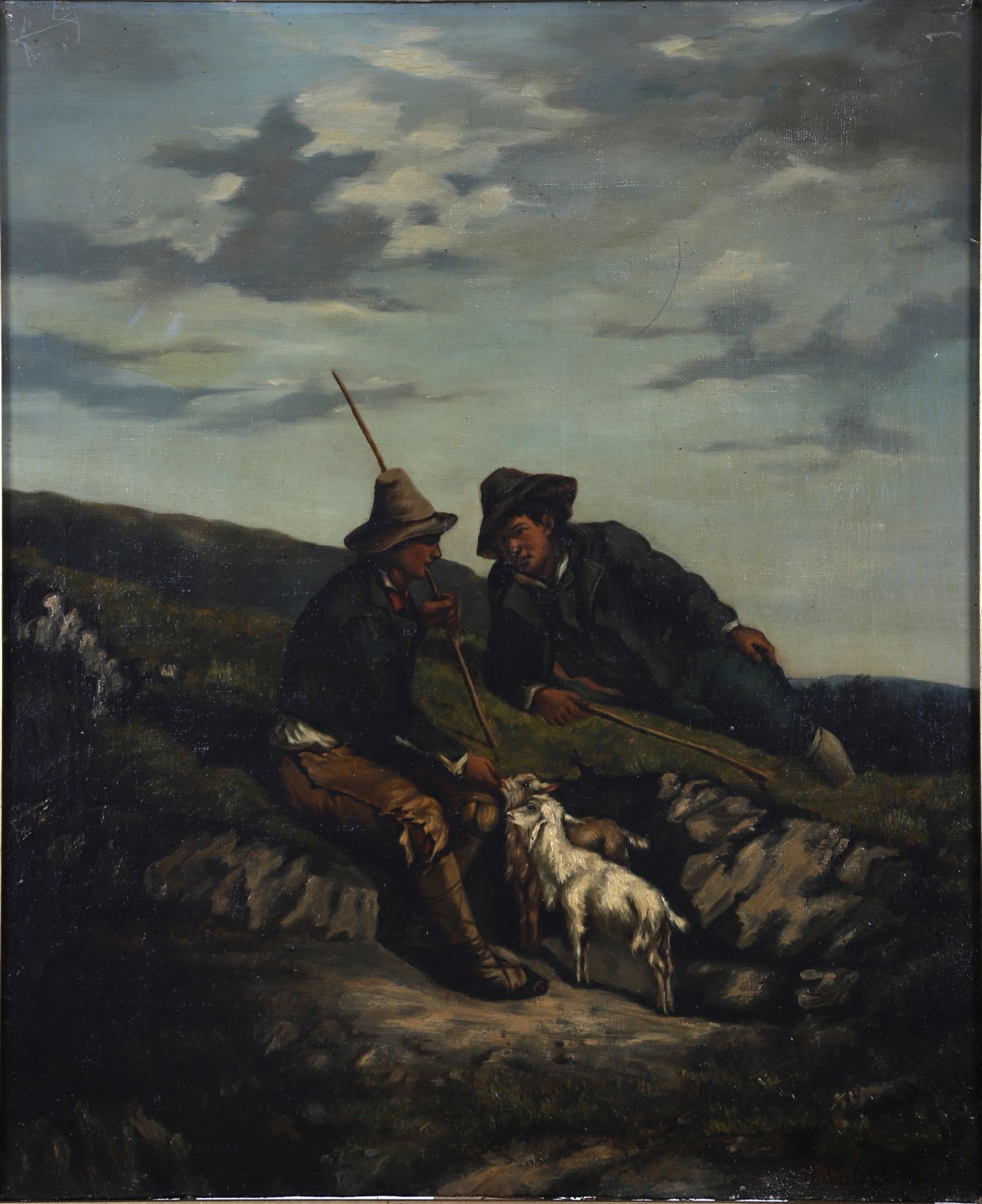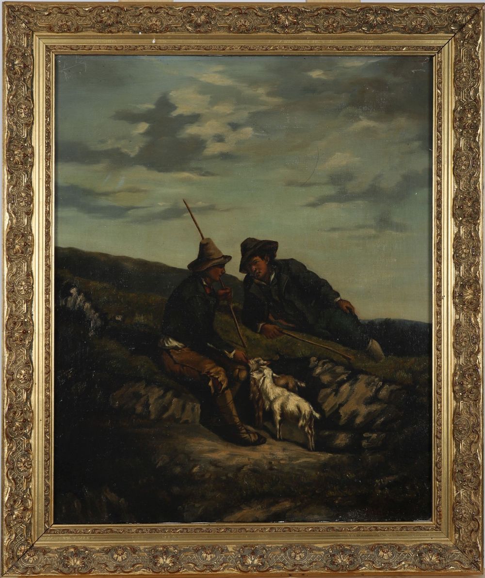 Oil on canvas, depicting two shepherds resting on a hillside with goats beside them. Strong naturalistic detail. Set in an ornate gilt frame. Signed oil on canvas.
