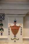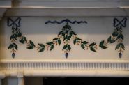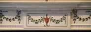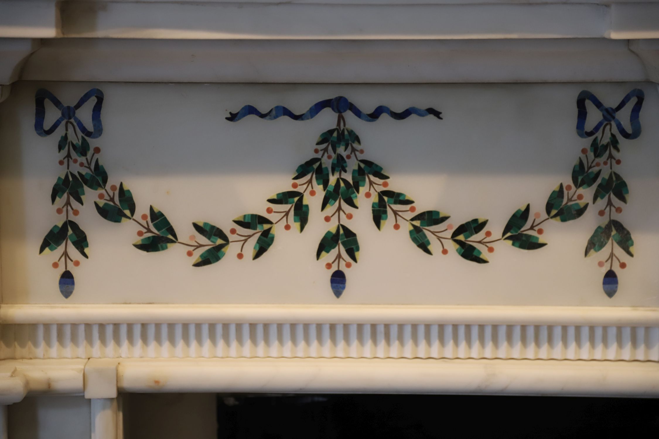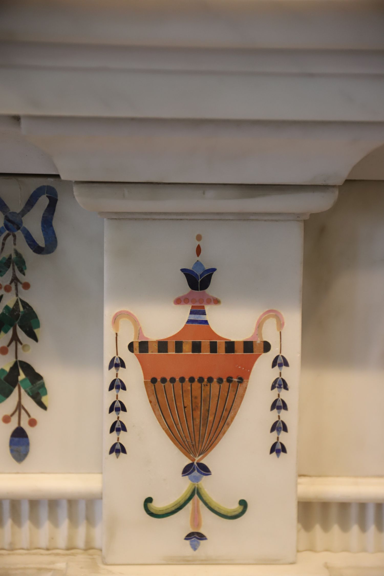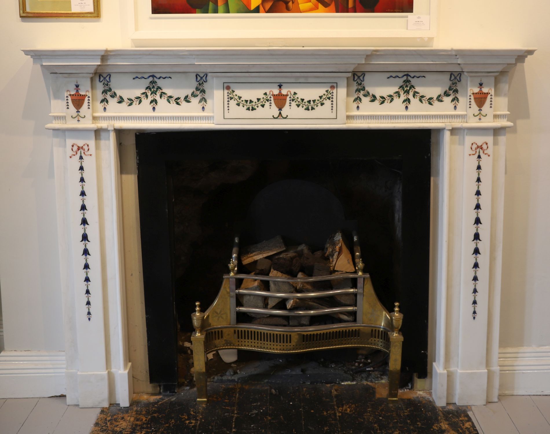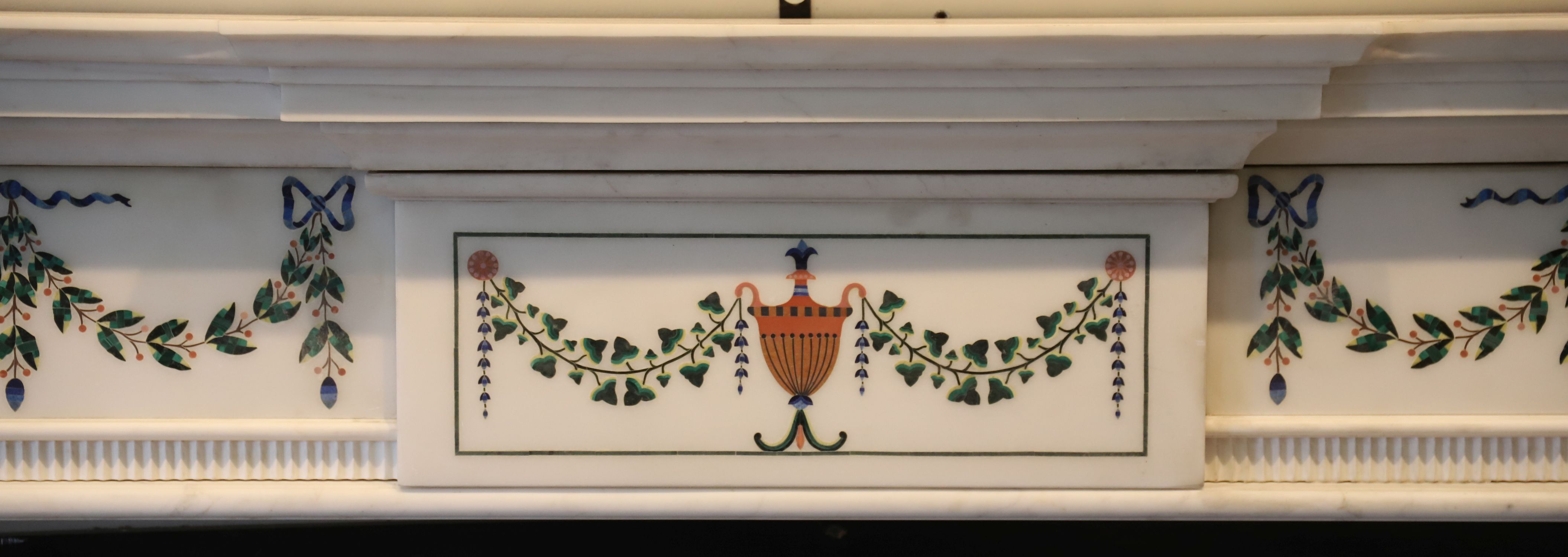 A neoclassical white marble chimneypiece, the frieze with central rectangular inset panel decorated in polychrome with a classical urn issuing floral festoons, flanked on either side by inset panels of painted swags and ribbons, the design continuing along the jambs. The shelf with moulded edge above.